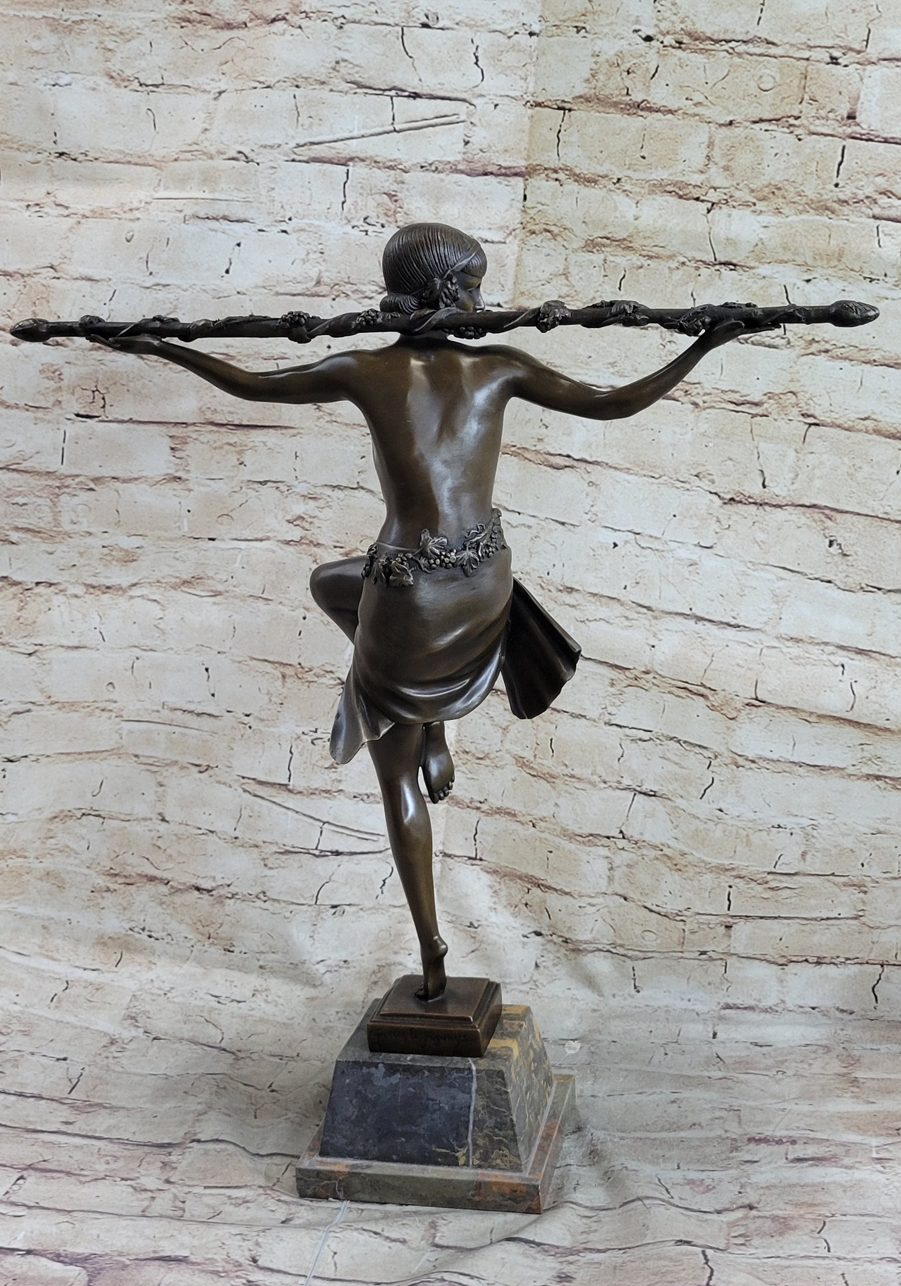 Presenting an exquisite Art Deco bronze sculpture that embodies the elegance and grace of the Art Deco era. This stunning piece, titled "Stick Dancer," is a true miracle in bronze, meticulously crafted to perfection. The dancer, with arms wide spread and a graceful stick resting on her neck, captures the essence of movement and beauty, making dreams come alive through art. Created by the renowned artist Pierre le Faguays, this statue showcases the finest details, embodying the aesthetic design and elegance that define the Art Deco movement.
