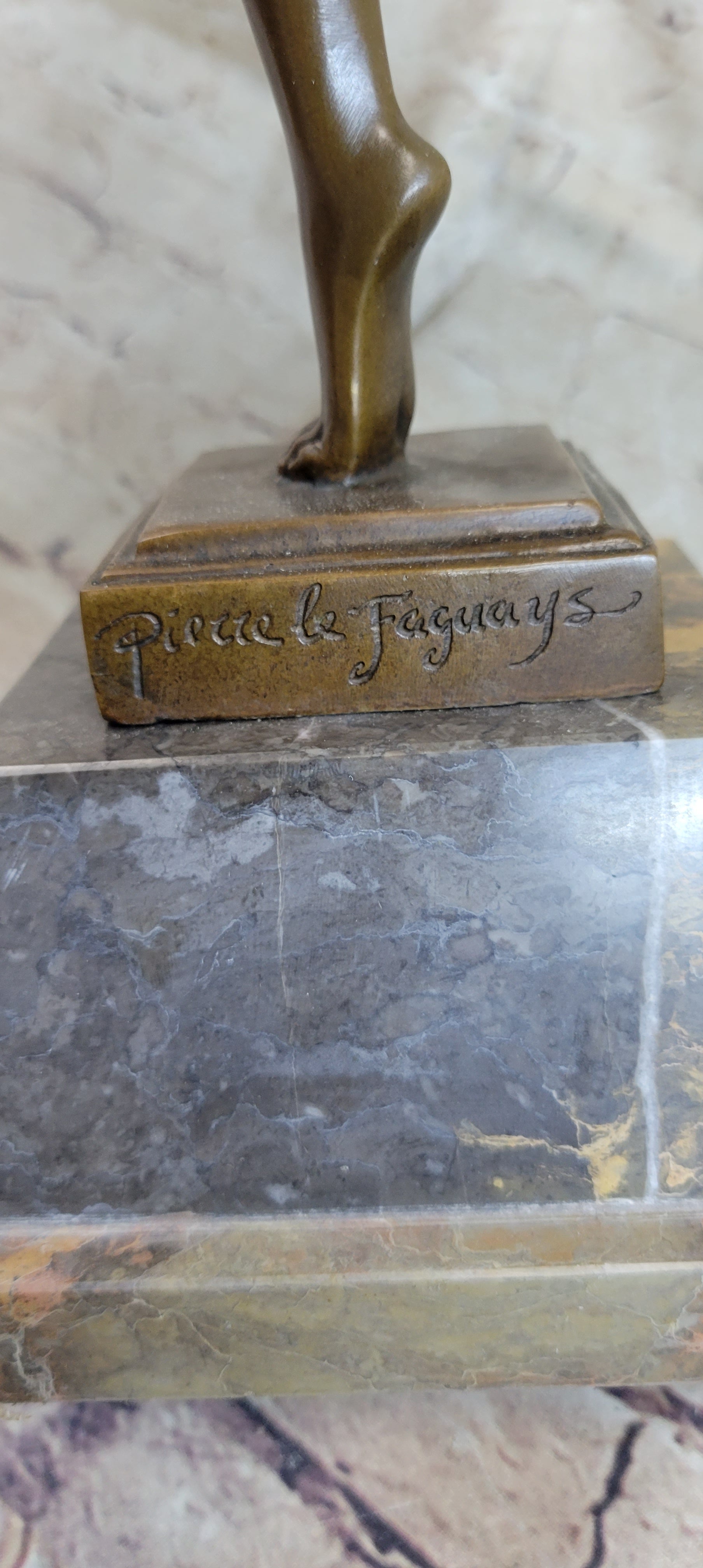 This bronze sculpture is a testament to Pierre le Faguays's mastery of form and detail. Cast in the finest bronze, it is crafted with a level of precision that mirrors the original work. The sculpture is mounted on a terracotta-colored, pyramid-shaped marble base, which not only enhances its visual appeal but also provides a sturdy and elegant foundation. The filigree detailing of the statue, combined with the rich bronze patina, makes it a true eye-catcher, perfect for any exhibition or private collection. The artist's signature, located on the footprint of the statue, further attests to its authenticity and collectible value.