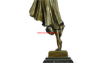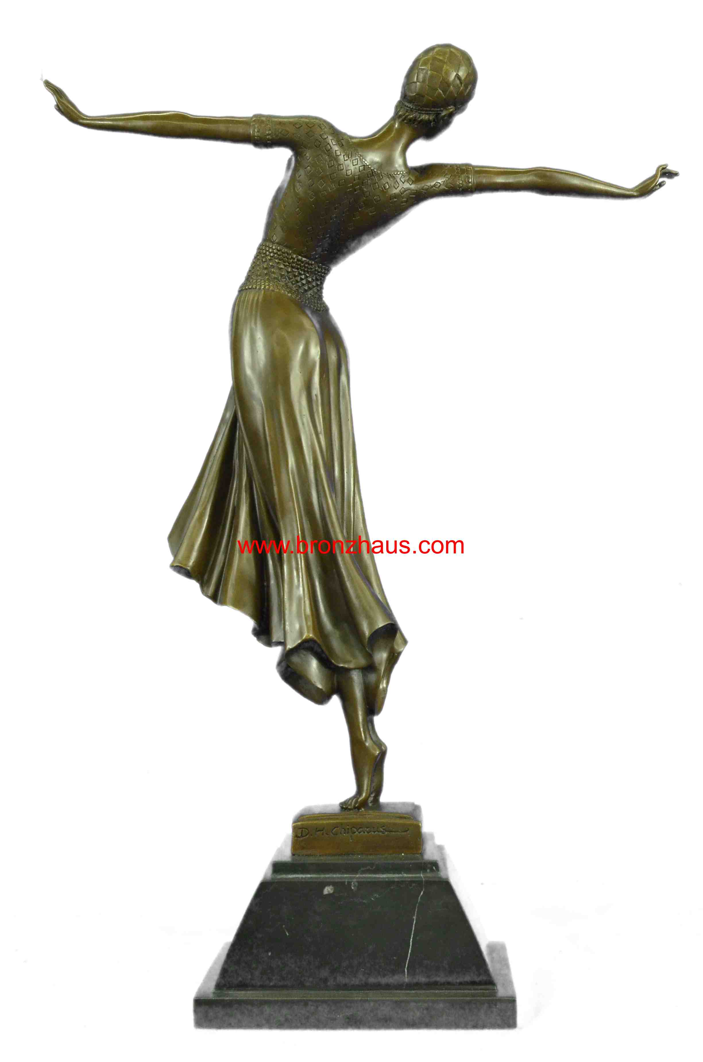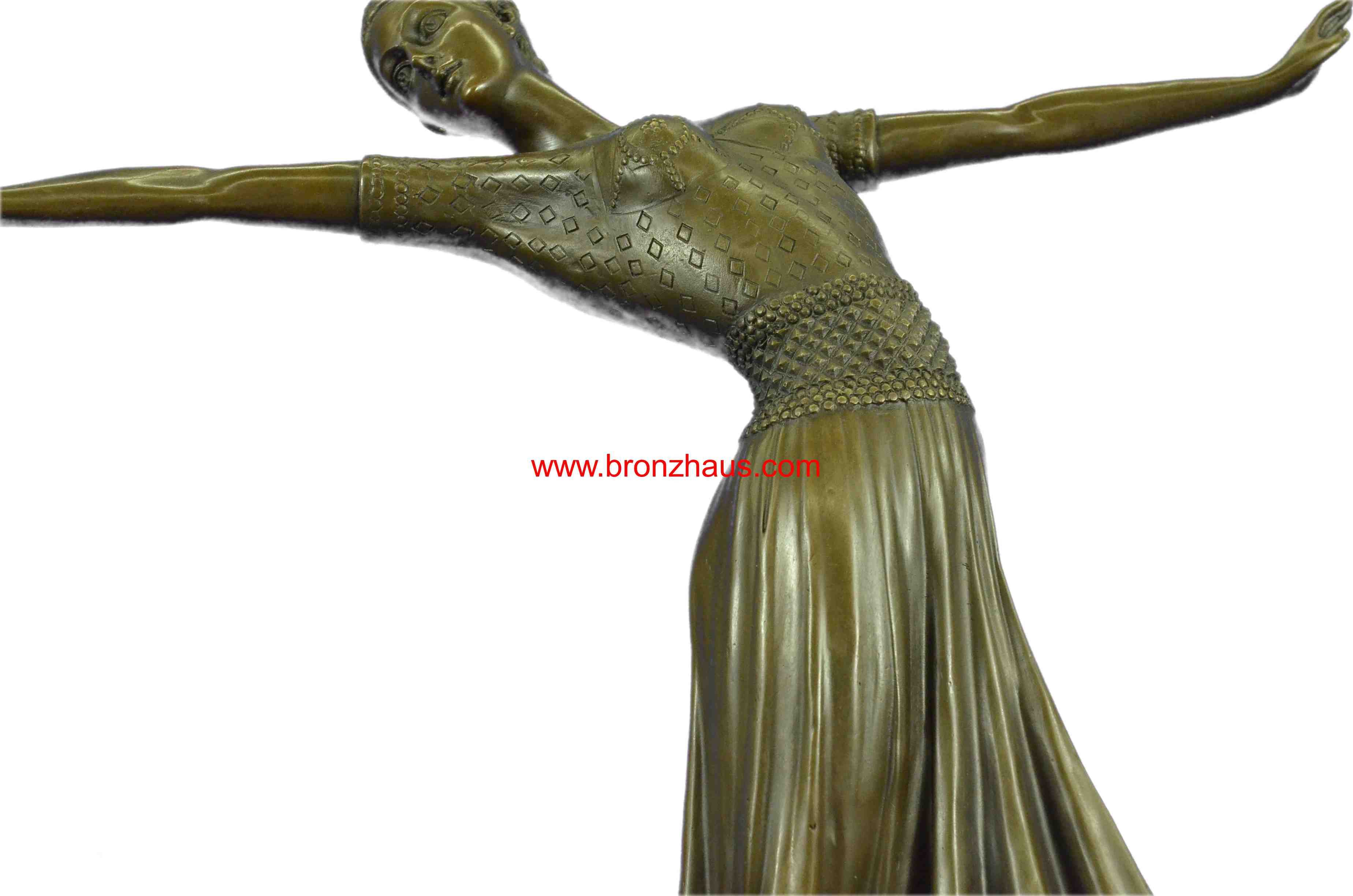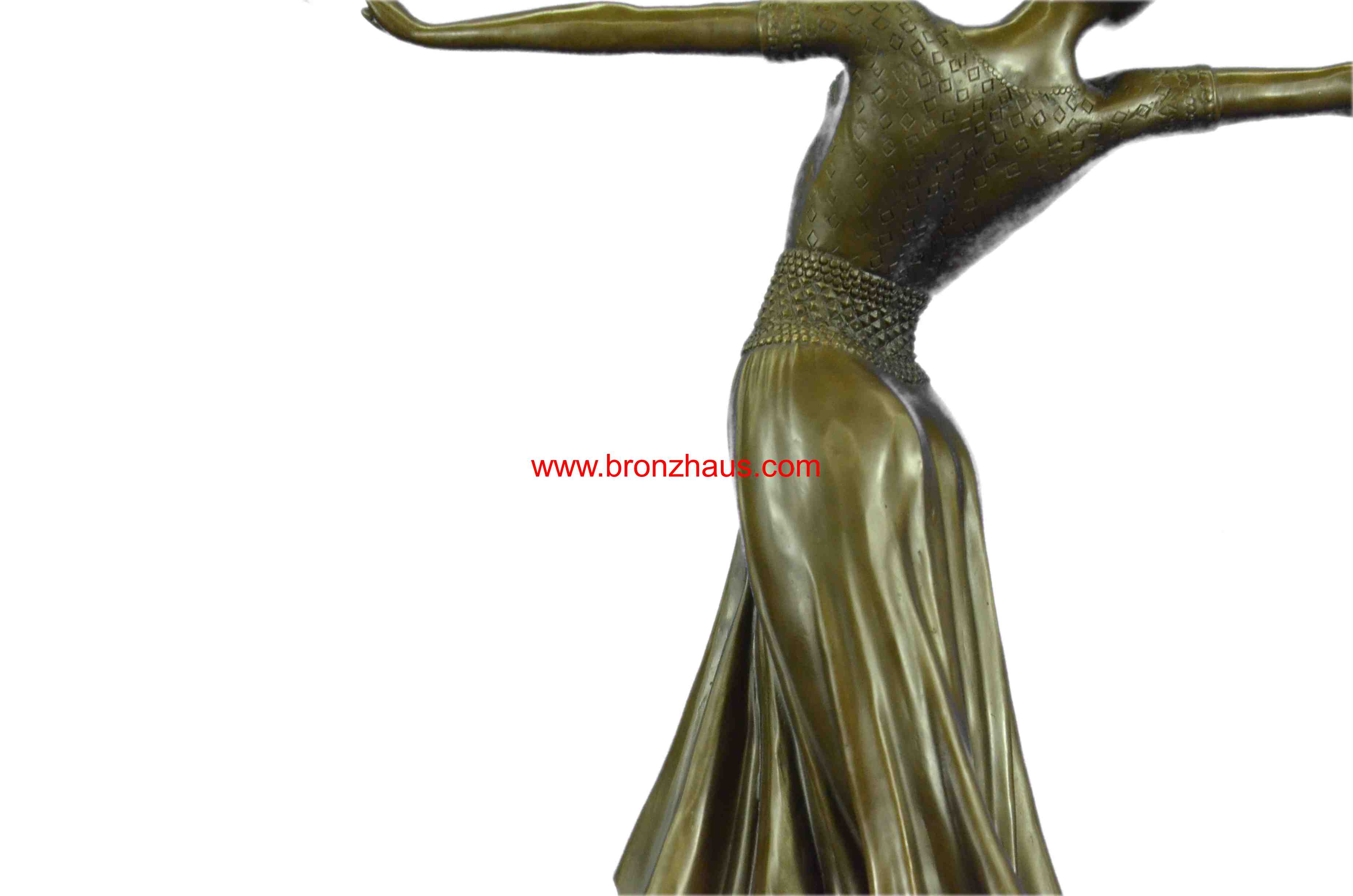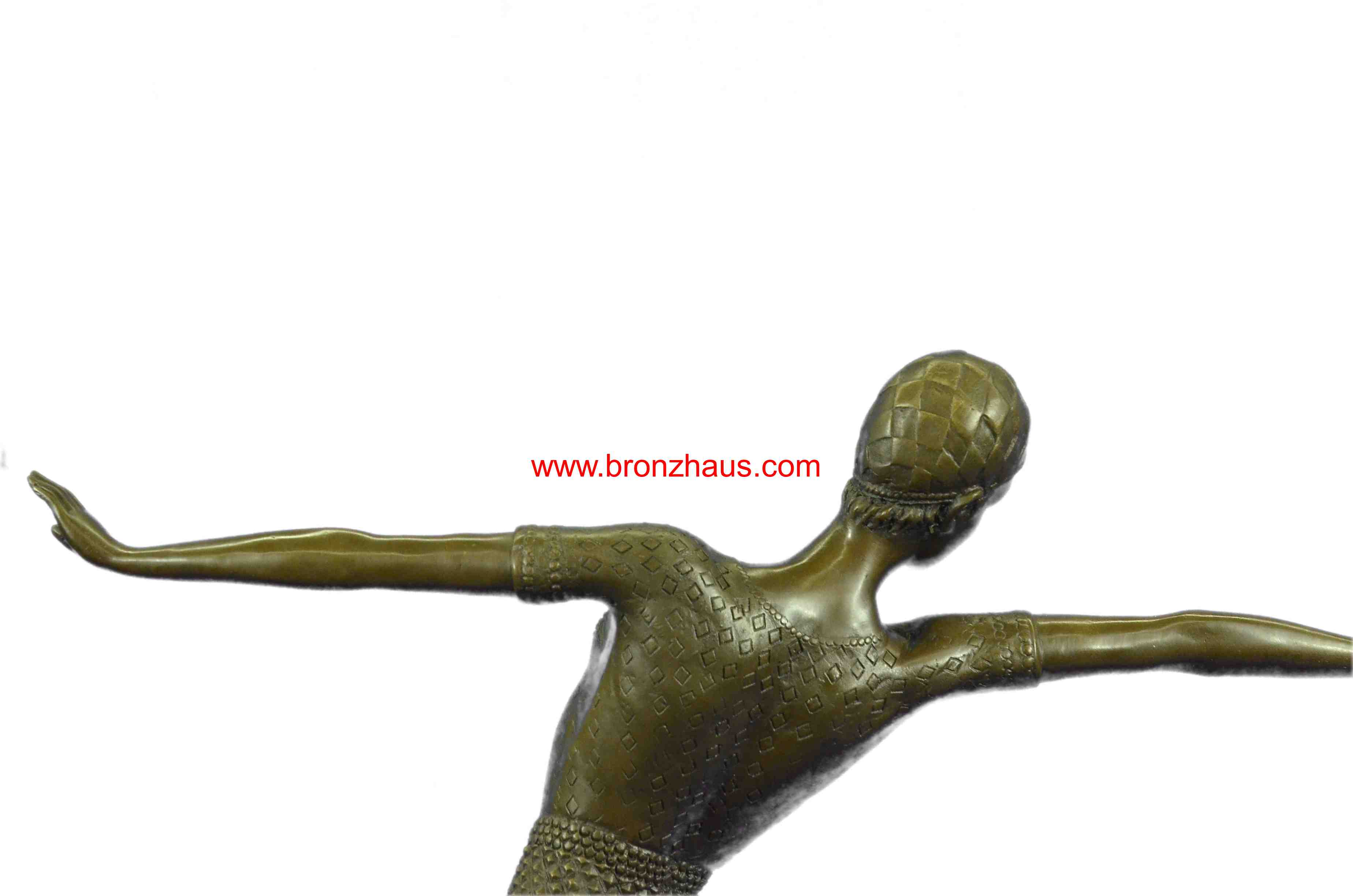 Marvelous flow in detail captured in Chiparus`s form. Another stunning piece to collect decorate, and behold in your home or office. Only the highest quality in patina is used to last generations. The brown flesh tones are actually the amazing applications of a patina blend over bronze. This bronze stands 25" Tall 16" Wide and 6" Deep with an original Chiparus signature at the base of the bronze. Casted in Europe using the lost wax method. Notice the authenticity of this recast of the original sculpture by examining the head torso and hand positions. Poor reproductions do not use the original mold and create their sculptures based on artist`s renditions. Notice the magnificent application of this patina blend which will was fused into the bronze to last for generations.Bronze Dimensions with Marble Base:Height 25" x Width 16"