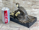 This captivating piece is a perfect fit for any Art Deco-themed setting and is destined to become the focal point of any room it graces. Created using the time-honored lost-wax casting method, the handmade bronze sculpture showcases intricate craftsmanship and attention to detail. A brown patina finish enhances its aesthetic appeal while ensuring its long-lasting preservation. Resting on a black marble base, it bears the European Bronze Finery quality stamp and the artist's signature.