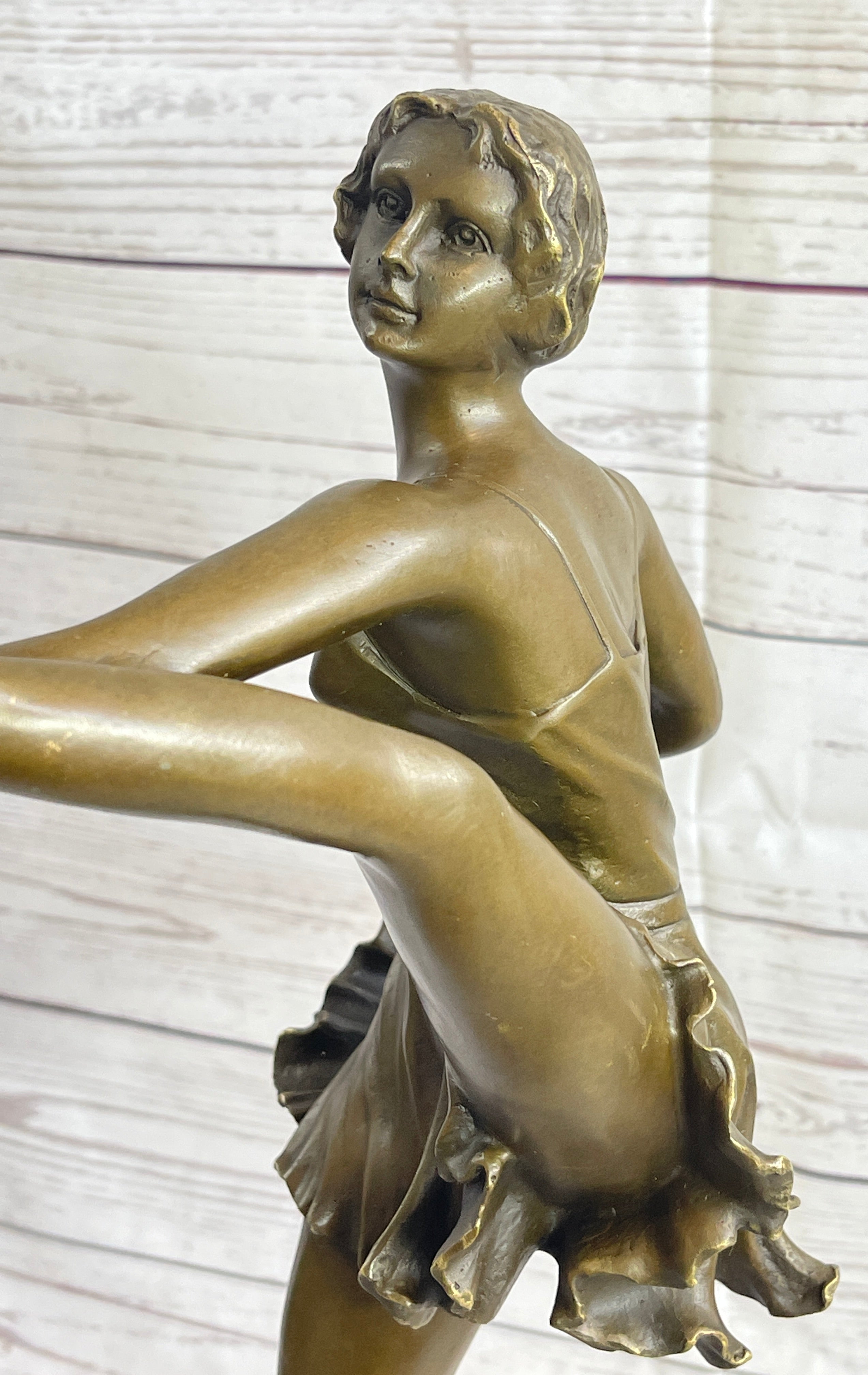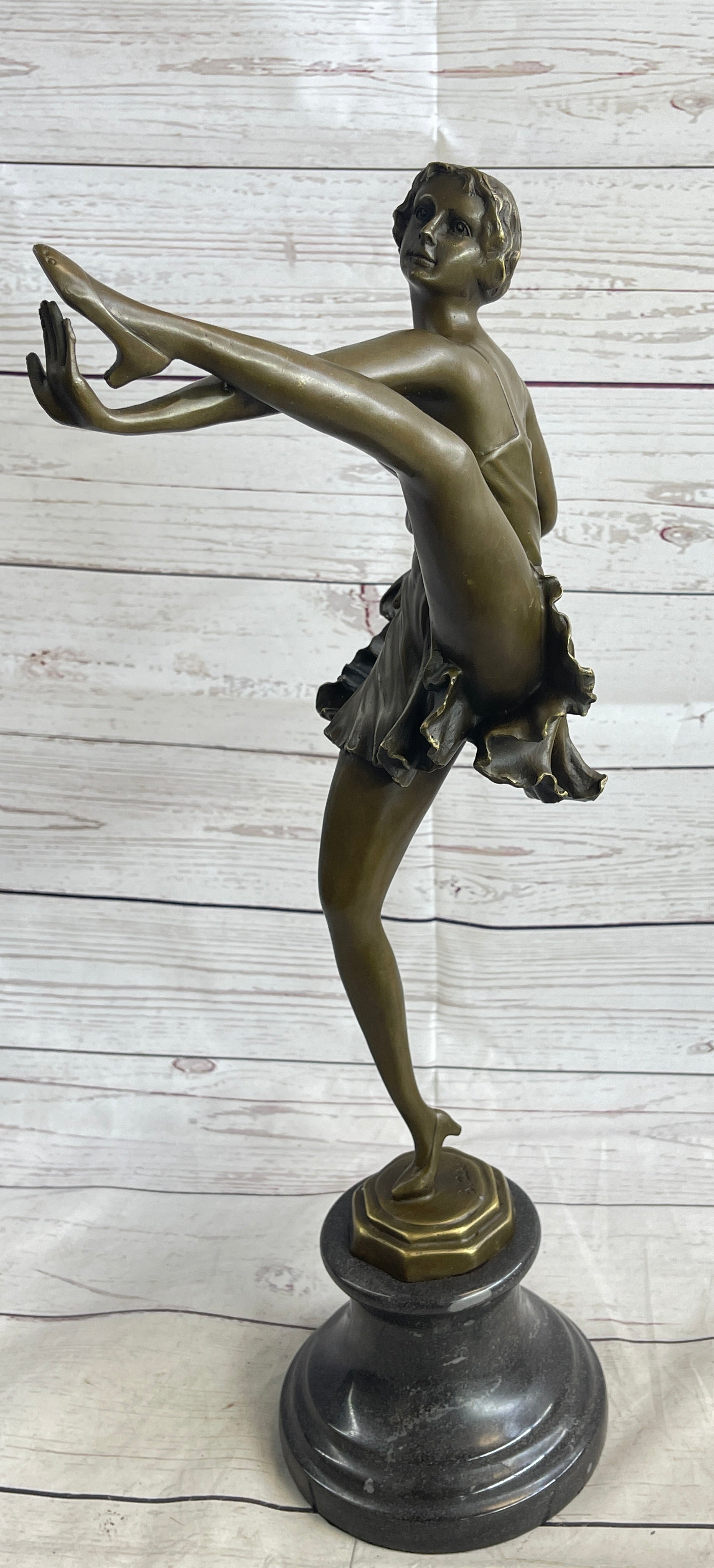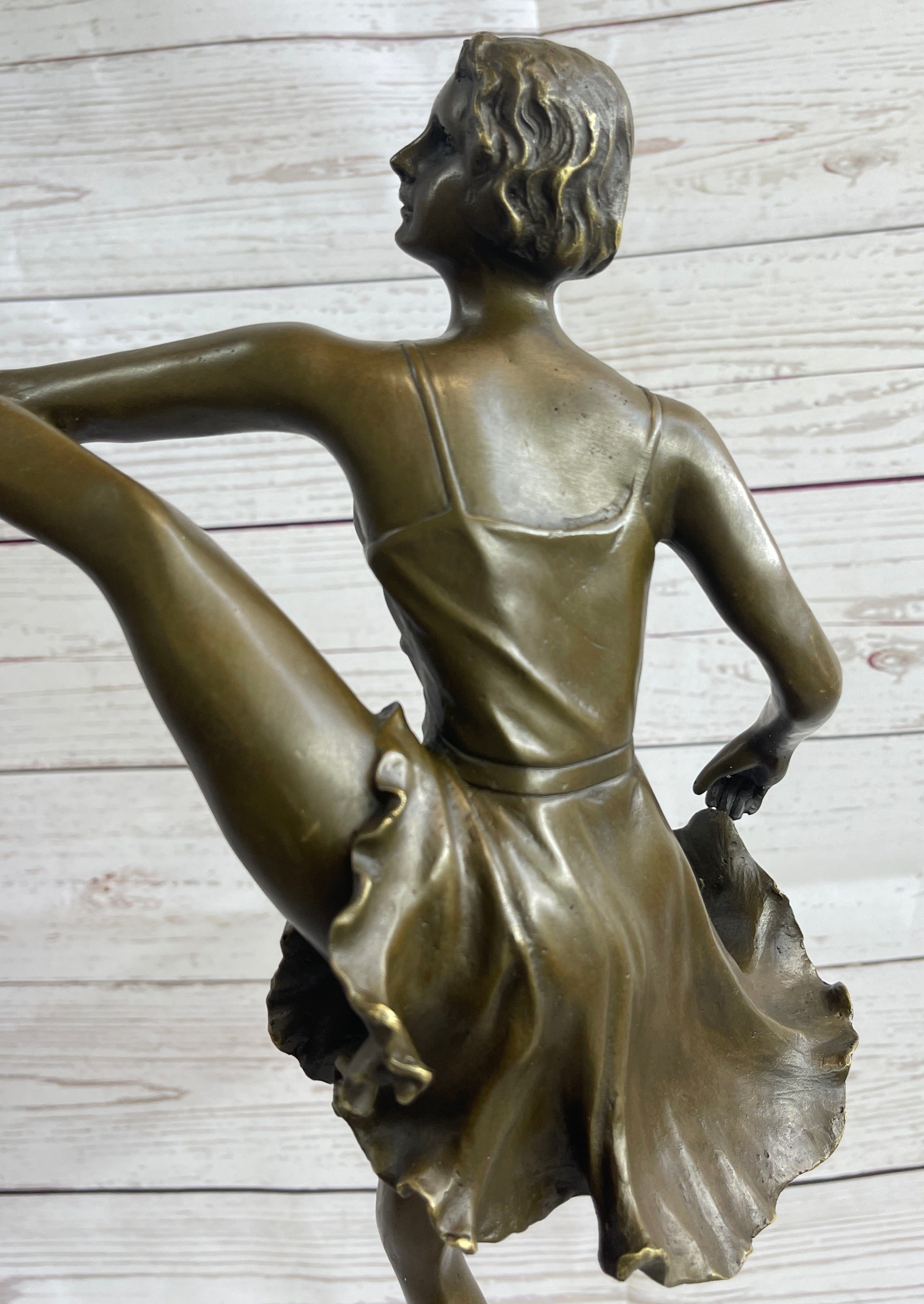 This captivating bronze sculpture showcases the elegance and poise of a dancer caught mid-performance. With her leg kicked high and her left hand gracefully touching the sole of her shoe, she exudes confidence and sensuality through this striking pose. The fluidity of her movement is expertly captured, creating a mesmerizing sense of rhythm and grace. Her flowing dress appears almost transparent, its delicately sculpted folds mimicking the softness of silk as it clings to her shapely figure.