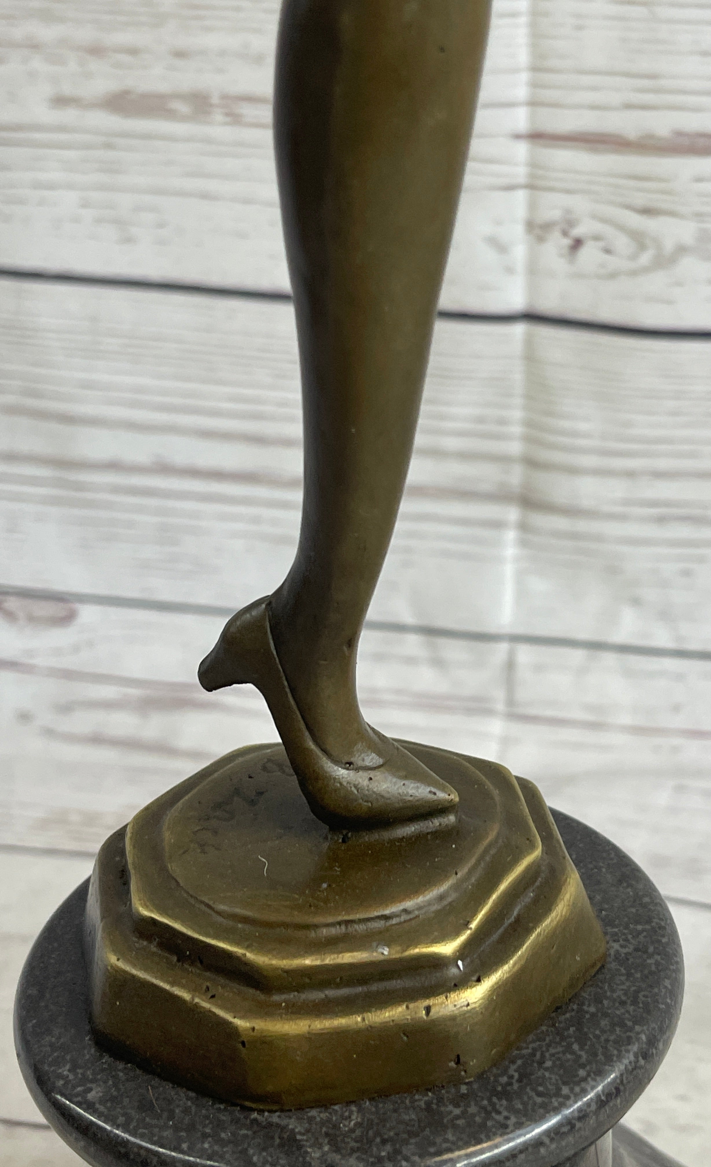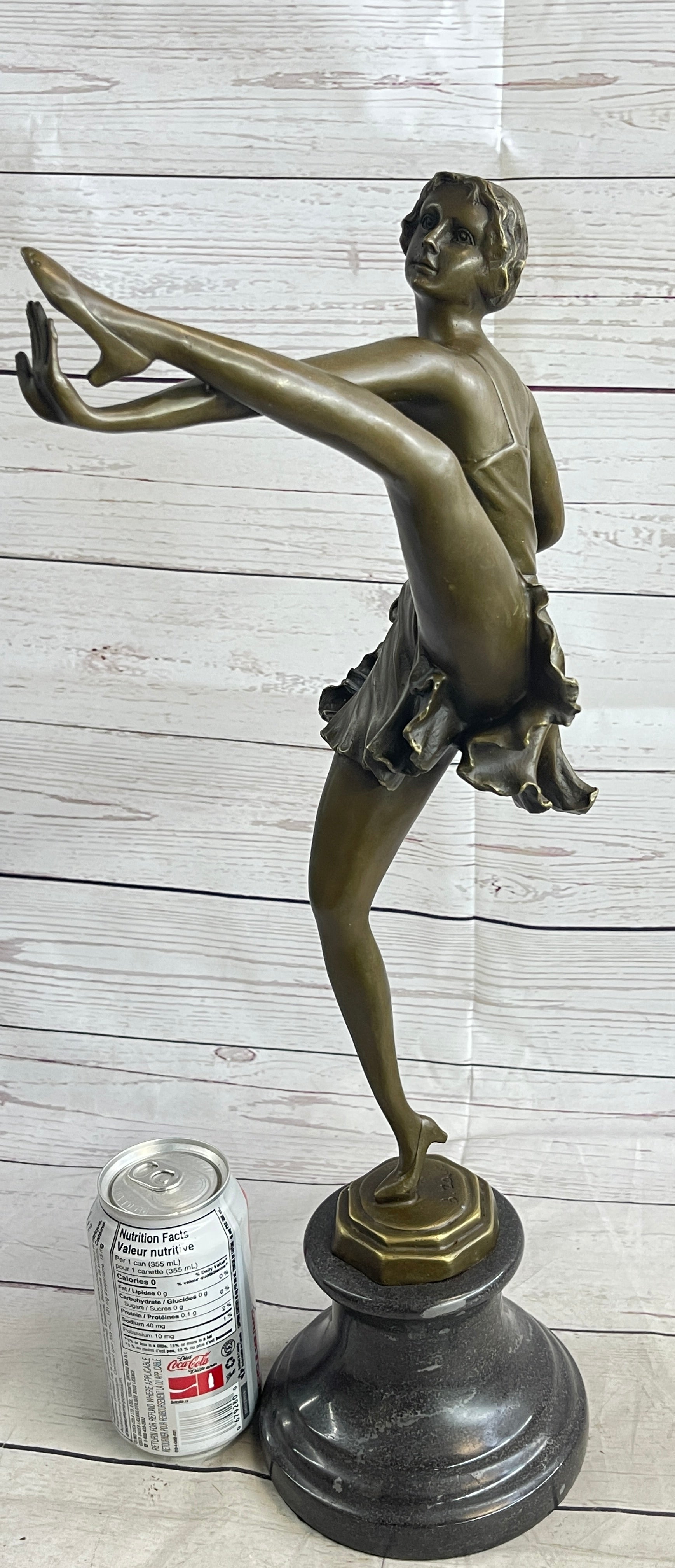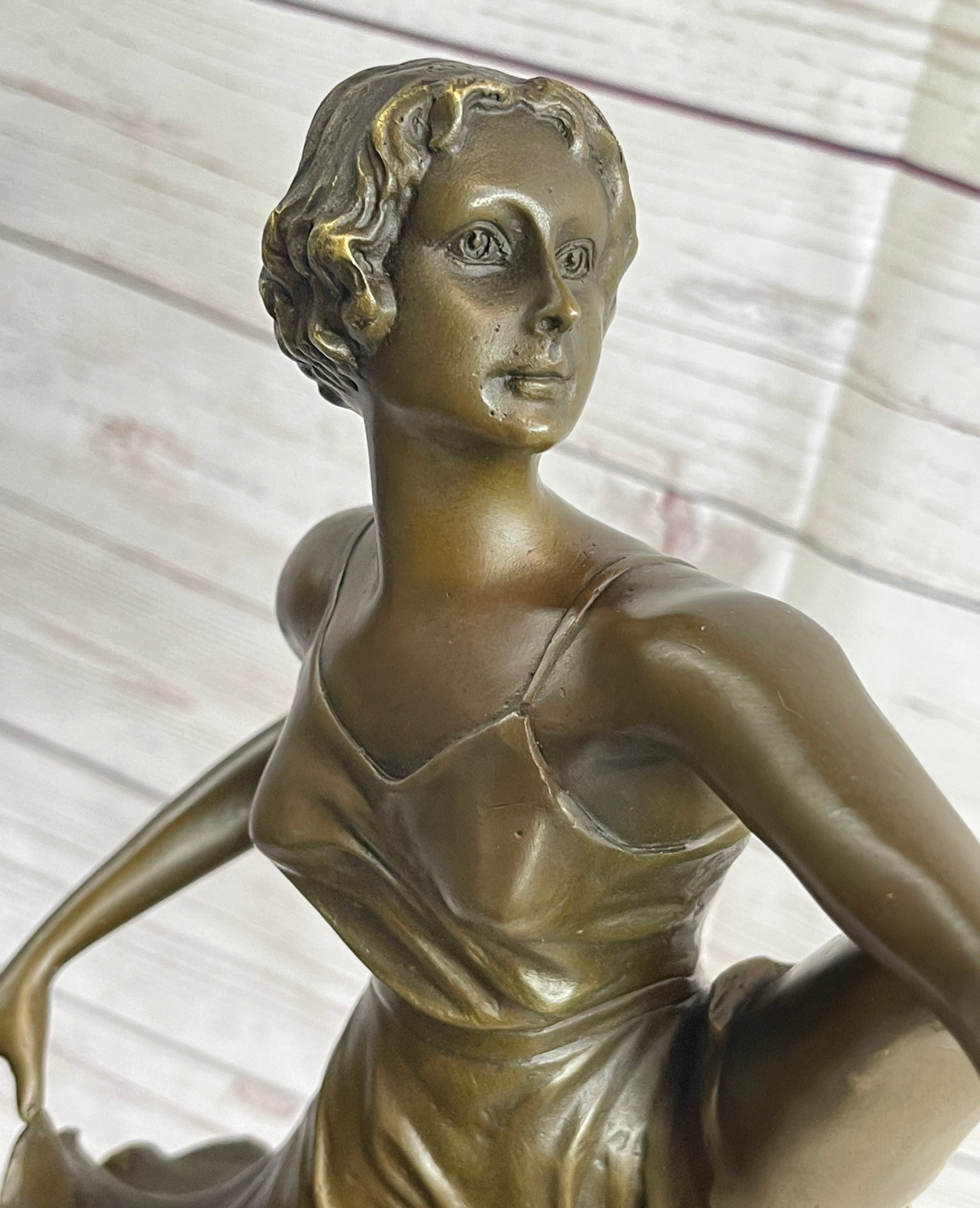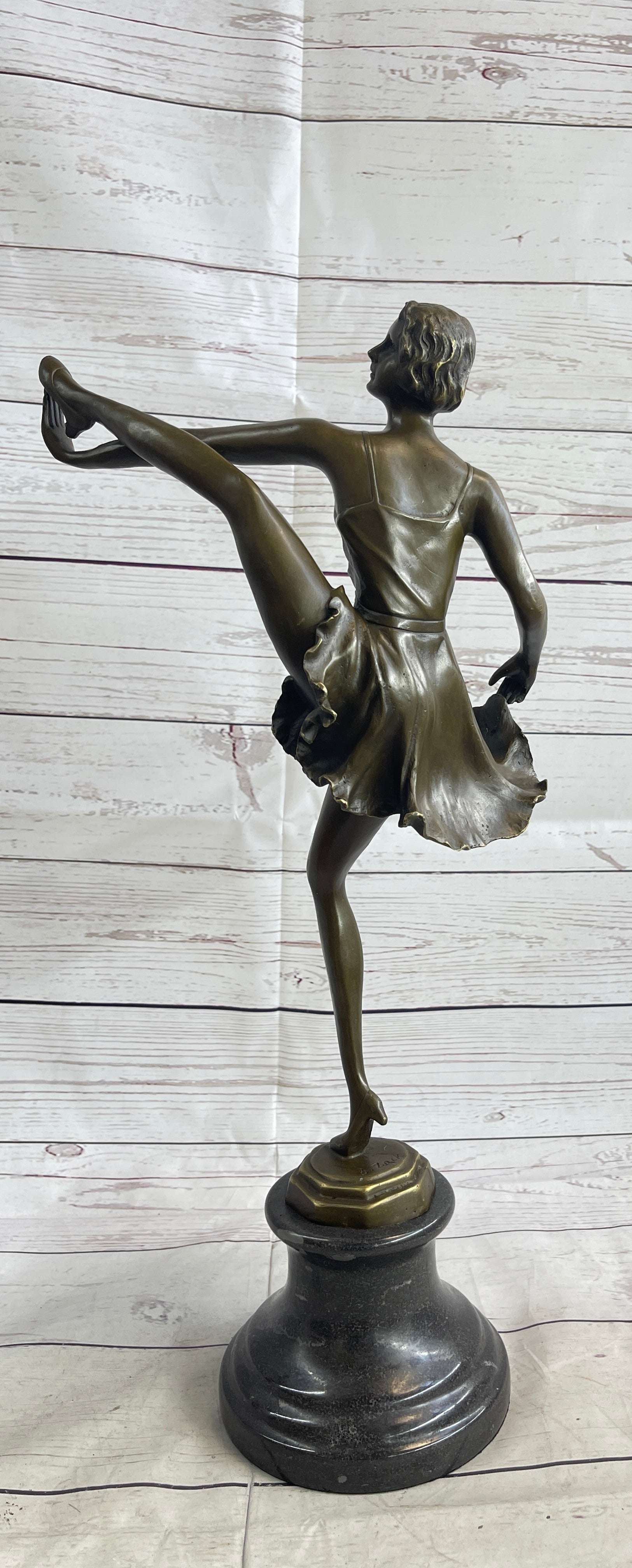 This captivating bronze sculpture showcases the elegance and poise of a dancer caught mid-performance. With her leg kicked high and her left hand gracefully touching the sole of her shoe, she exudes confidence and sensuality through this striking pose. The fluidity of her movement is expertly captured, creating a mesmerizing sense of rhythm and grace. Her flowing dress appears almost transparent, its delicately sculpted folds mimicking the softness of silk as it clings to her shapely figure.
