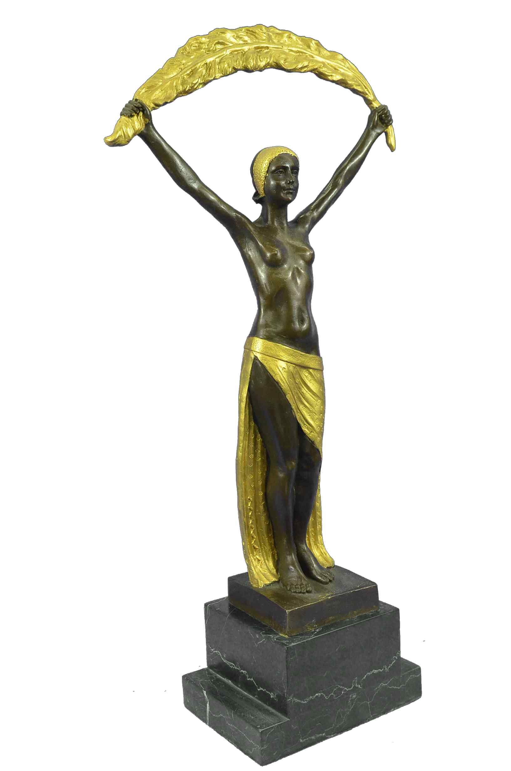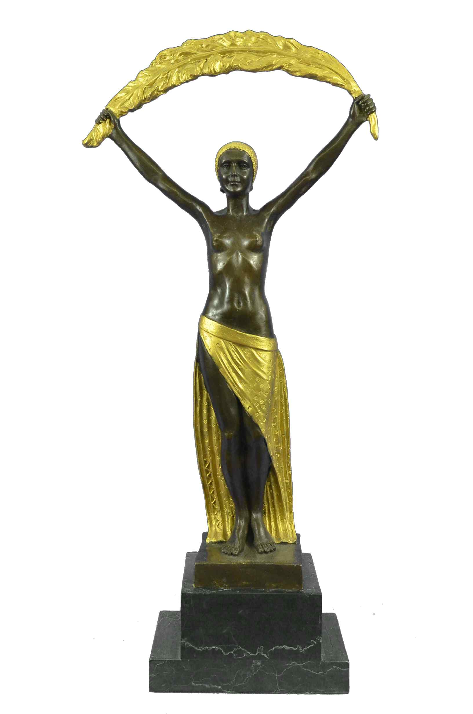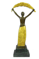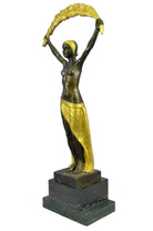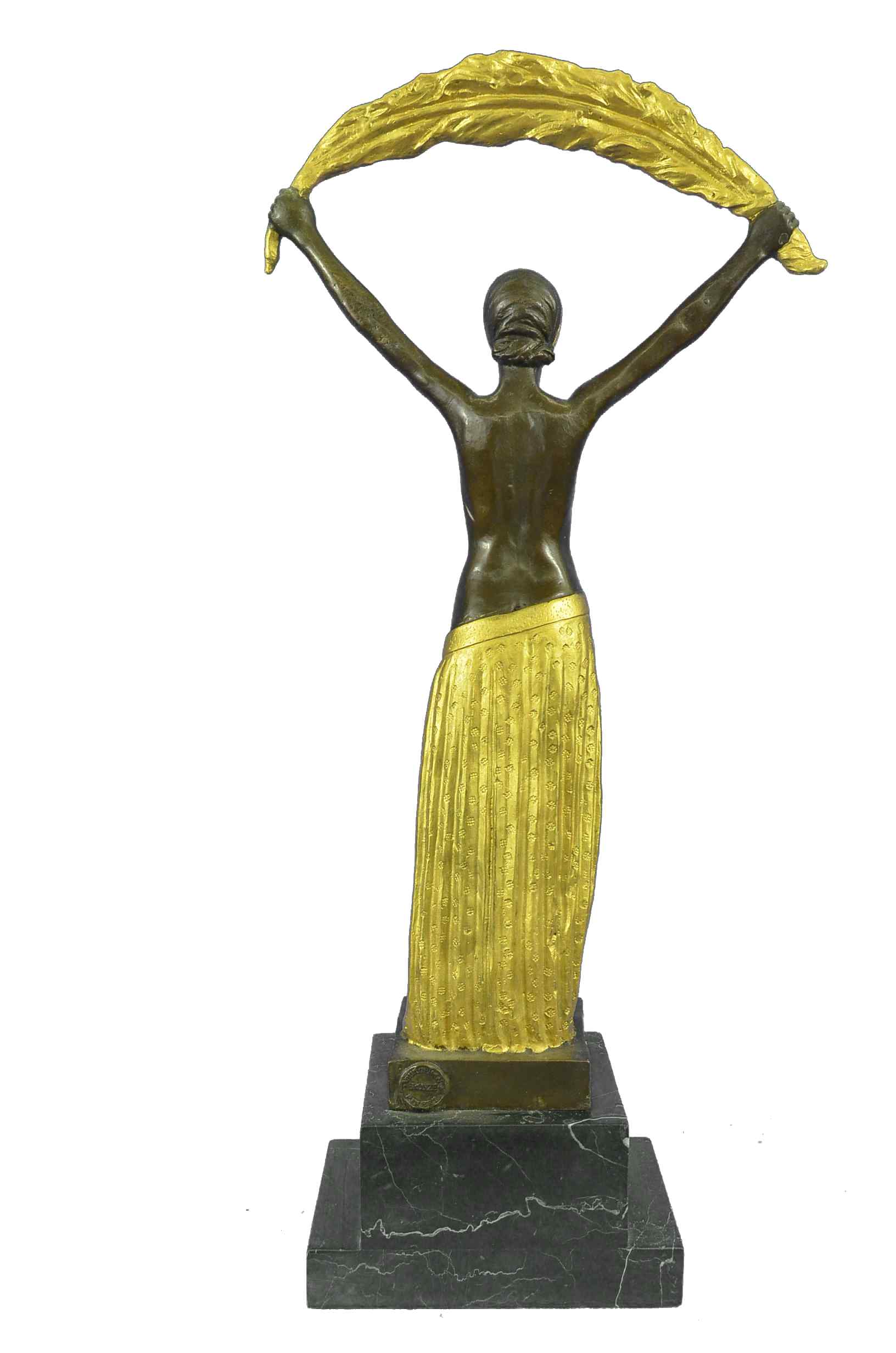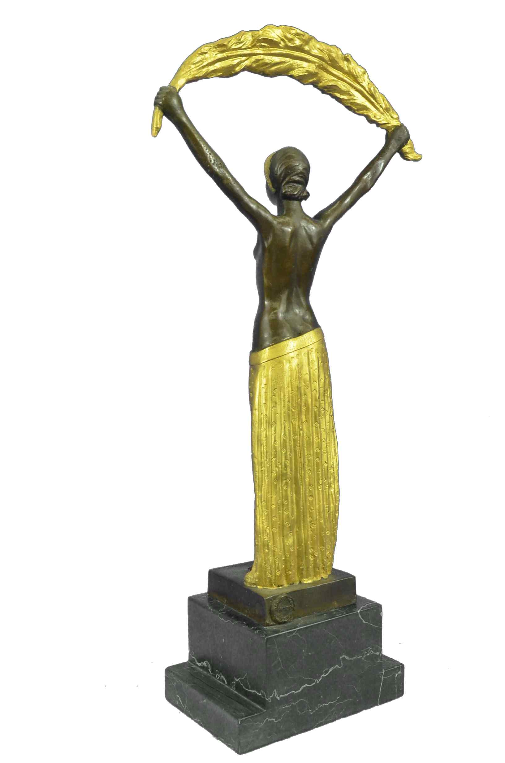 This lovely lady stands tall looking directly in front of her and she holds a feather cloth with both her hands and arms extended above her. She is wearing this gorgeous skirt that is long to her ankles and it has a beautiful side slit exposing her right thigh and a little of her left leg. She has this cute gold hat to match her outfit. She is cast using the ancient "Lost Wax Method" stained in gold and brown patina, she is mounted up top a doubled black marble base and signed by D.H Chiparus.Original or Reproduction: Reproduction