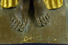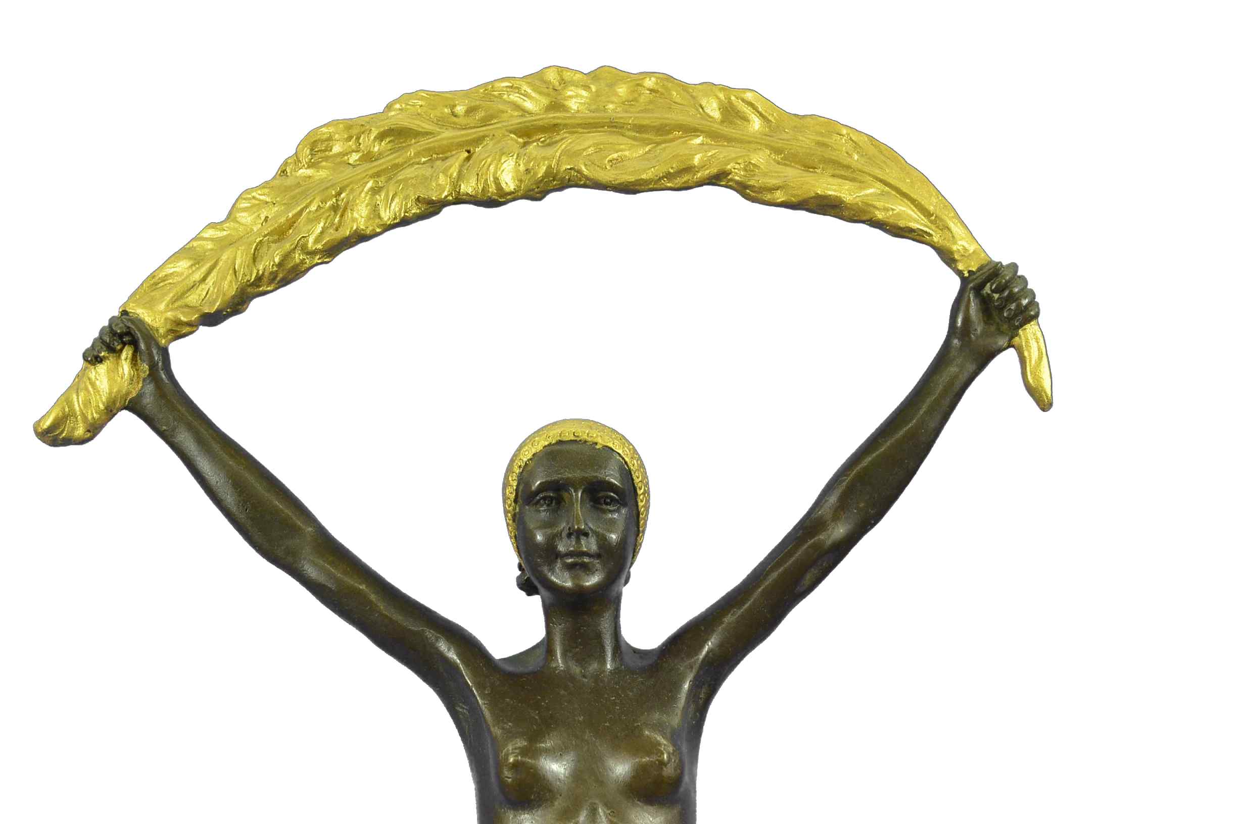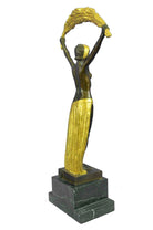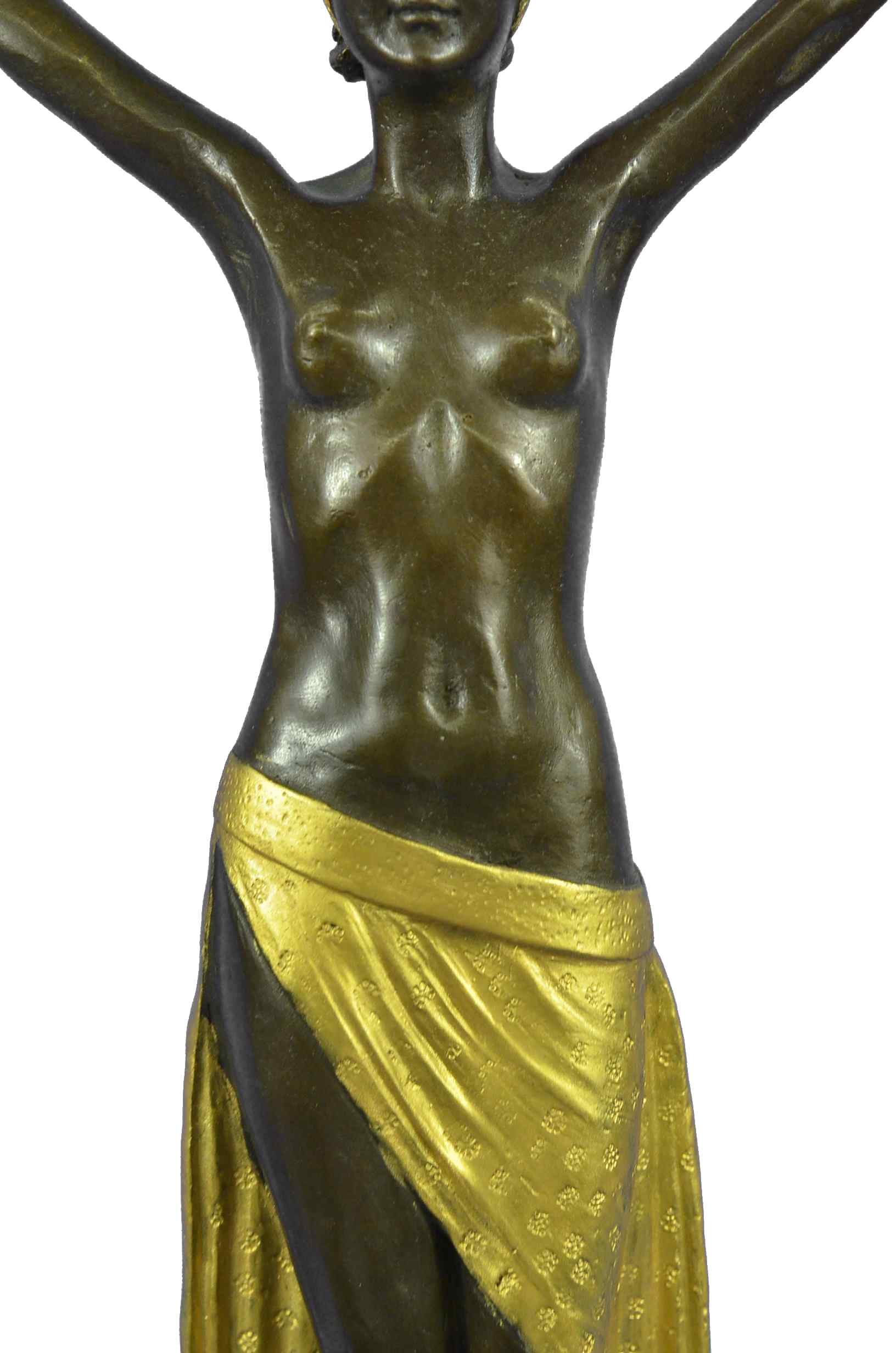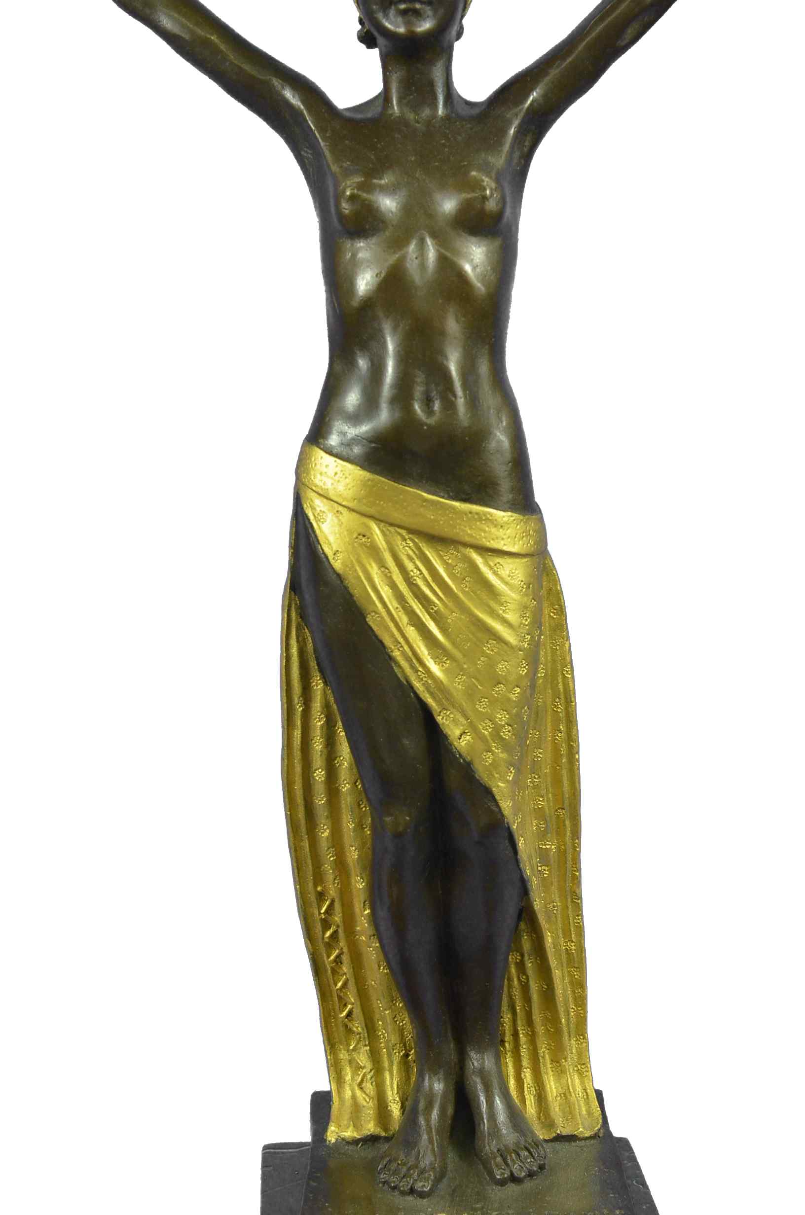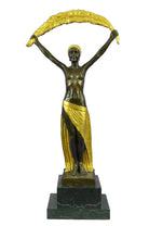 This lovely lady stands tall looking directly in front of her and she holds a feather cloth with both her hands and arms extended above her. She is wearing this gorgeous skirt that is long to her ankles and it has a beautiful side slit exposing her right thigh and a little of her left leg. She has this cute gold hat to match her outfit. She is cast using the ancient "Lost Wax Method" stained in gold and brown patina, she is mounted up top a doubled black marble base and signed by D.H Chiparus.Original or Reproduction: Reproduction