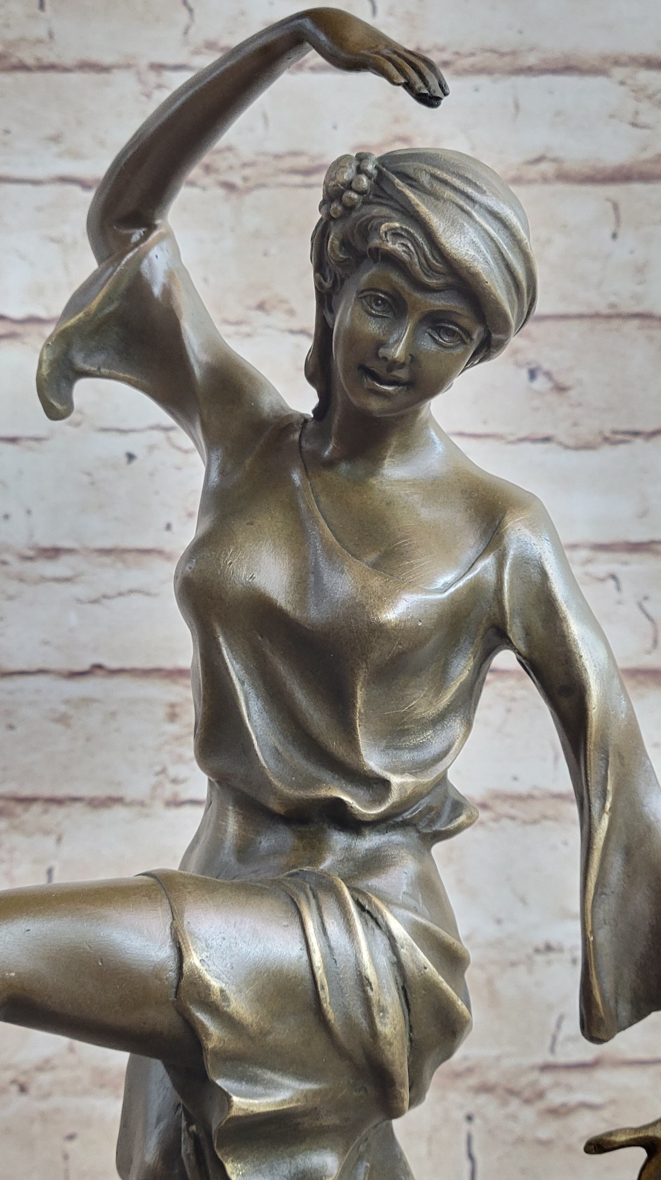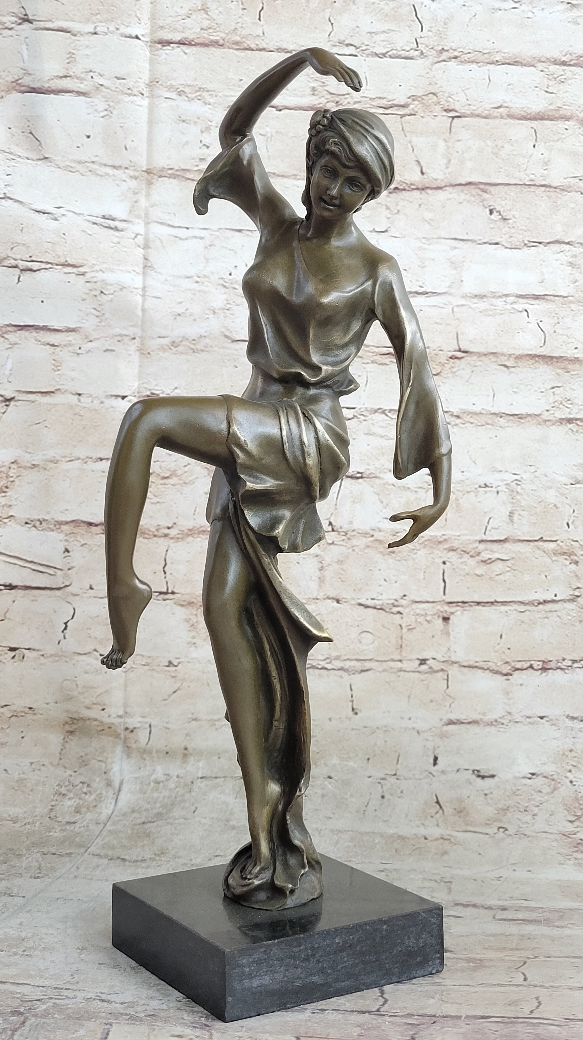 This captivating bronze statue brings to life the vibrant energy of a gypsy dancer, her lithe and graceful form captured in a moment of carefree movement. With arms and legs lifted in a fluid and expressive manner, she exudes an air of joyful abandon, inviting viewers to join in her spirited dance. The striking green tint of the bronze, complemented by the green marble base, adds an intriguing dimension to the sculpture, drawing the eye and sparking curiosity.