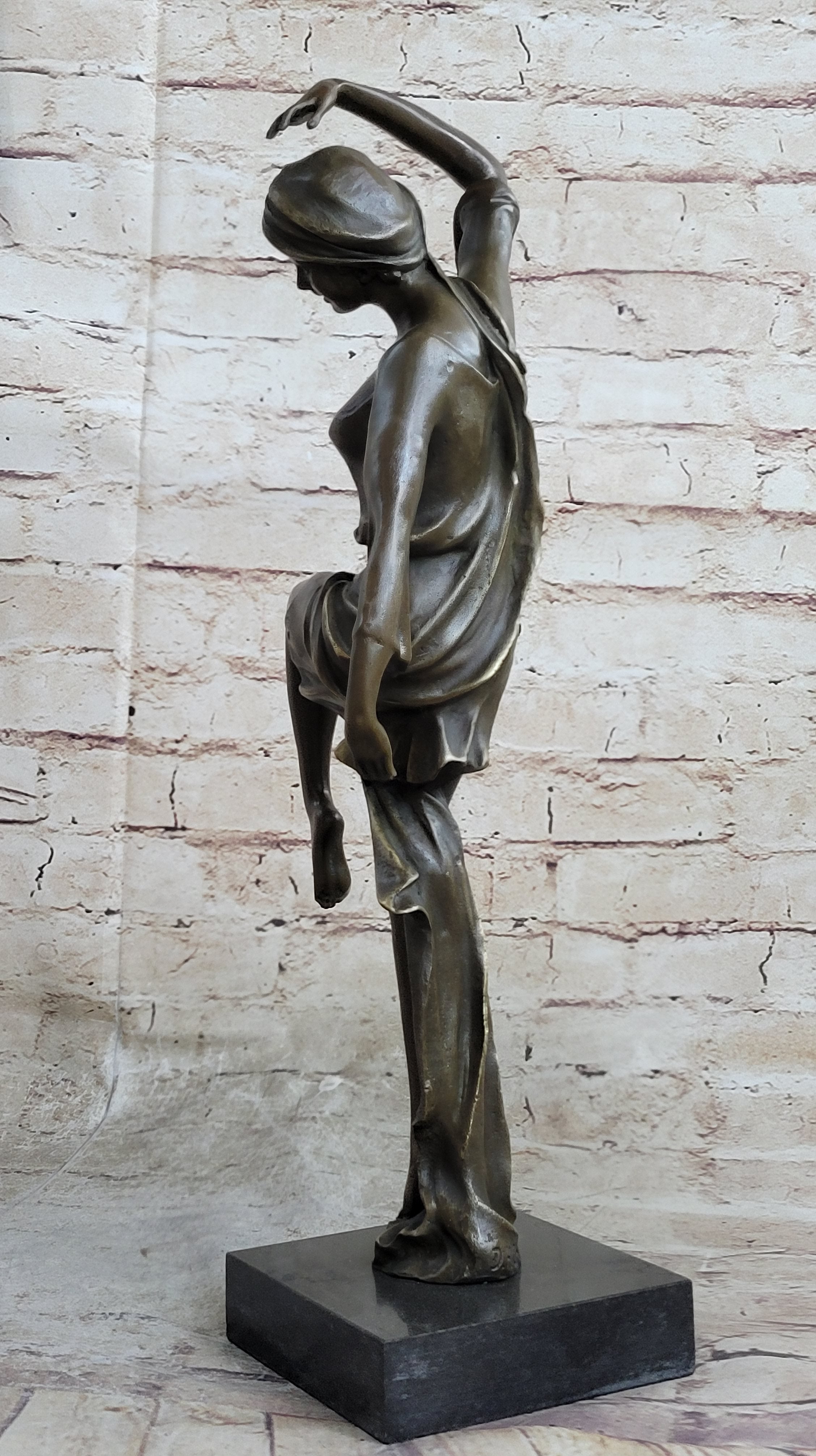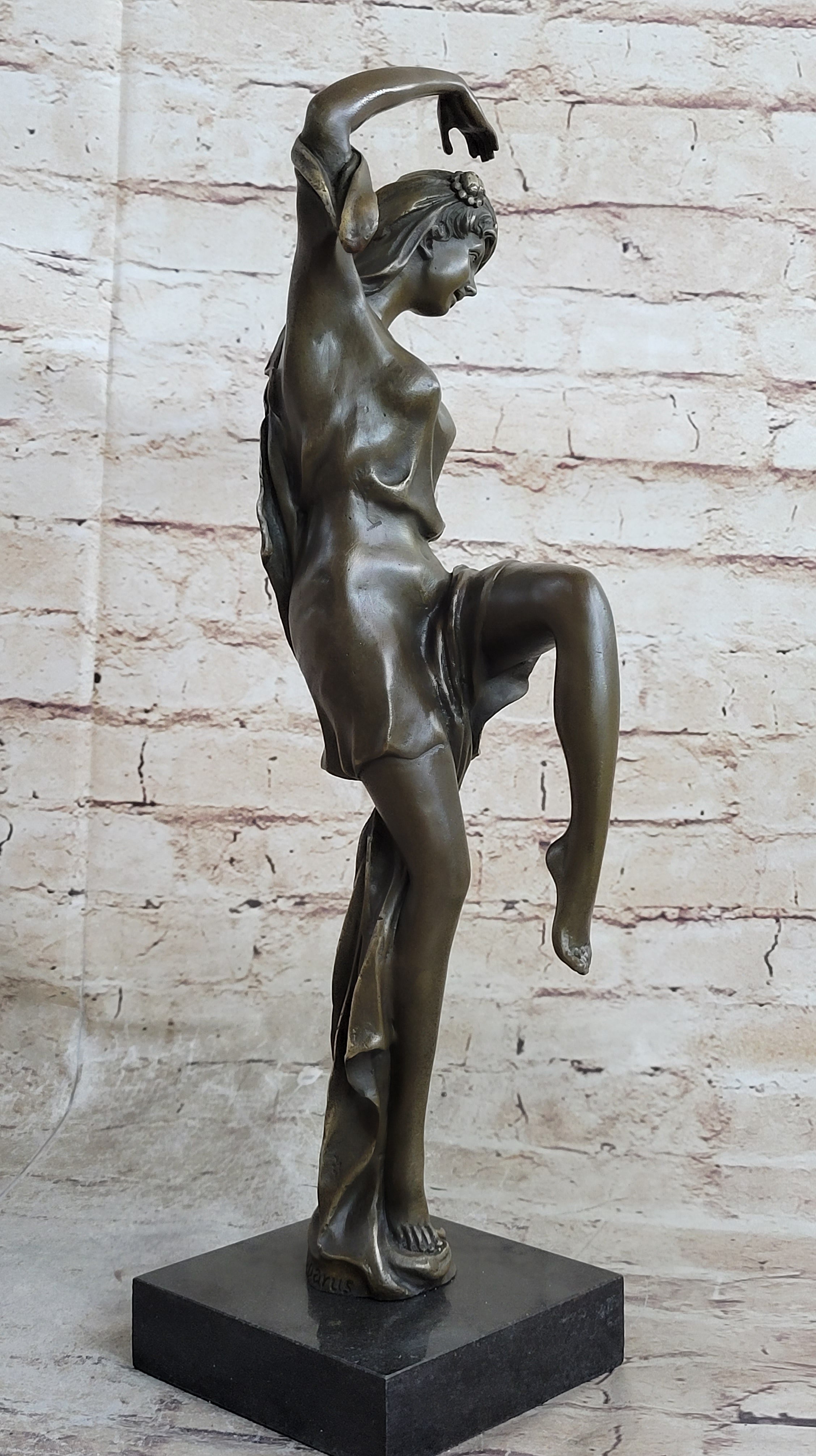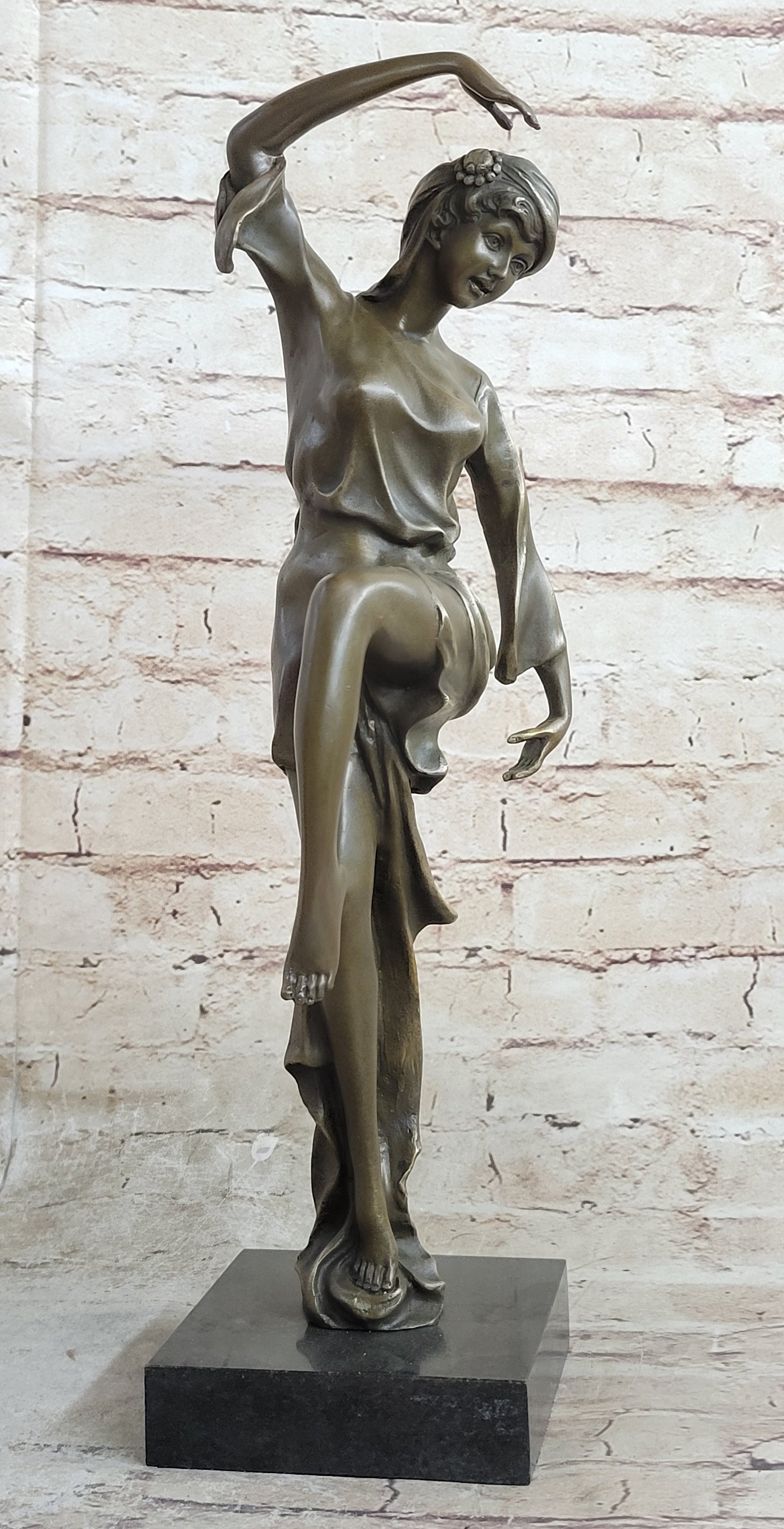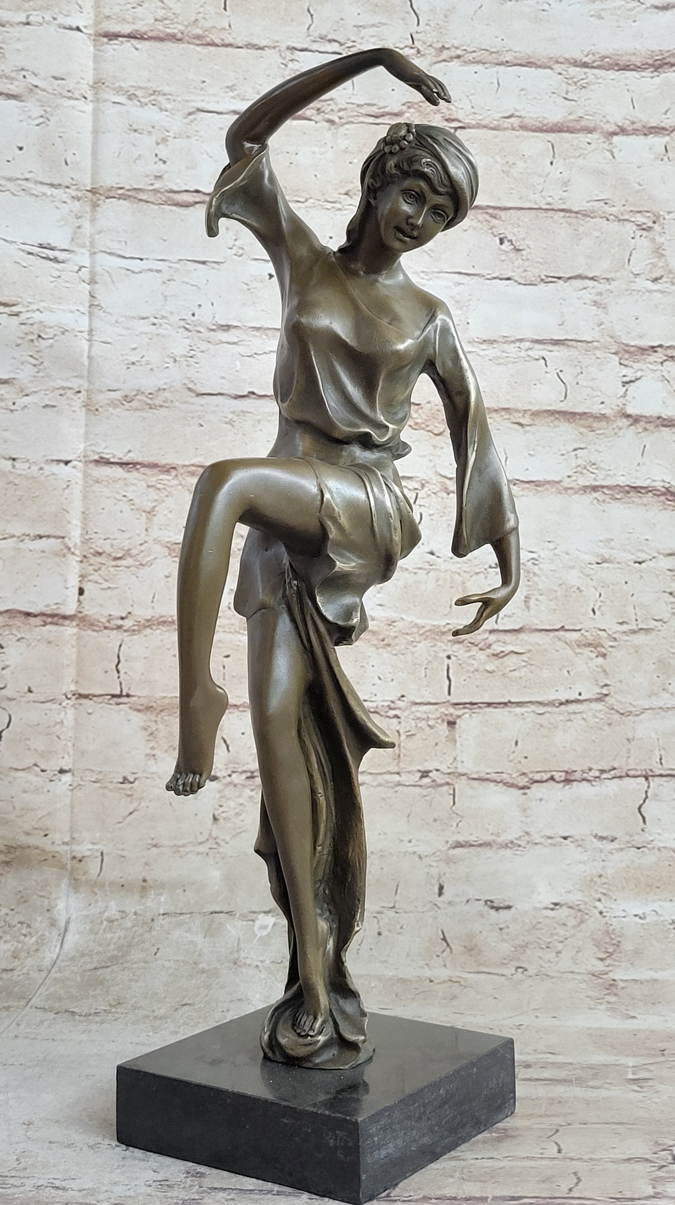 Every detail of this statue is meticulously crafted, from the dancer's elongated silhouette to the delicate flow of her dress as she moves. Her knee bent at a perfect 90-degree angle and her toes pointed with elegance, showcasing the artist's skill in capturing both form and motion. It's a piece that appeals to the senses, evoking a sense of movement and vitality that resonates with the viewer's own inner rhythm.