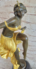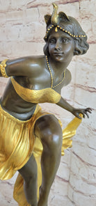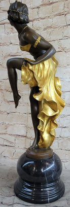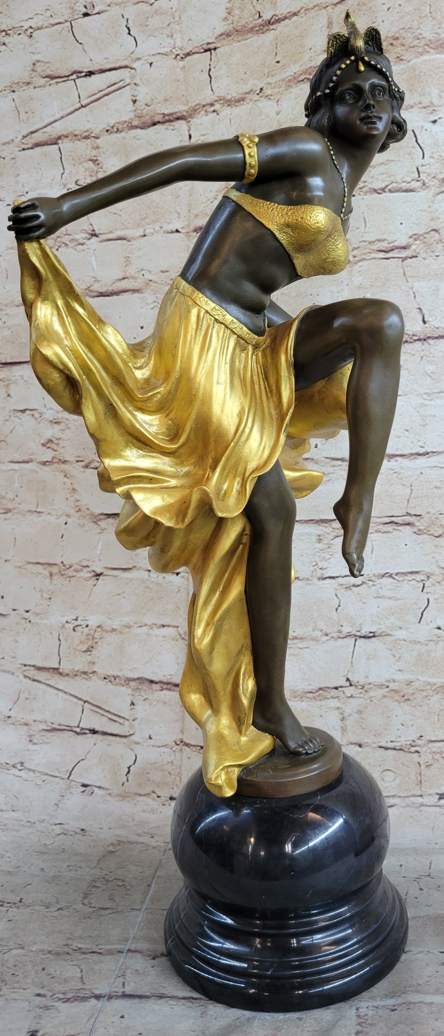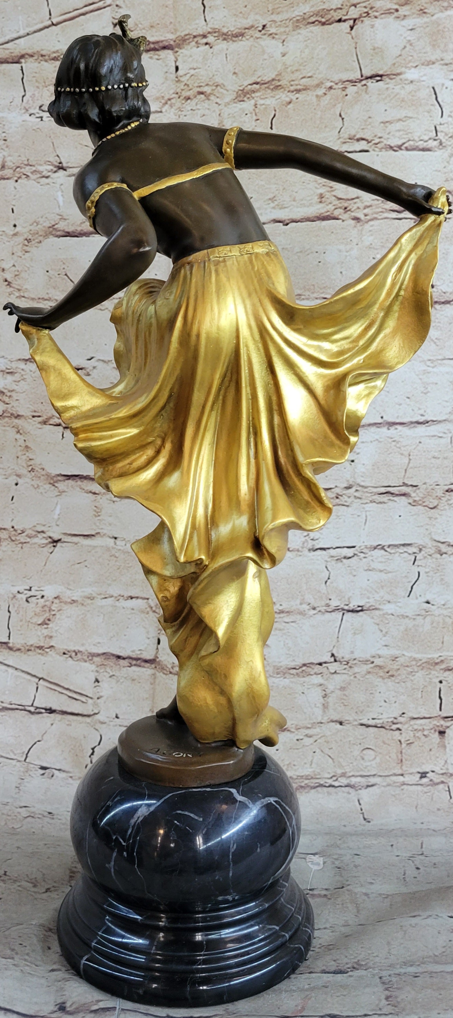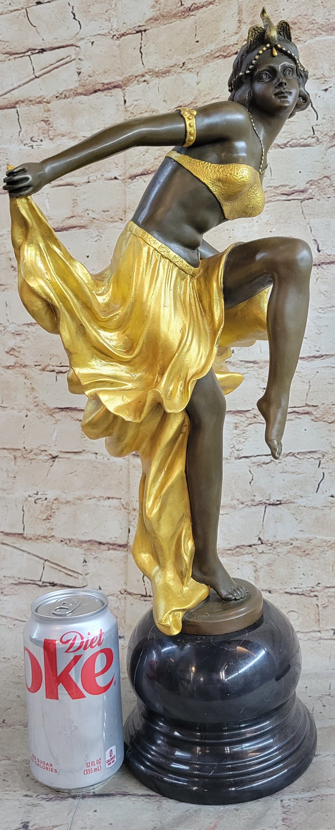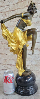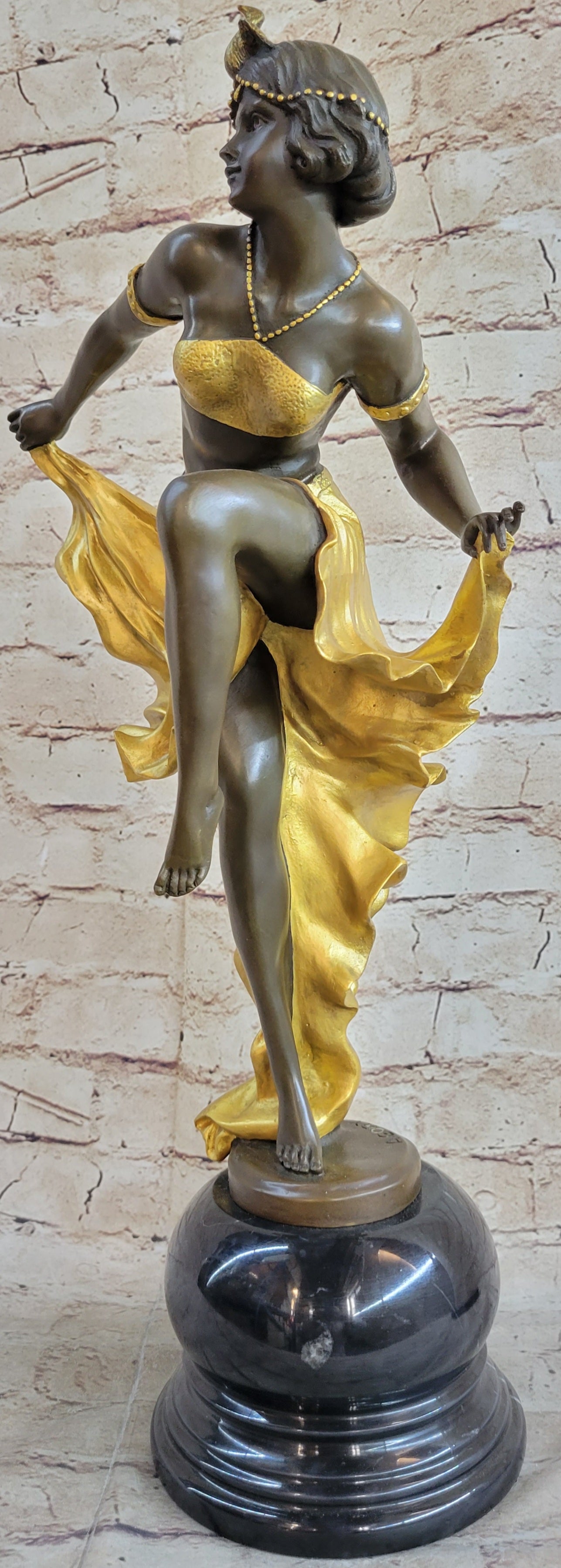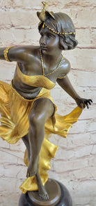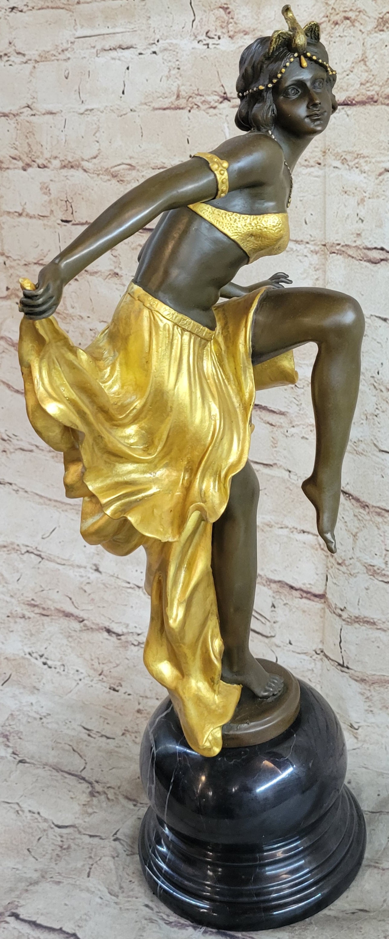 As our wild flapper dances wildly she smiles and lifts her skirt up high as she dances the night away. She bends forward and lifts her leg as her small hard nipples poke out from her top. Her top is made a material with a textured surface and is barely being held up by a beaded neck tie. She is barefoot and carefree of her exposure. Her short hair is held back by an interesting head piece in the shape of a bird with a bead dangling from the middle and beads wrapping around her head. She has arm bands with studded accents and her skirt is held in place by a belt with a floral imprint. As she lifts her leg up high she pulls her skirt out to the side creating a gorgeous caption of still flowing motion. The sculpture was casted using the “Lost Wax Method” and has a brown and gold patina . The statue is signed A. Gory.Bronze Dimensions with Marble Base: Height 20"x Width 10"
