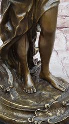 Celebrate the timeless charm of pastoral life with this beautifully crafted bronze sculpture titled Harvest Girl, signed by the esteemed artist Moreau. This exquisite figurine captures a young woman in a moment of graceful repose, gently holding the bounty of her harvest. Her serene expression and flowing garments evoke a deep connection to nature and the simple joys of rural living.