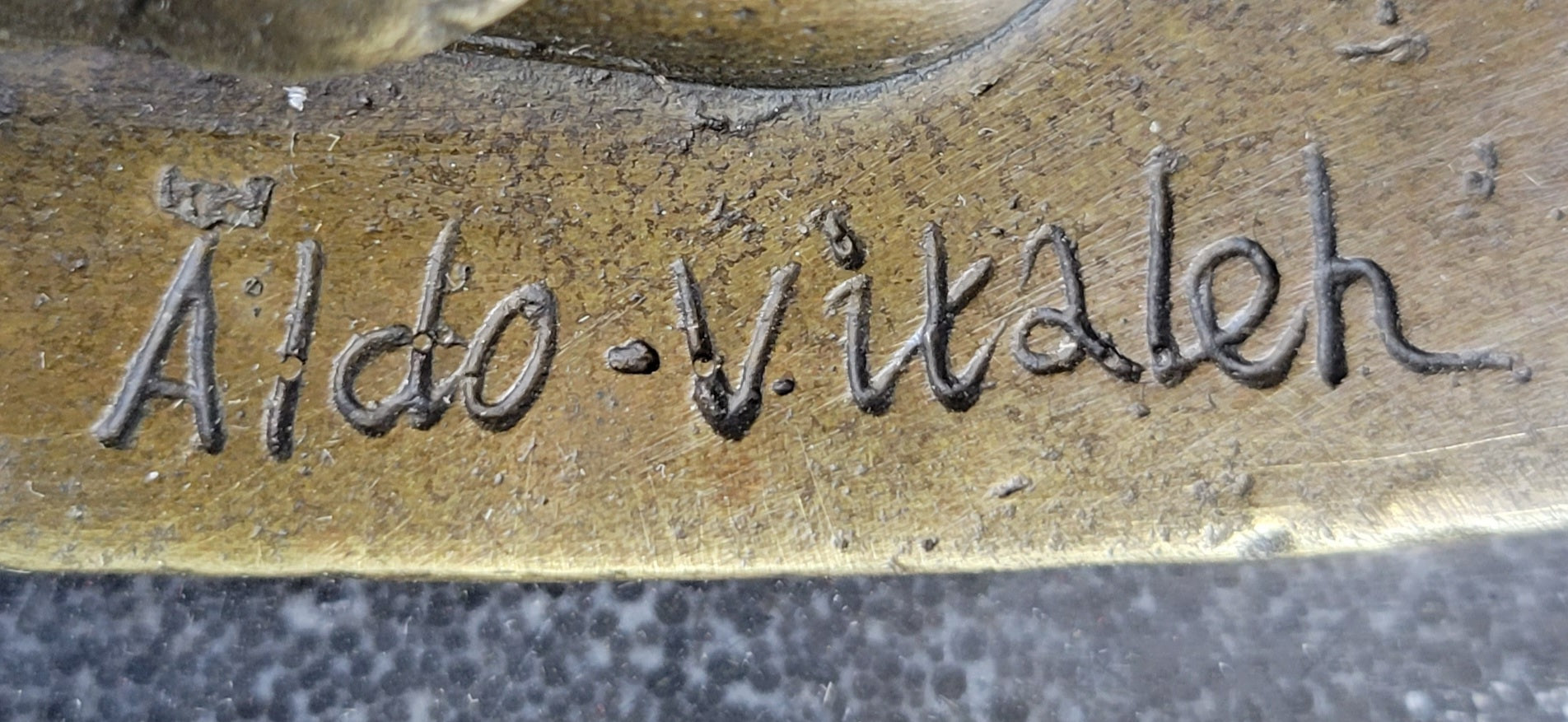 The signature of Artist Aldo Vitaleh, a master in the realm of sculpting, adds a final touch of distinction to the piece. As you gaze upon the intertwined figures, you're transported to the world of dance and art that Degas held so dear. This sculpture serves as a visual ode to Degas' enduring influence, inviting you to experience the harmony of movement and emotion that transcends time and continues to captivate art enthusiasts worldwide.Bronze Dimensions with Marble Base: Height 12" X Width 10"