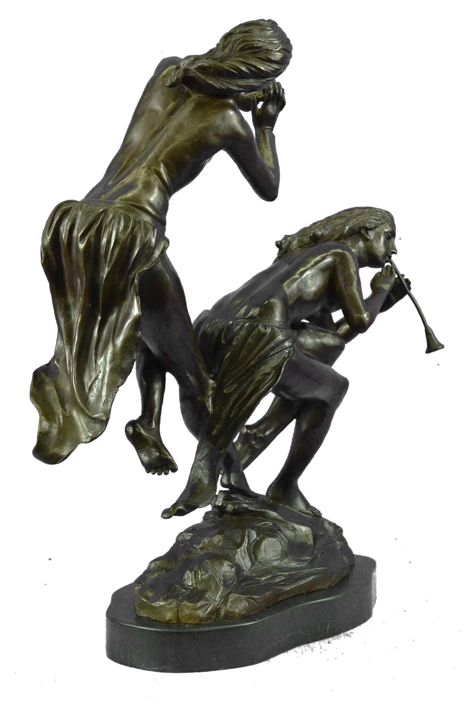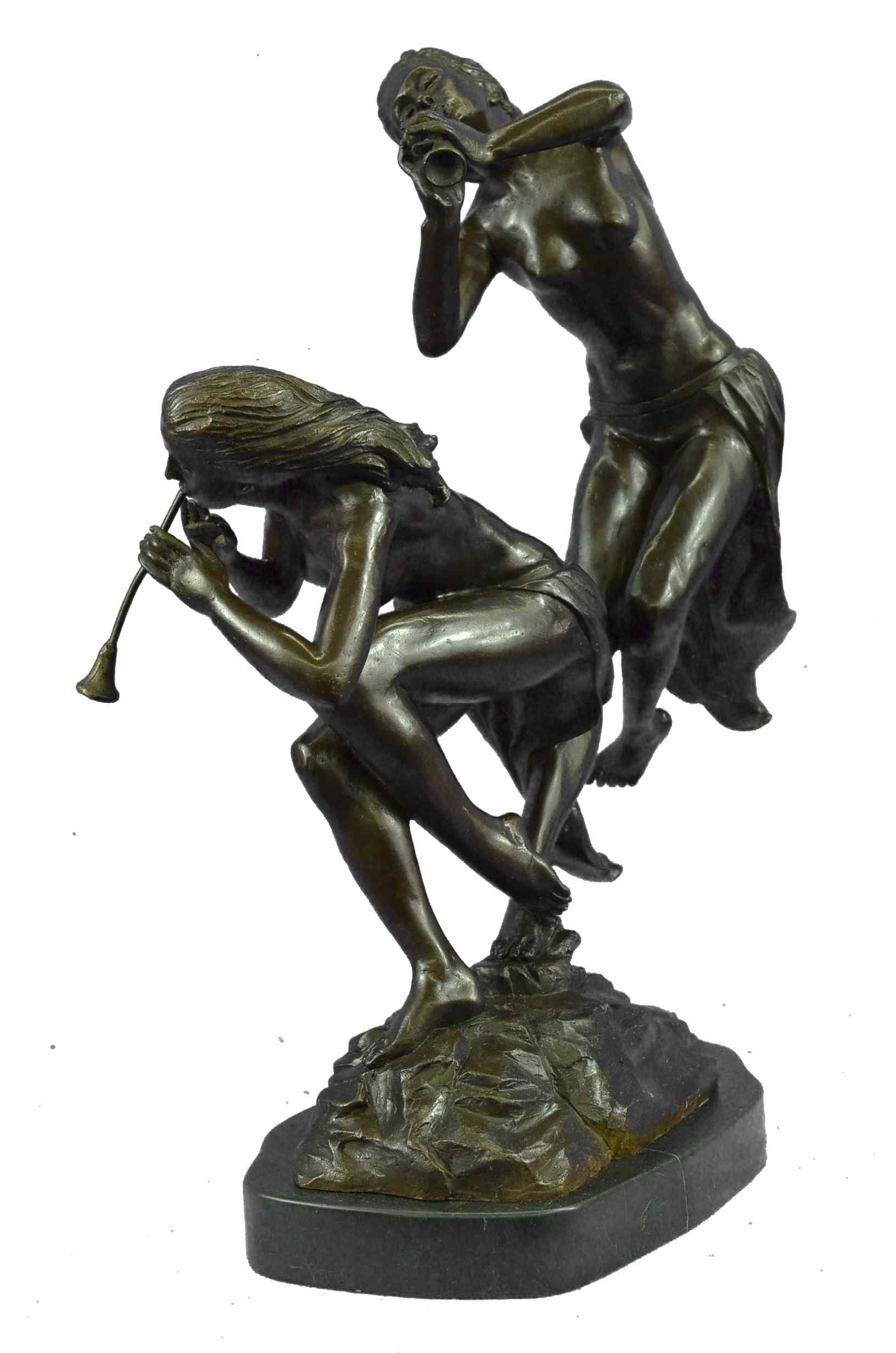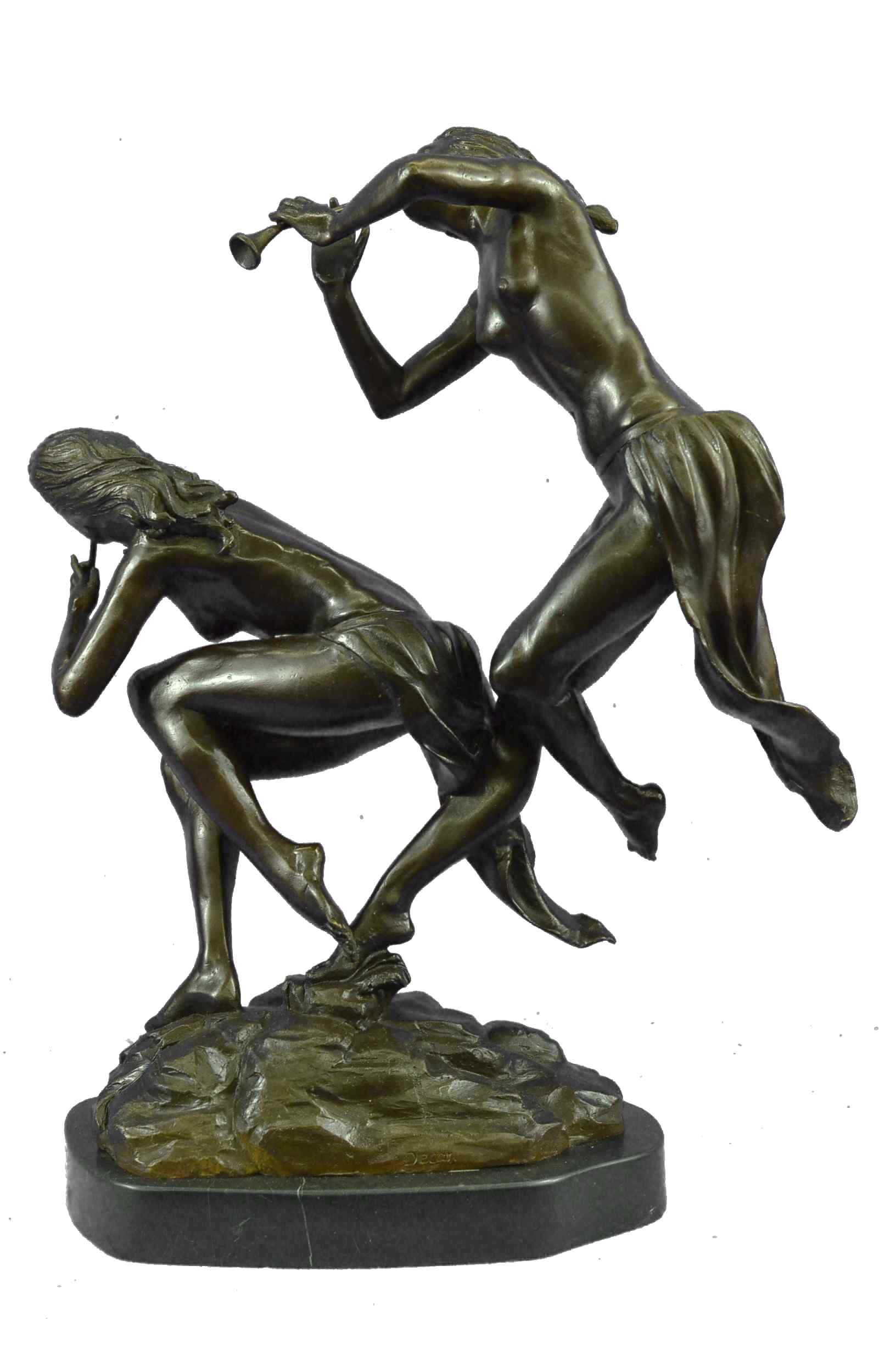 Wood nymphs are singing and dancing positively elated with the sounds of the flute and beauty of the forest. One woman squats low to the ground and blows into her instrument as the other leaps behind clapping to the rhythms. The woman are dressed half-nude with simple cloths attached at their waists. This bronze sculpture was cast using the lost wax method. It stands on a black marble base and is signed Dino DecarloOriginal or Reproduction: Reproduction