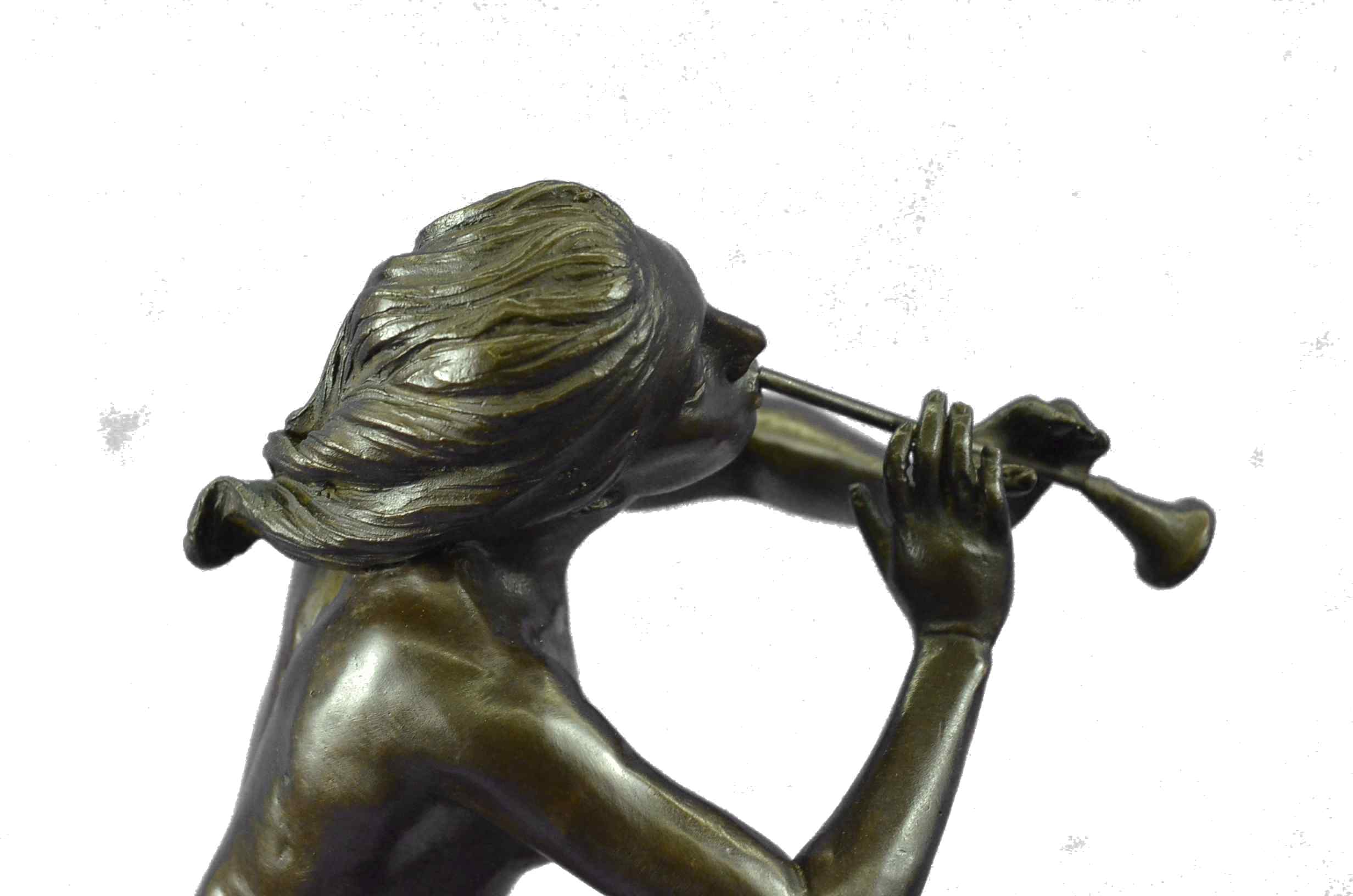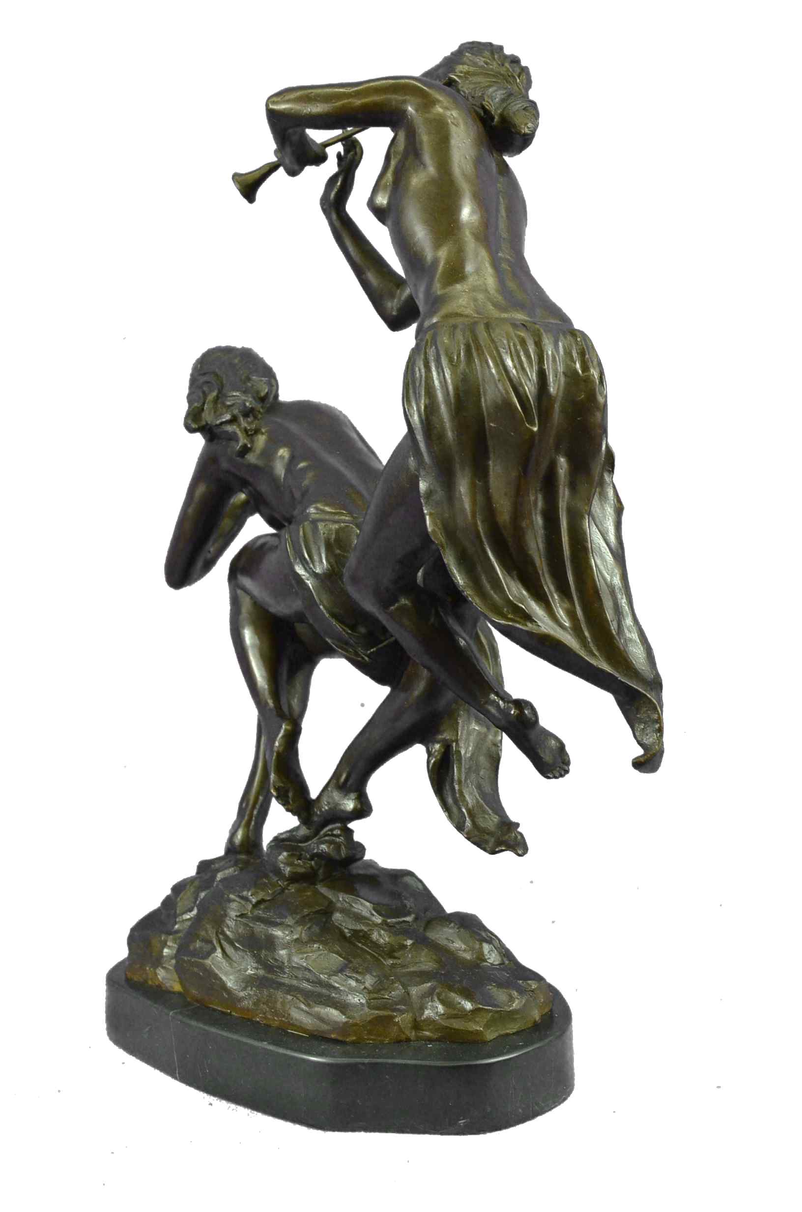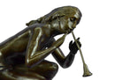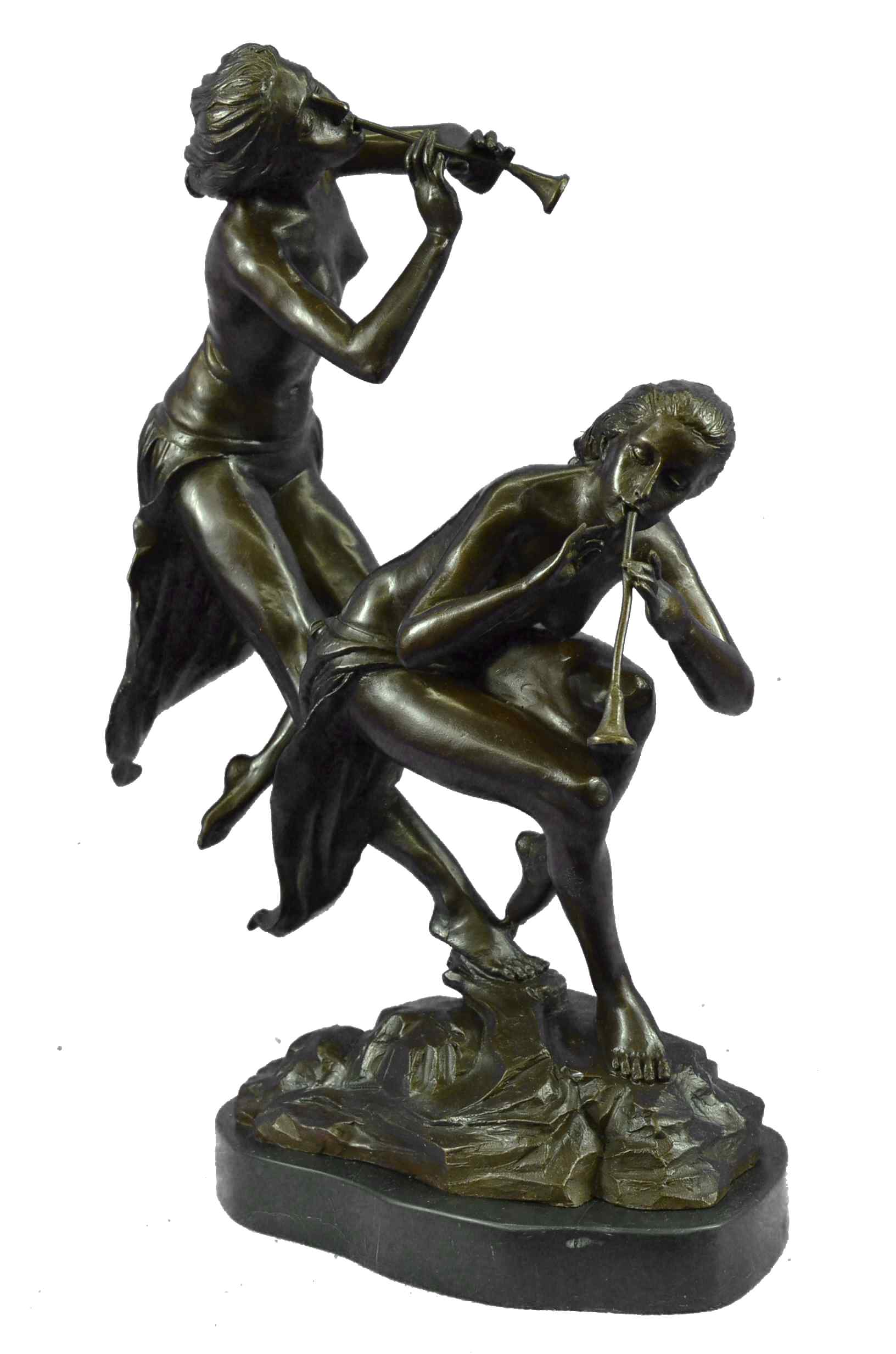 Wood nymphs are singing and dancing positively elated with the sounds of the flute and beauty of the forest. One woman squats low to the ground and blows into her instrument as the other leaps behind clapping to the rhythms. The woman are dressed half-nude with simple cloths attached at their waists. This bronze sculpture was cast using the lost wax method. It stands on a black marble base and is signed Dino DecarloOriginal or Reproduction: Reproduction