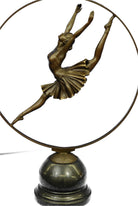 A prima ballerina puts on a show. Well trained in the art that she loves, she shows off her agility, balance and flexibility. She elevates her long leg far behind her. Her chest pushes out and her head tips up to the sky, basking in the glory of being center stage. Her spine curves, touching her back to her tutu. Her tutu spreads around her hips like a halo. Every movement is deliberate and structured, from the tips of her toes to the tips of her fingers. 100% bronze, this handmade brown patina sculpture was cast using the "Lost Wax Method" and mounted on a black marble base and is signed by artist Aldo Vitaleh.Bronze Dimensions with Marble Base:Height 20" X Width 15"
