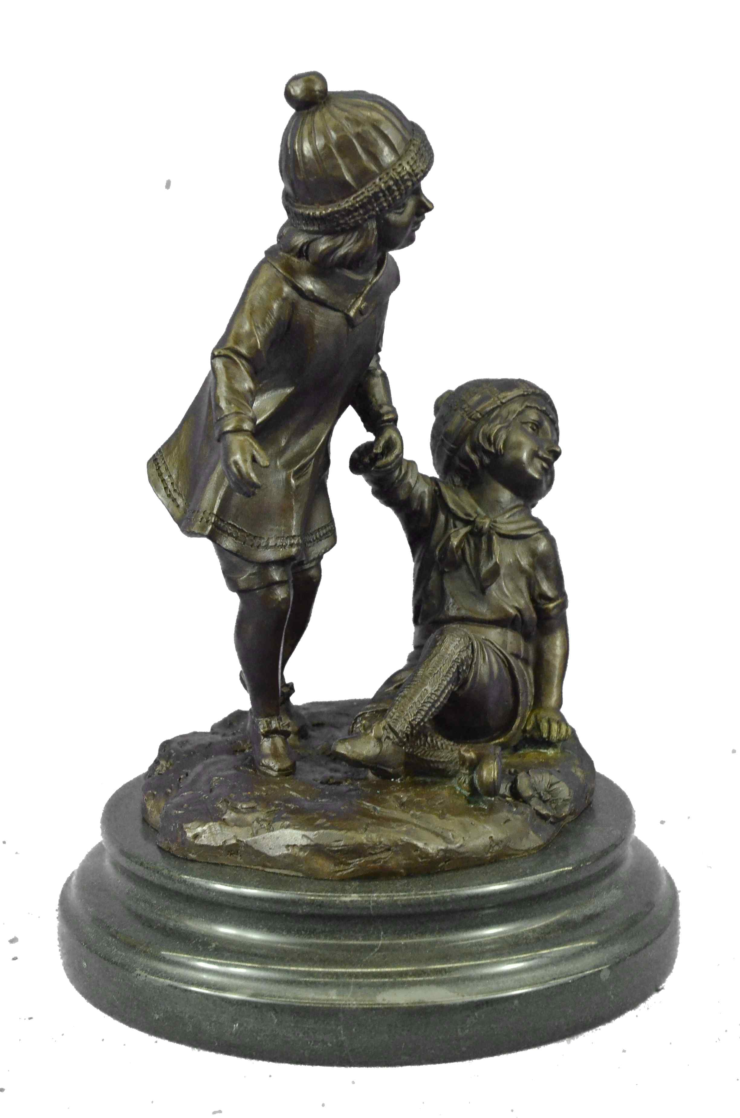 The sight of two Small Girls brings a smile to almost anyone`s face. Two girls sit on a flowery patch of land huddled close together. These little girls enjoy each other companion. A lovely sculpture that delights, this 100% bronze piece was crafted using the ancient lost wax method. It is set on a black marble base. It is signed D.H Chiparus.Original or Reproduction: Reproduction