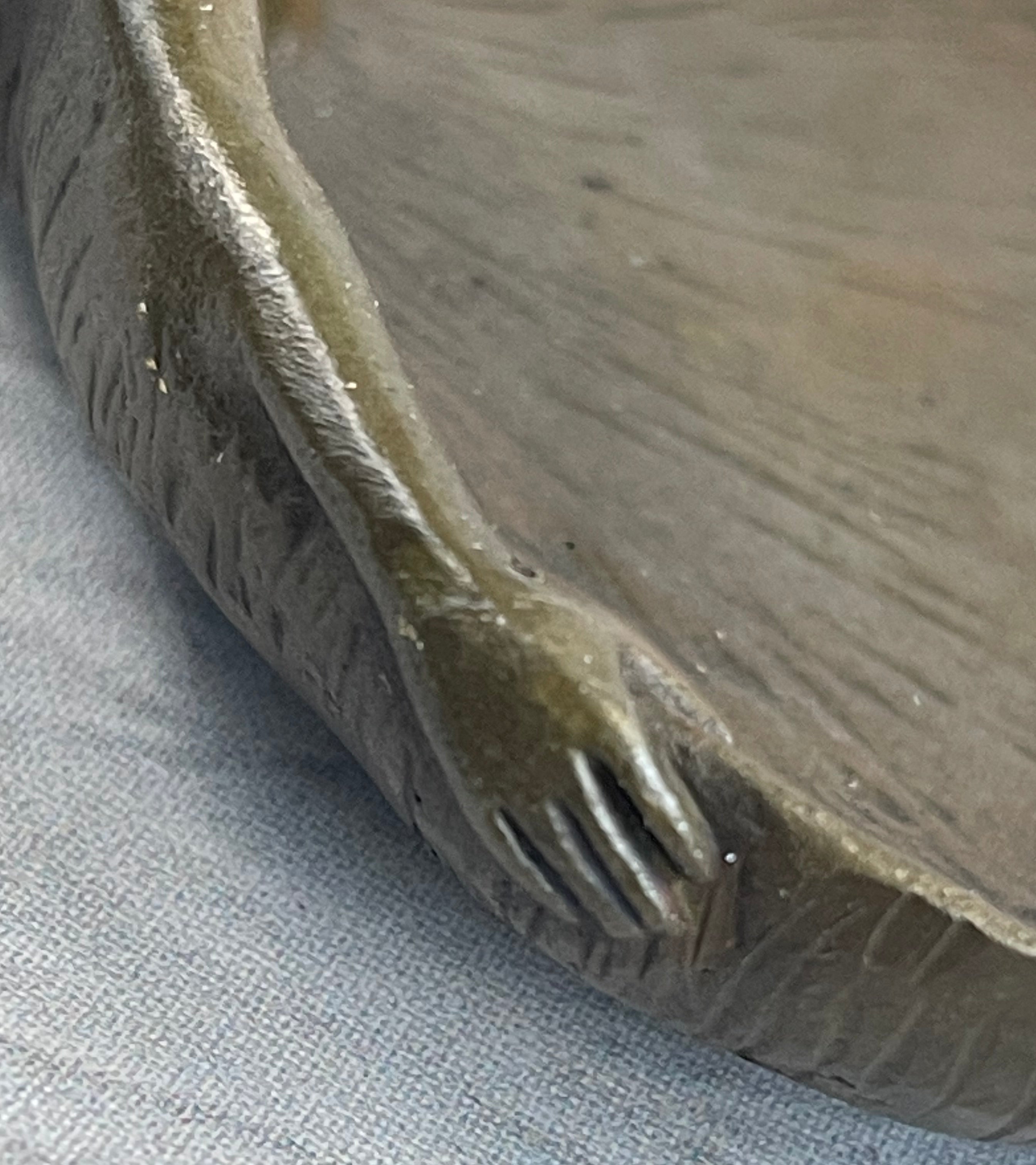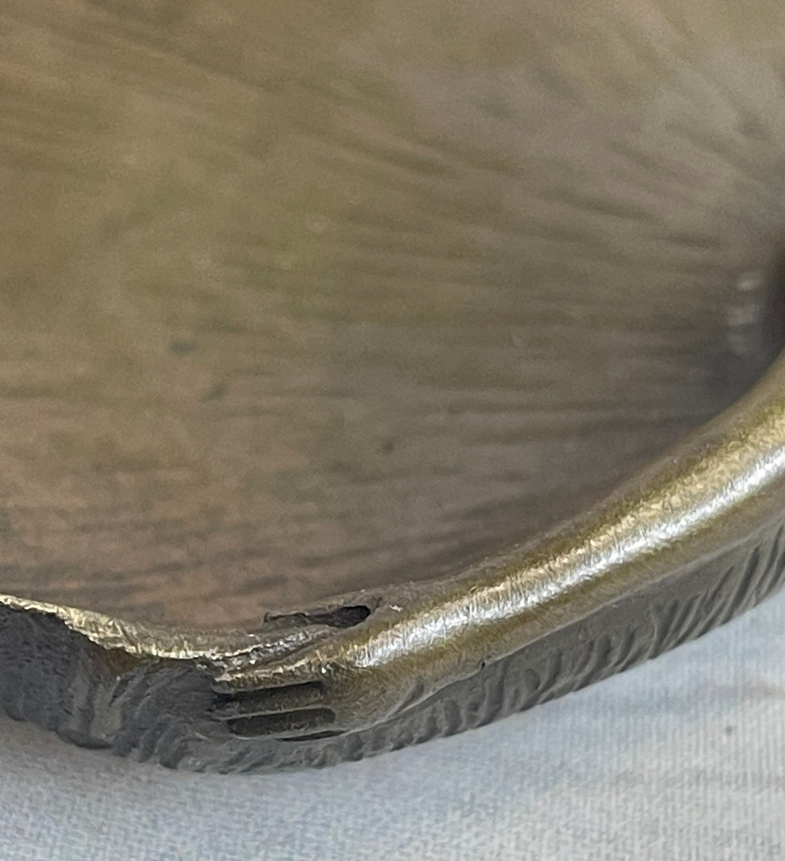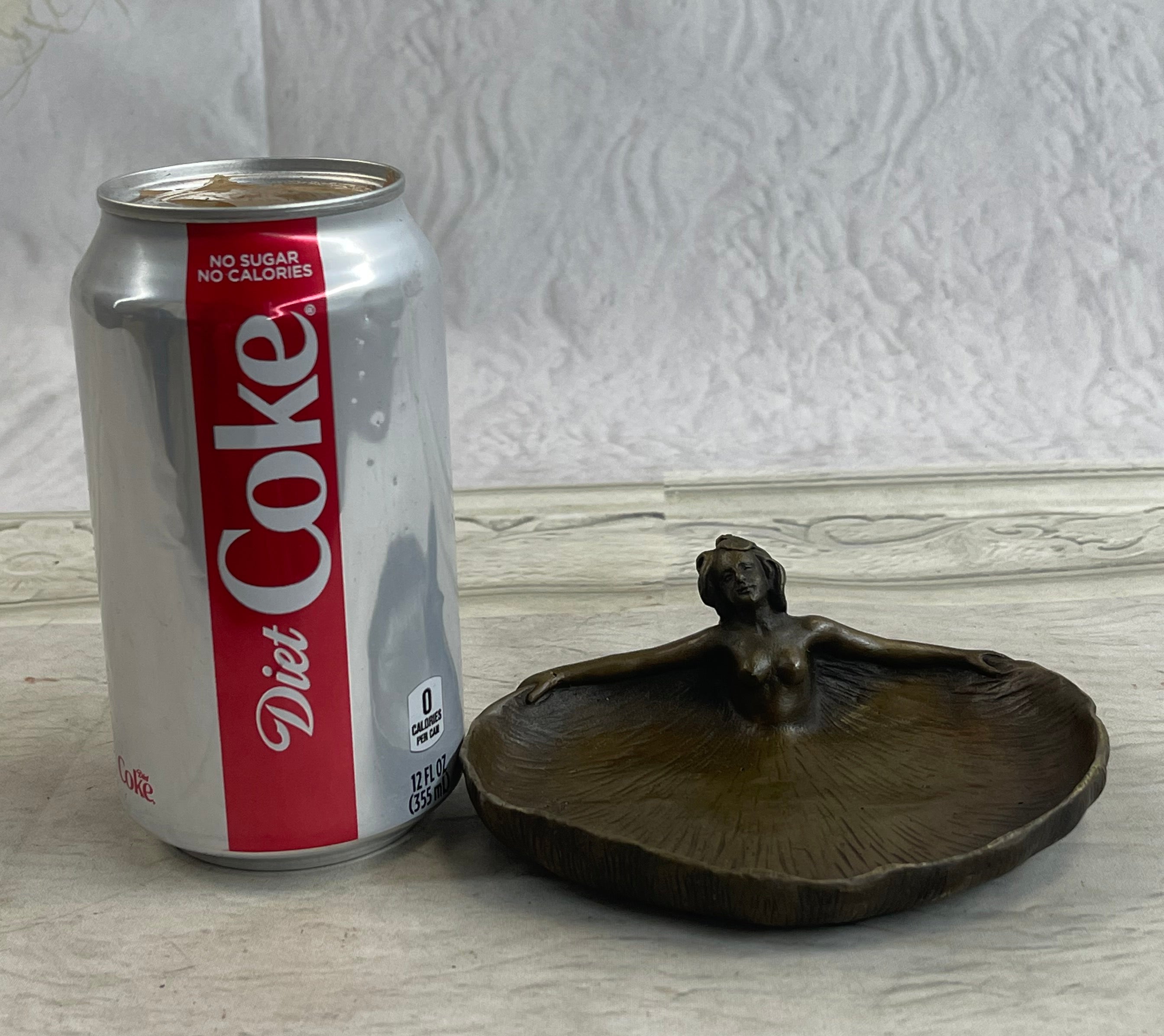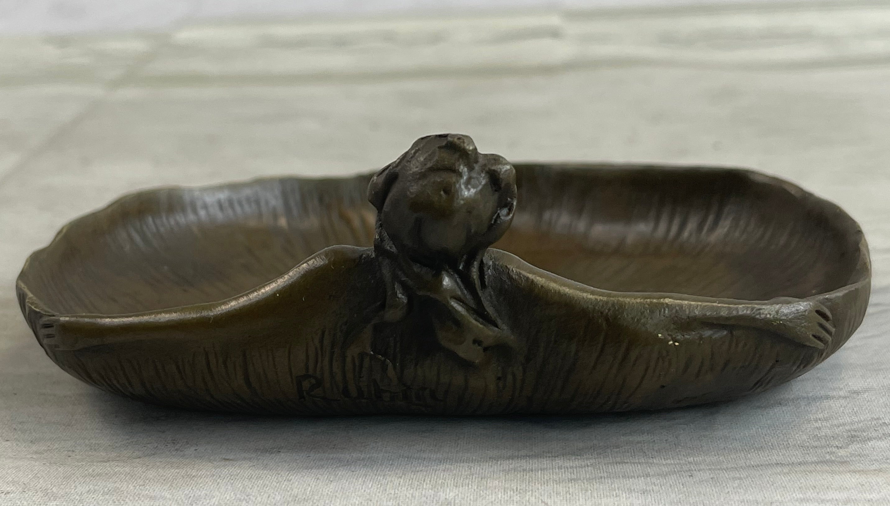 Whether displayed as a decorative dish or used as an ashtray, this bronze sculpture is sure to be a focal point of admiration. Its dual functionality, combined with the artistry of the patina and the artist's signature, makes it a perfect choice for collectors and enthusiasts of bronze sculpture. Add a touch of elegance and sophistication to your space with this beautiful, handcrafted piece that showcases the timeless beauty of real bronze.Bronze Dimensions: Height 2" X Width 5"