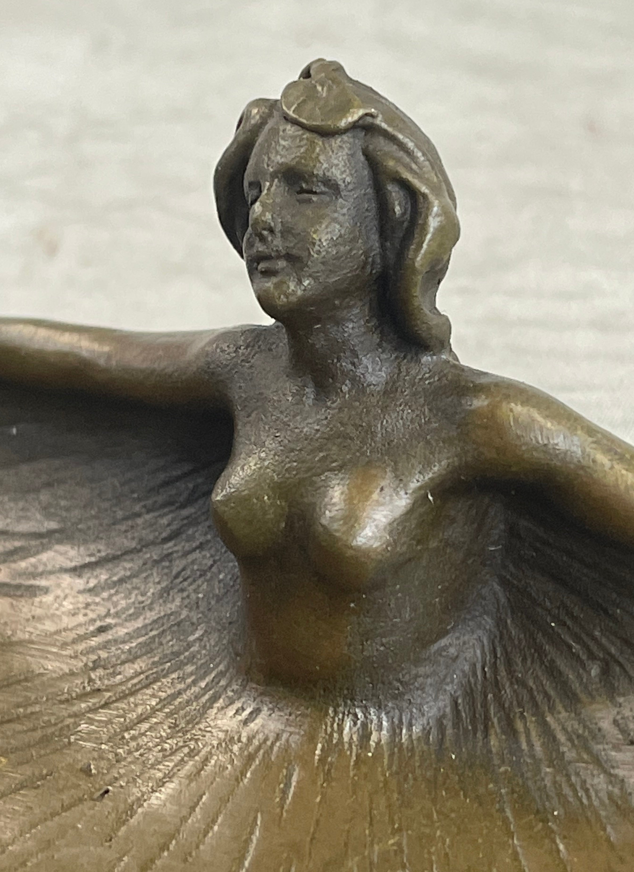 Enhance your space with this stunning bronze sculpture that seamlessly blends functionality with artistic beauty. This piece serves as both a functional dish and a captivating work of art, making it a unique addition to any room. The exquisite craftsmanship highlights the artist's attention to detail, ensuring that every curve and contour is perfectly rendered.