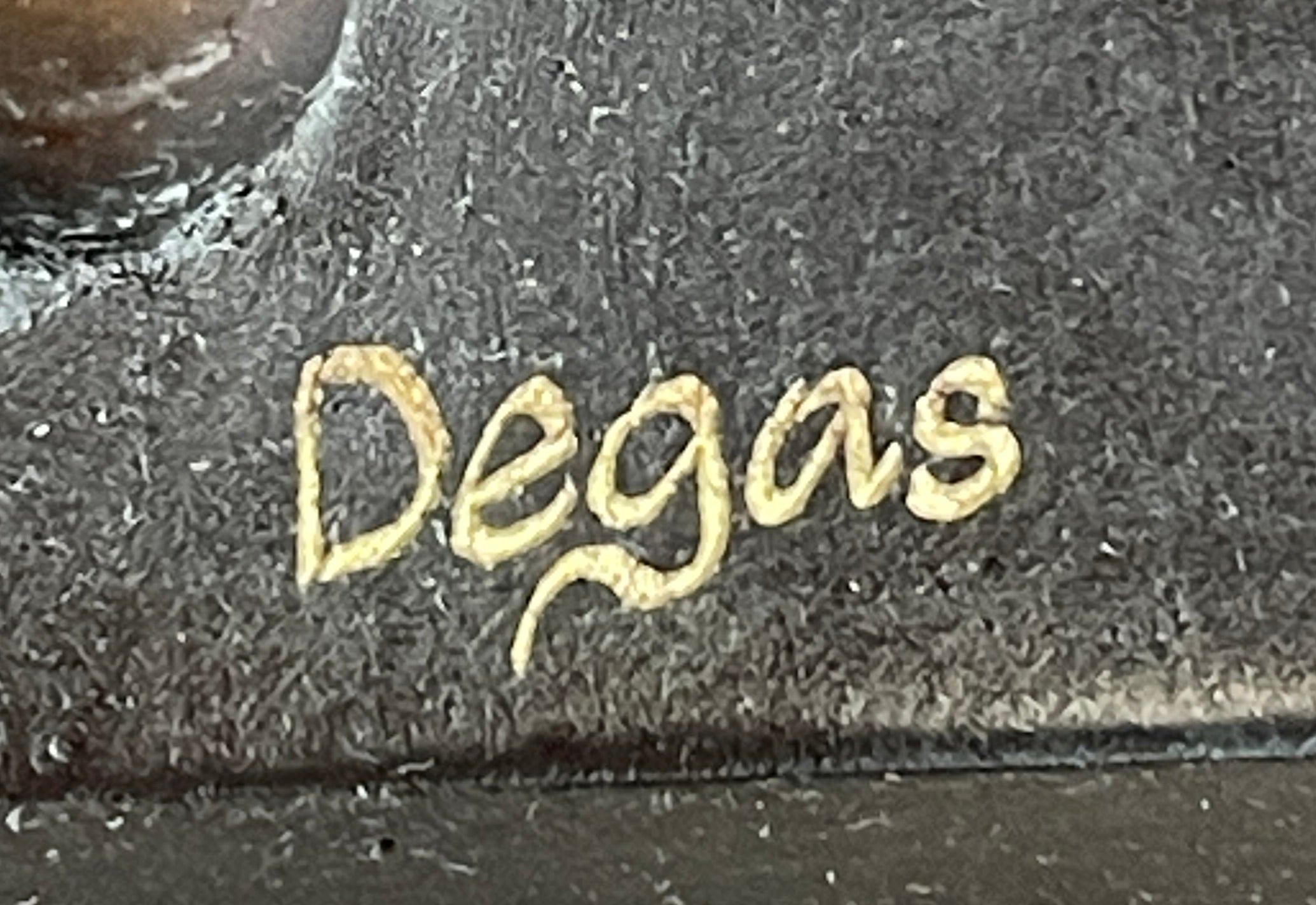 Attributed to the French artist Edgar Degas, hailed as a father of Impressionism and renowned for his depictions of ballerinas, this sculpture pays homage to his iconic style. Signed by Degas, it stands as a tribute to the artist's legacy and his ability to capture the fleeting moments of beauty in dance. The sculpture is mounted on a black marble base, enhancing its visual impact and providing a solid foundation for the artwork.