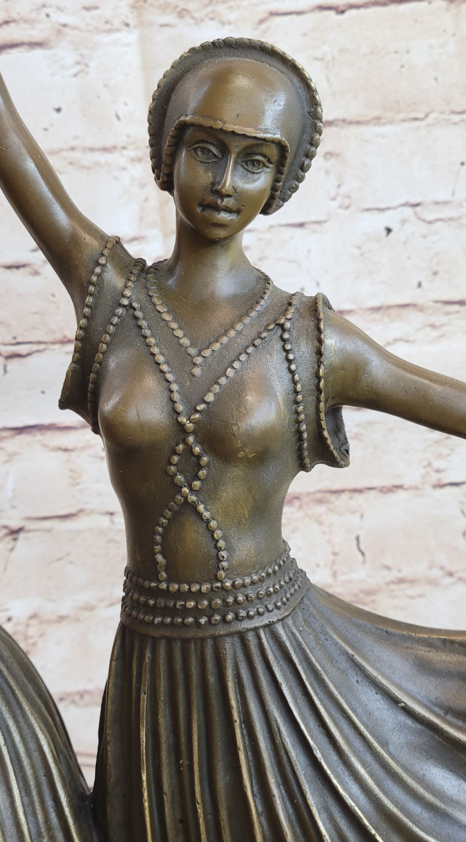 Elevate your home or office decor with this captivating bronze sculpture. Its timeless beauty and artistic craftsmanship make it a remarkable centerpiece. Whether displayed in a gallery, living room, or dance studio, it exudes elegance and charm. The combination of the exquisite bronze work and the solid black marble base creates a striking visual impact. This sculpture is a true testament to the mastery of D.H. Chiparus and an exceptional addition to any art collection.Bronze Dimensions with Marble Base: Height 22" X Width 16.5"