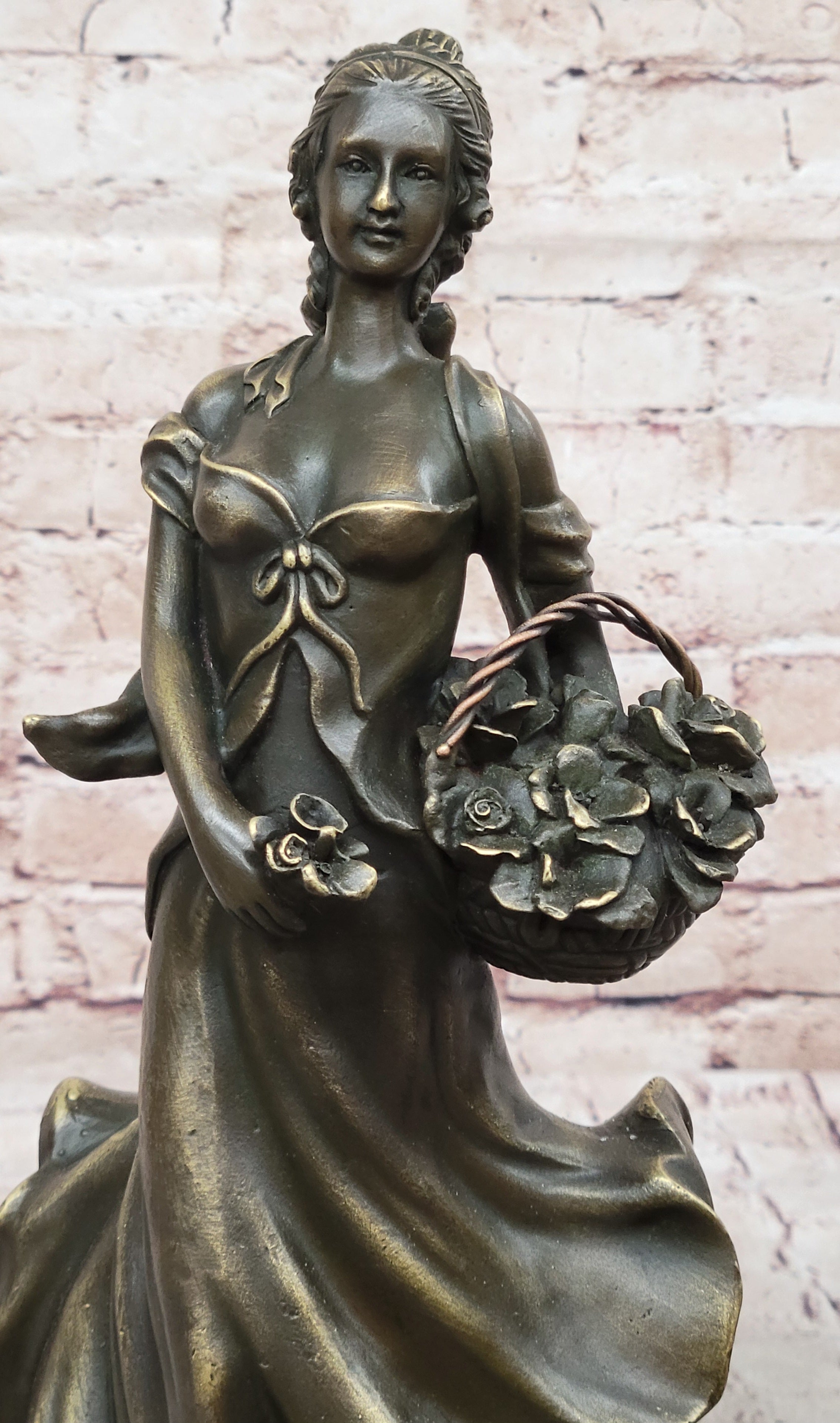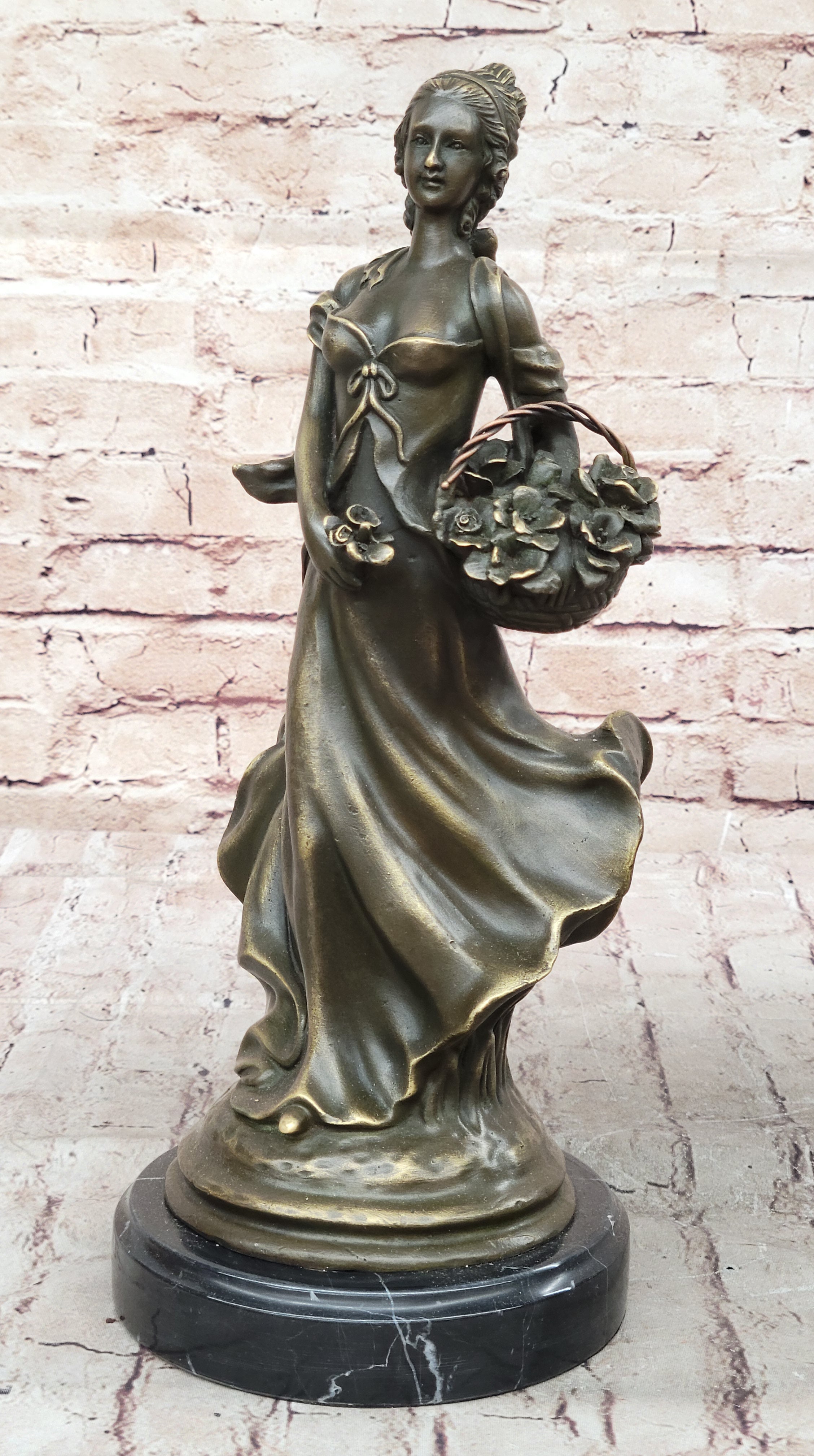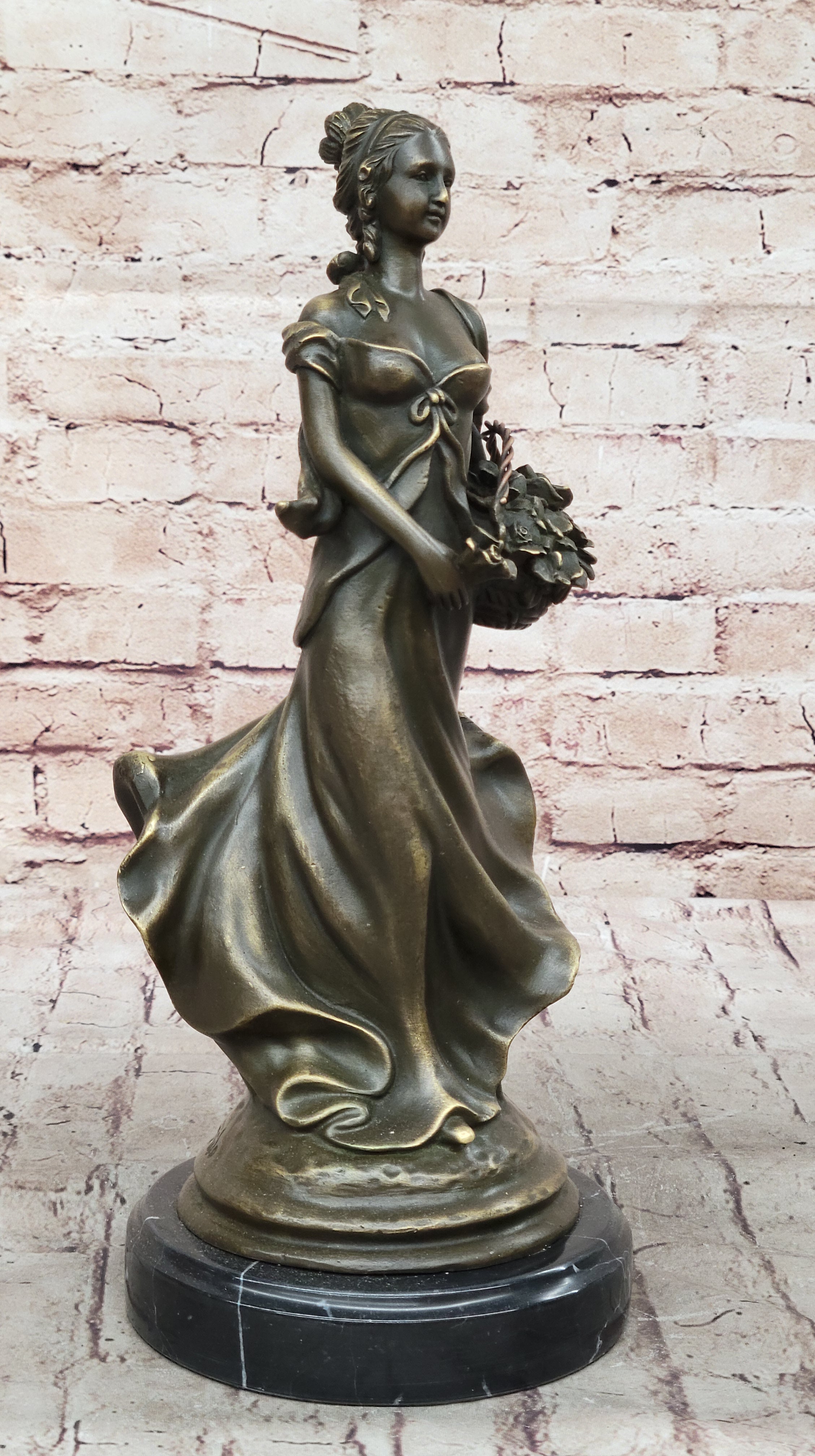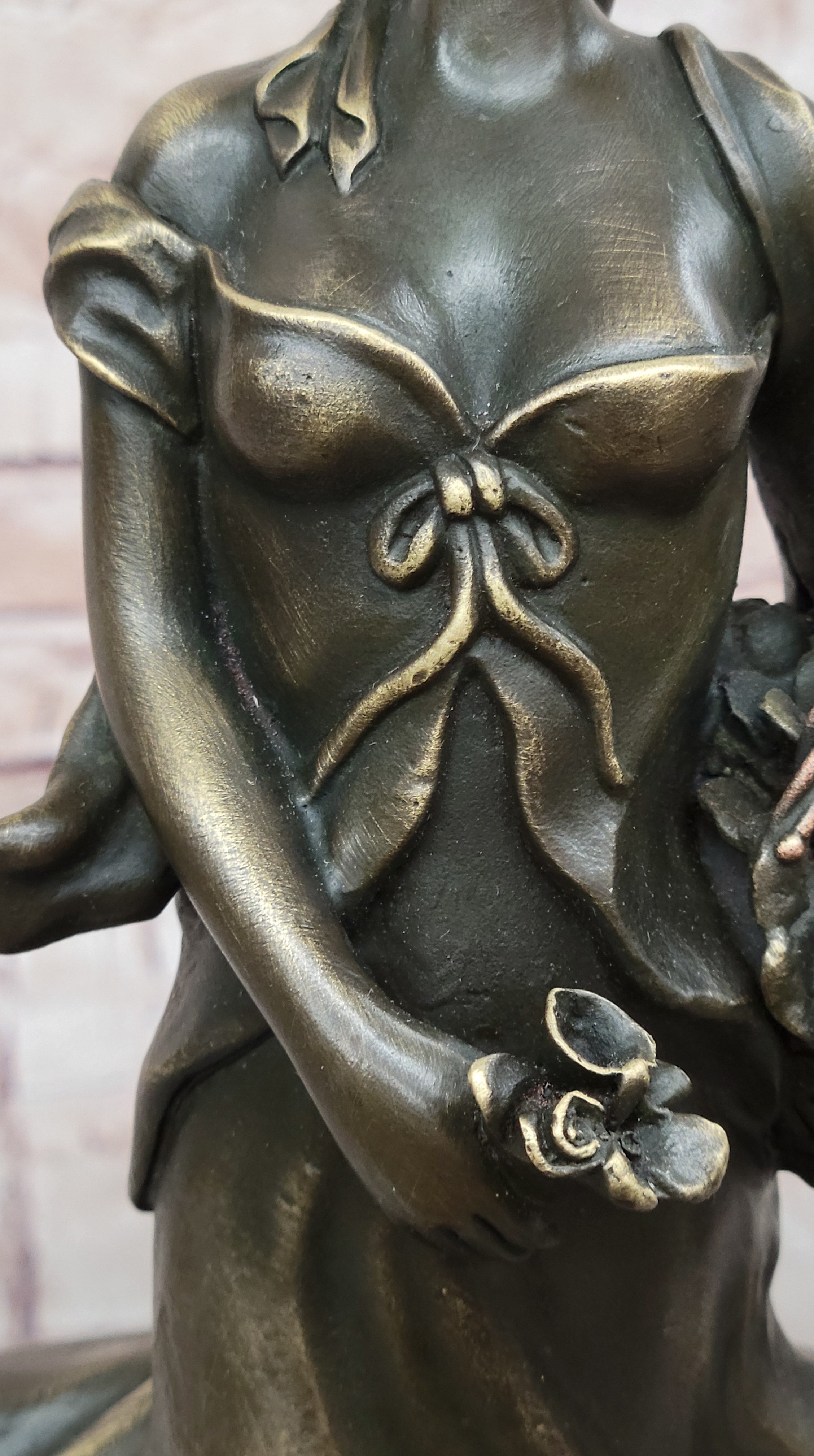 This exquisite bronze sculpture captures a pure maiden enjoying a peaceful afternoon stroll through the woods, taking in the serene beauty of nature. She pauses to gather a fresh bouquet of flowers, her graceful form depicted in a moment of quiet reflection. As she walks along the rough path, she clutches a stick to gently push away rocks from her bare feet, a small but endearing detail that adds to the lifelike quality of the piece. Her long dress clings elegantly to her curves, emphasizing both her femininity and her connection to the natural world around her.
