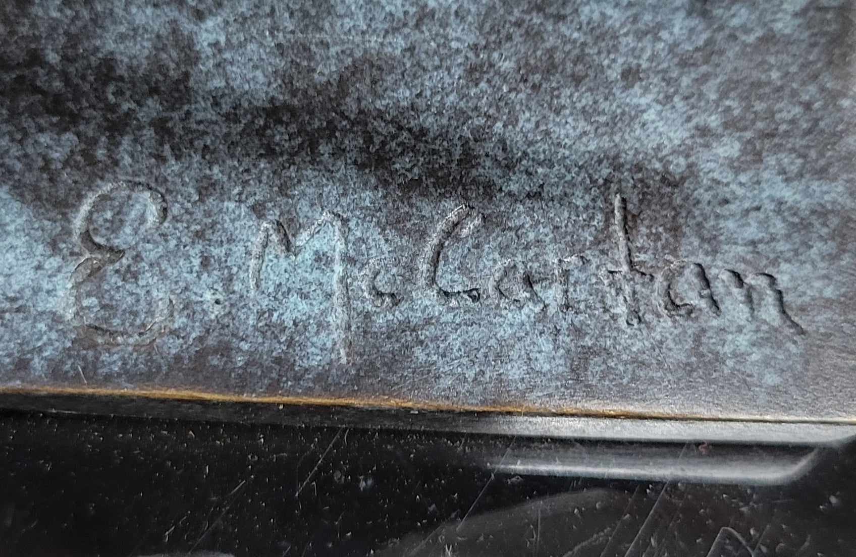 This Art Deco 1920s–style bronze sculpture depicts Diana the Huntress, accompanied by her loyal dogs, in a powerful and elegant composition inspired by classical mythology. Created in the refined Art Deco manner and attributed to Edward McCartan, the figure of Diana is portrayed nude with graceful strength, embodying independence, beauty, and authority. The balanced arrangement and stylized forms reflect the sophistication and decorative appeal characteristic of the Art Deco era.