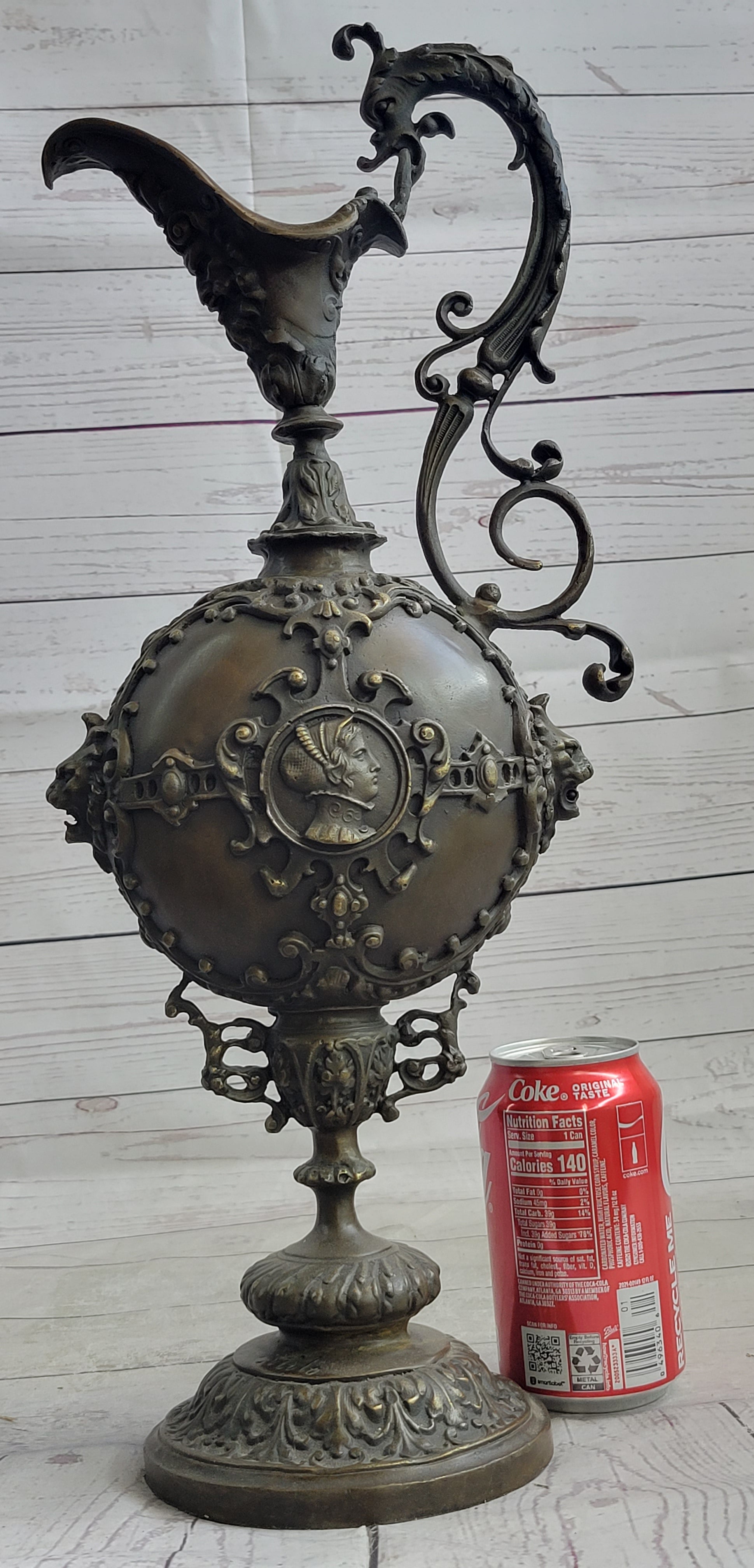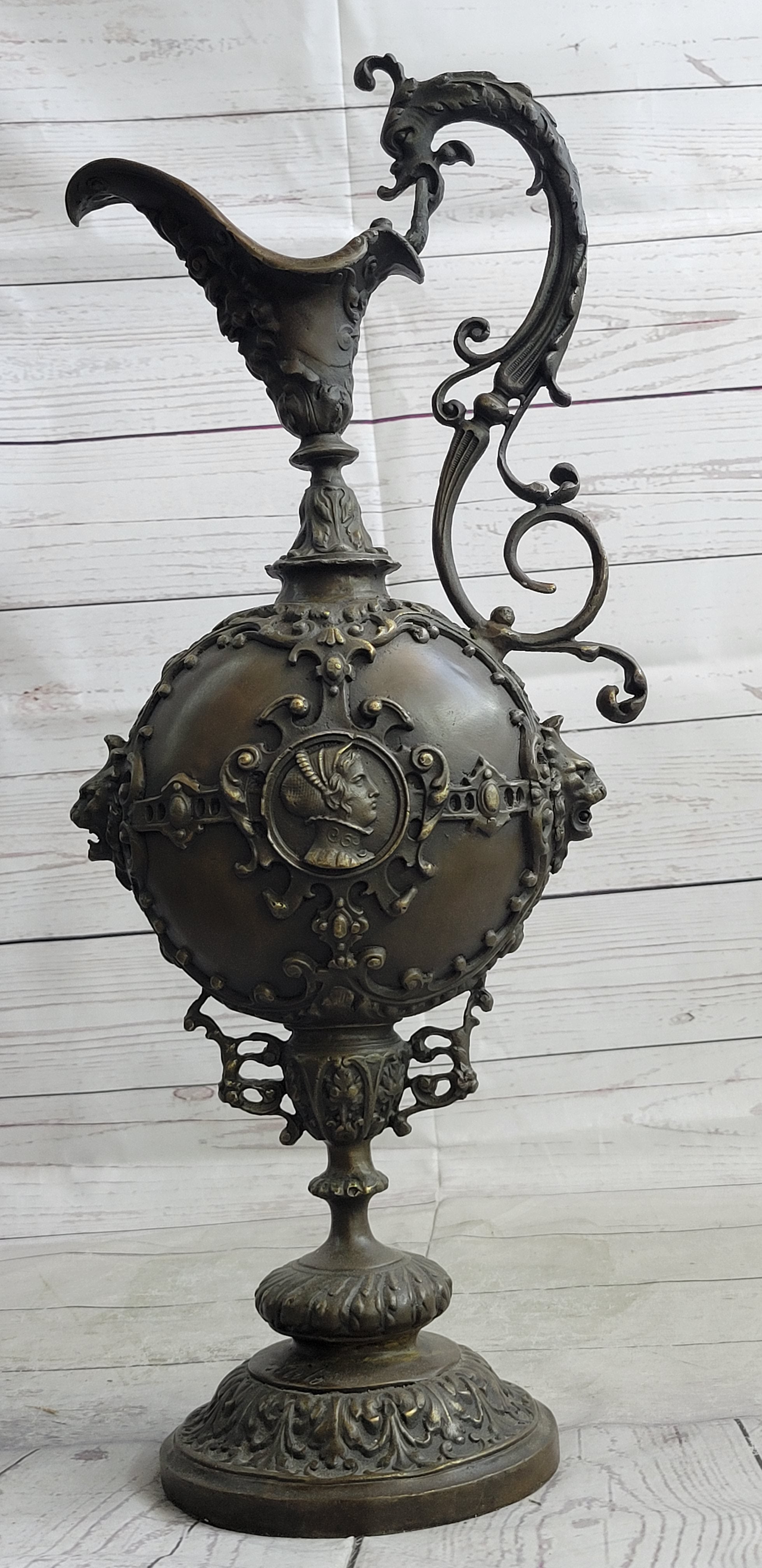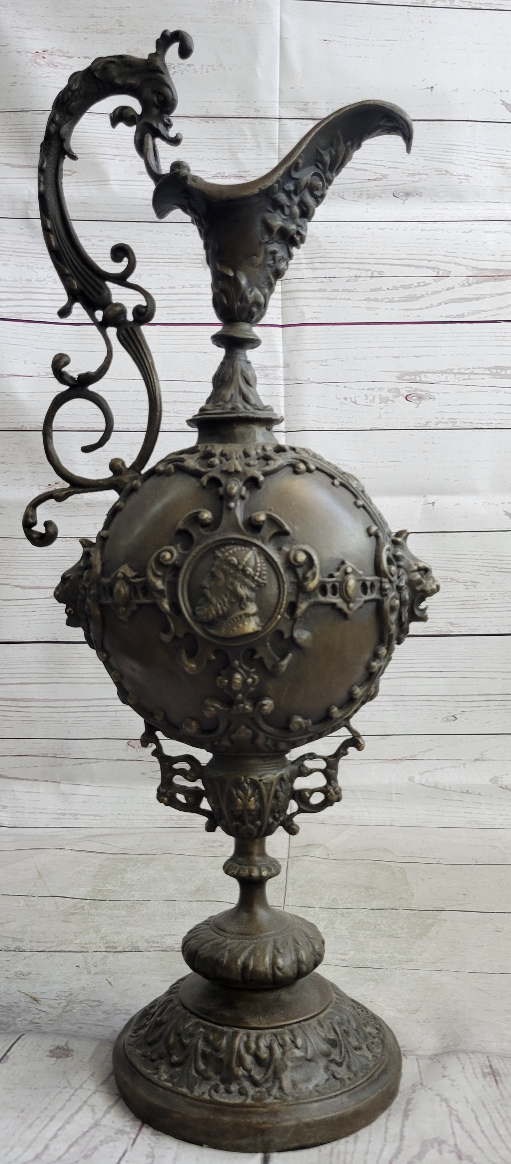 Add a regal touch to your decor with this stunning decorative bronze piece. Modeled after a vase, it features an elegant spout and an intricate swirl pattern that runs down its body, culminating in a majestic base. But what truly sets this piece apart is its ornate detailing. On one side, you'll find a beautifully sculpted head of a bearded king wearing a crown, while the other side features the head of a queen. The sides of the piece are adorned with fierce lion's heads, and the spout is topped with the grinning face of a bearded man.