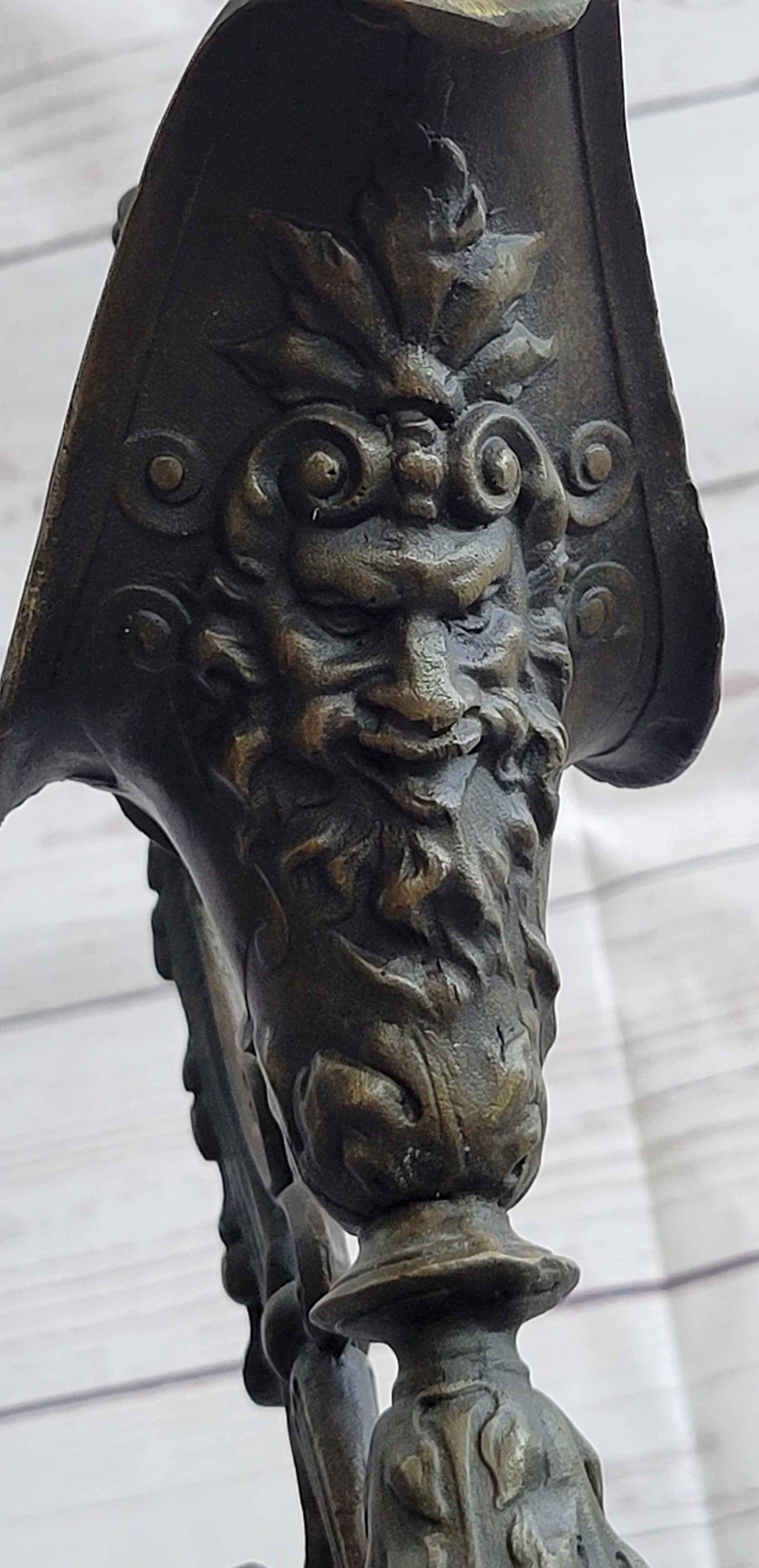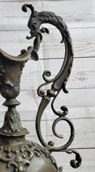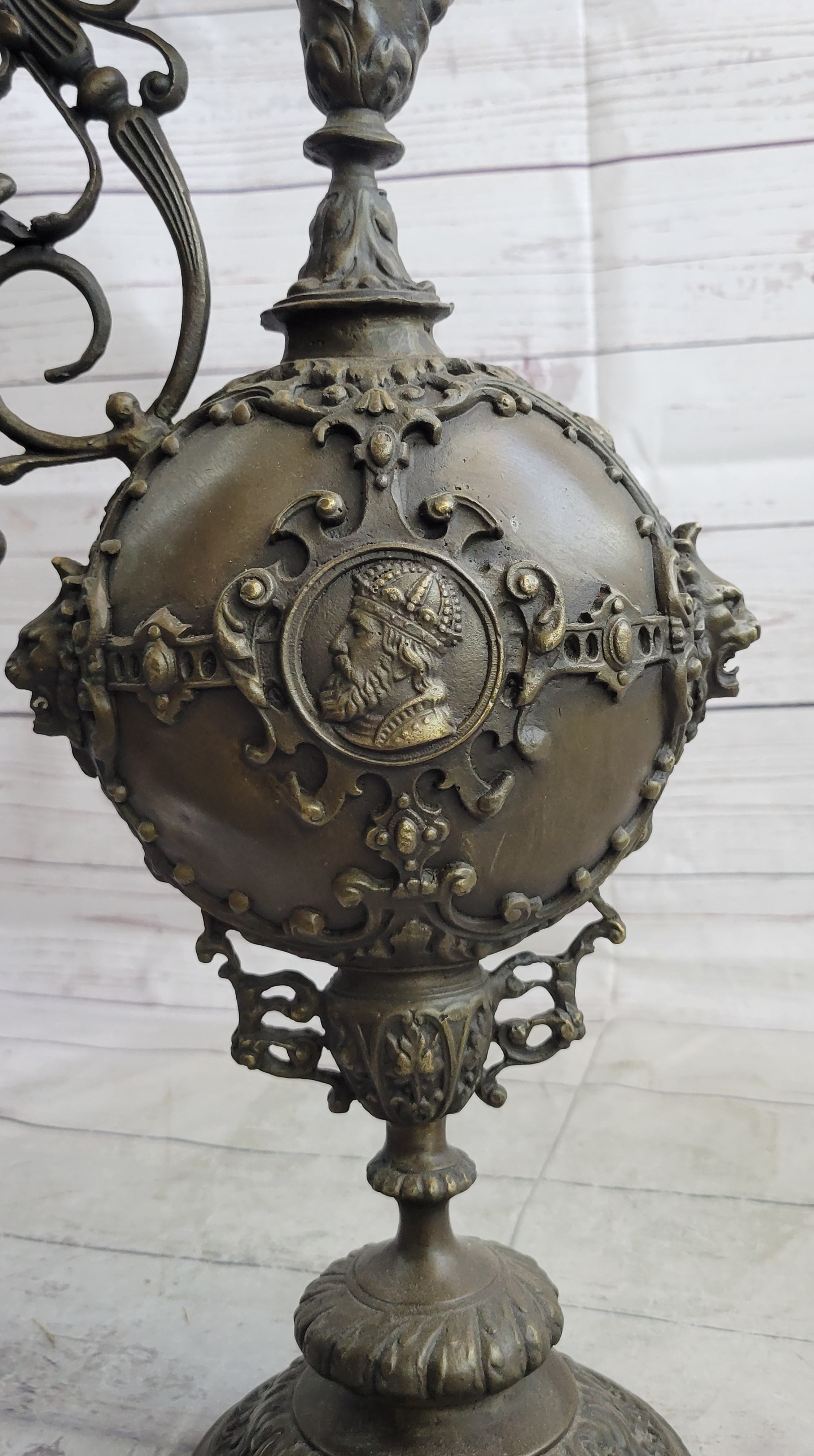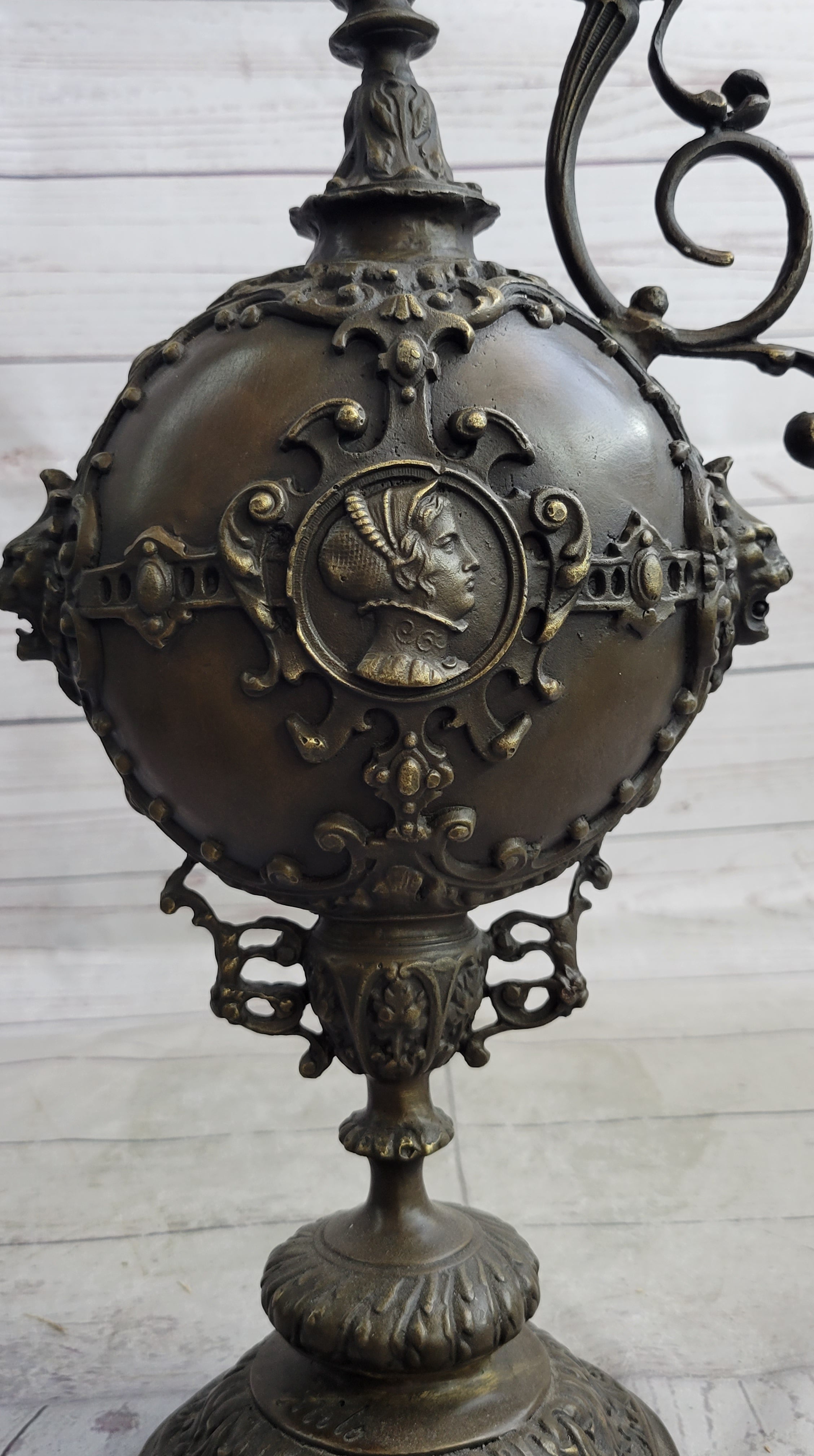 Add a regal touch to your decor with this stunning decorative bronze piece. Modeled after a vase, it features an elegant spout and an intricate swirl pattern that runs down its body, culminating in a majestic base. But what truly sets this piece apart is its ornate detailing. On one side, you'll find a beautifully sculpted head of a bearded king wearing a crown, while the other side features the head of a queen. The sides of the piece are adorned with fierce lion's heads, and the spout is topped with the grinning face of a bearded man.