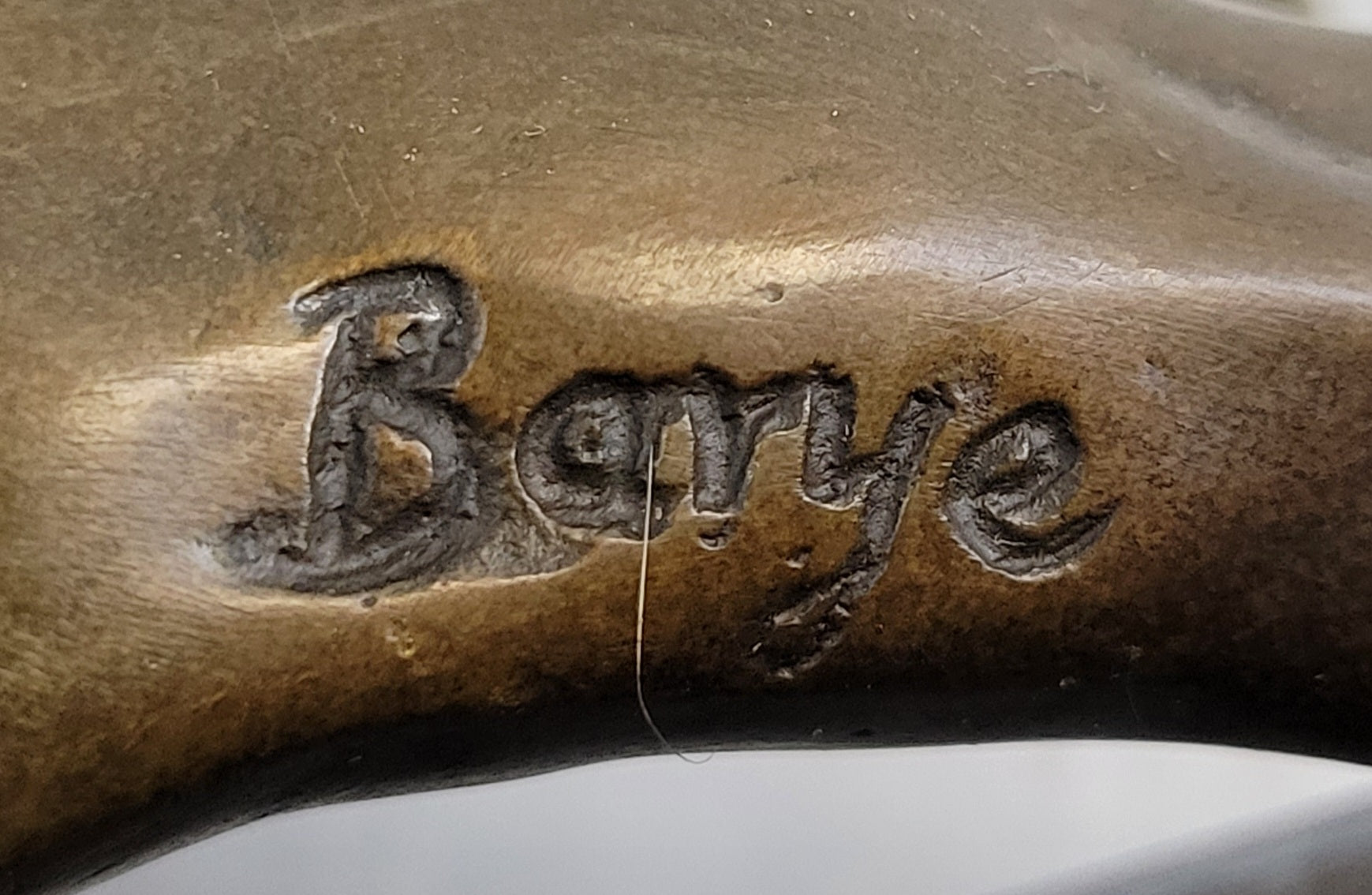 Handcrafted with unparalleled skill and artistry, this remarkable bronze sculpture captures the essence of the Cougar, also known as the Mountain Lion, with stunning authenticity. Created using the esteemed lost wax method, the sculpture stands as a testament to the intricate craftsmanship involved in its production. Every detail, from the powerful stance of the Cougar to its intricate facial features, is meticulously rendered, showcasing the artist's dedication to capturing the spirit of this majestic creature. Mounted on a sleek black marble base, this genuine bronze statue exudes a timeless elegance, accentuated by its exquisite brown patina finish. The contrast between the dark marble and the rich patina amplifies the sculpture's allure, emphasizing the Cougar's commanding presence and natural beauty. Signed by the renowned artist Barye, this masterpiece is a testament to the artist's skill and reverence for the intrinsic power and grace of the Mountain Lion. This genuine bronze sculpture is a must-have for any wildlife enthusiast or art connoisseur, serving as a striking representation of the Cougar's strength and resilience in the face of nature's challenges. Whether displayed in a home or office setting, this sculpture will undoubtedly evoke admiration and appreciation for the extraordinary beauty of the animal kingdom.