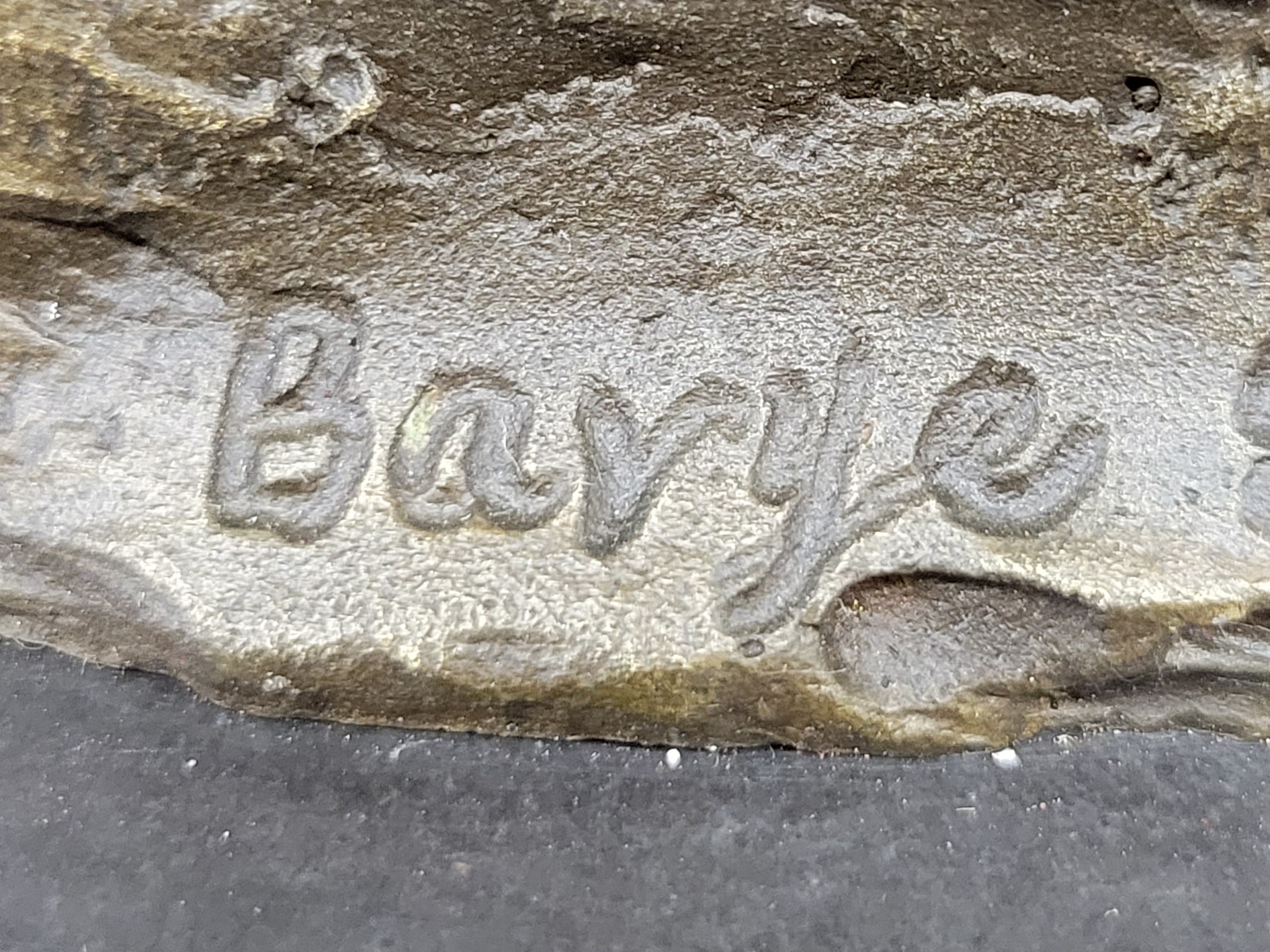 Crafted using the revered "Lost Wax Method," the sculpture undergoes a traditional casting process that ensures exceptional detail. The rich brown patina finish accentuates its natural beauty and timeless appeal. Mounted on a sturdy marble base, this piece stands as a symbol of the lion's indomitable spirit and serves as a stunning tribute to the majestic species. Signed by Barye, it adds a touch of artistic prestige to this remarkable masterpiece.Bronze Dimensions with Marble Base: Height 13" X Width 6"