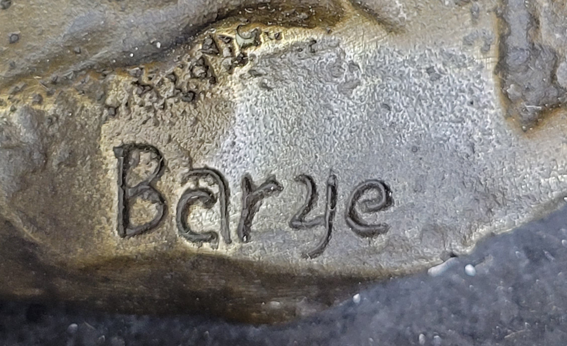 Immerse yourself in the captivating encounter between a majestic male lion and a venomous serpent with this stunning bronze sculpture. The powerful lion asserts its dominance as it crouches down, emitting a fierce roar that intimidates the snake in a tense stand-off. Every intricate detail, from the lion's magnificent mane to the texture of the serpent's scales, has been meticulously captured in bronze using the traditional lost-wax casting technique. The craftsmanship of this sculpture is truly remarkable, showcasing the skill and artistry of the sculptor. Finished with a rich brown patina, the sculpture not only enhances its visual appeal but also ensures its long-lasting quality. Mounted on a sleek black marble base, the sculpture exudes elegance and serves as a striking centerpiece in any space. It proudly bears the signature of the renowned artist Barye, adding to its authenticity and collectible value. This sculpture is a perfect choice for animal enthusiasts, art lovers, and those who appreciate the intricate beauty and power of the natural world. Elevate your decor with this exquisite bronze masterpiece and be captivated by the dynamic energy and symbolism that it brings to your home, office, or art collection.
