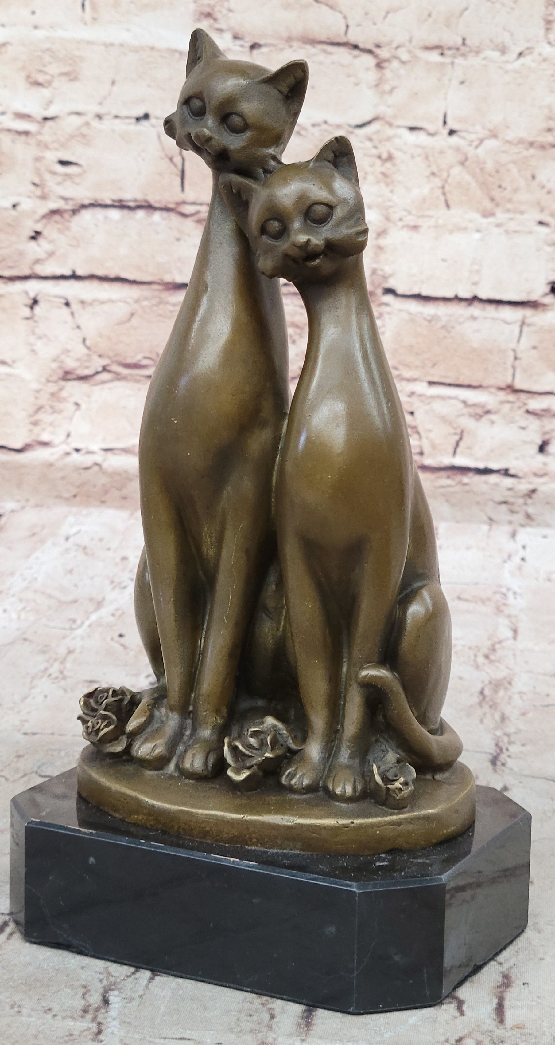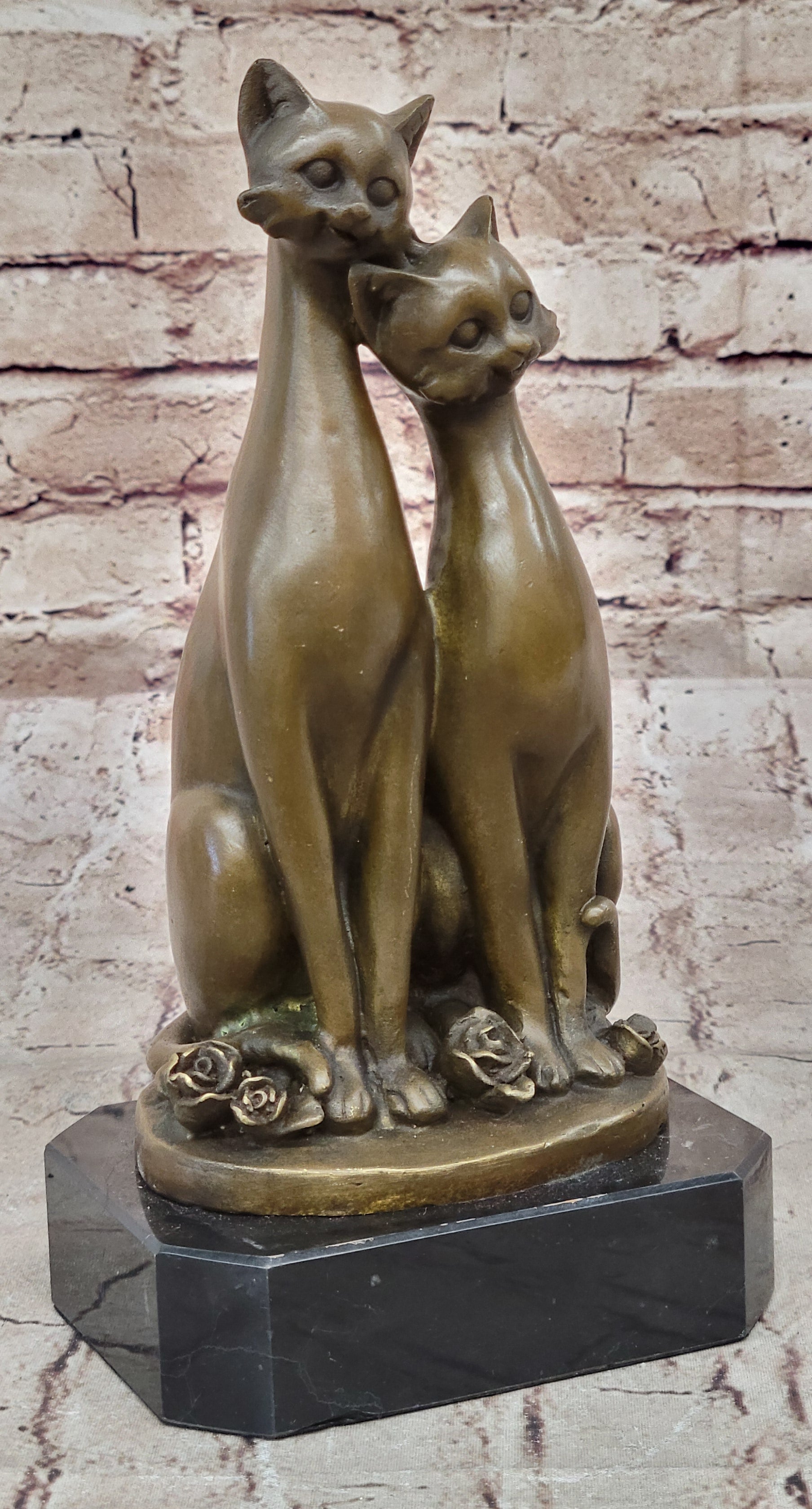 This captivating bronze sculpture depicts a pair of slender cats sitting side by side, their bodies emanating a sense of grace and tranquility. With their saucer-like eyes and gentle purring, they exude an aura of contentment and serenity. Delicate rose buds scatter on the ground beneath their dainty paws, creating a whimsical atmosphere that adds to the charm of the scene.