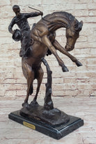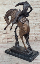 Invite the spirit of the Wild West into your space with this remarkable Remington bronze sculpture. Whether displayed in a home, office, or art gallery, it serves as a captivating tribute to the bravery, skill, and indomitable spirit of the cowboys who mastered the art of bronco riding.Bronze Dimensions with Marble Base: Height 20" X Width 20"