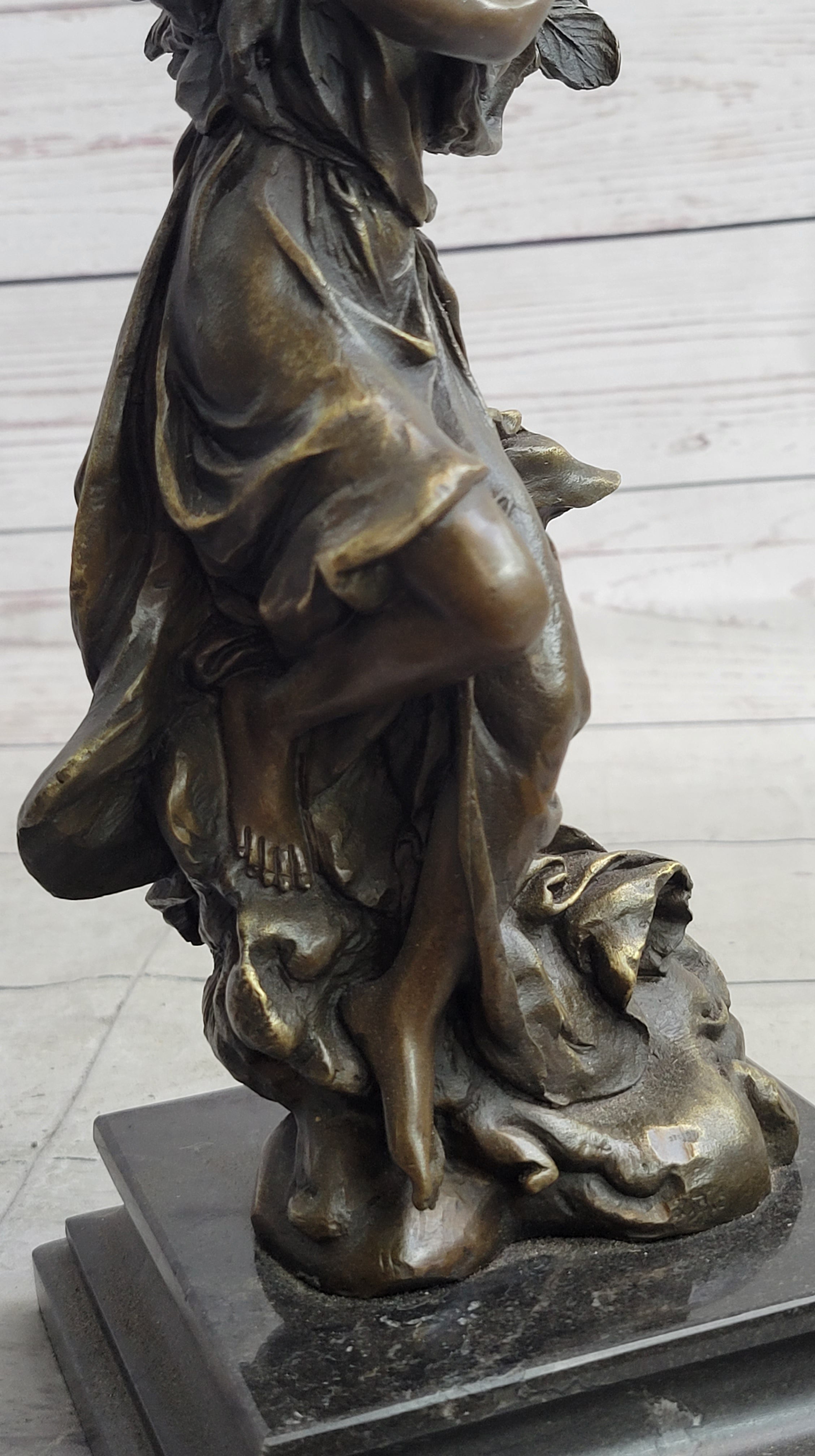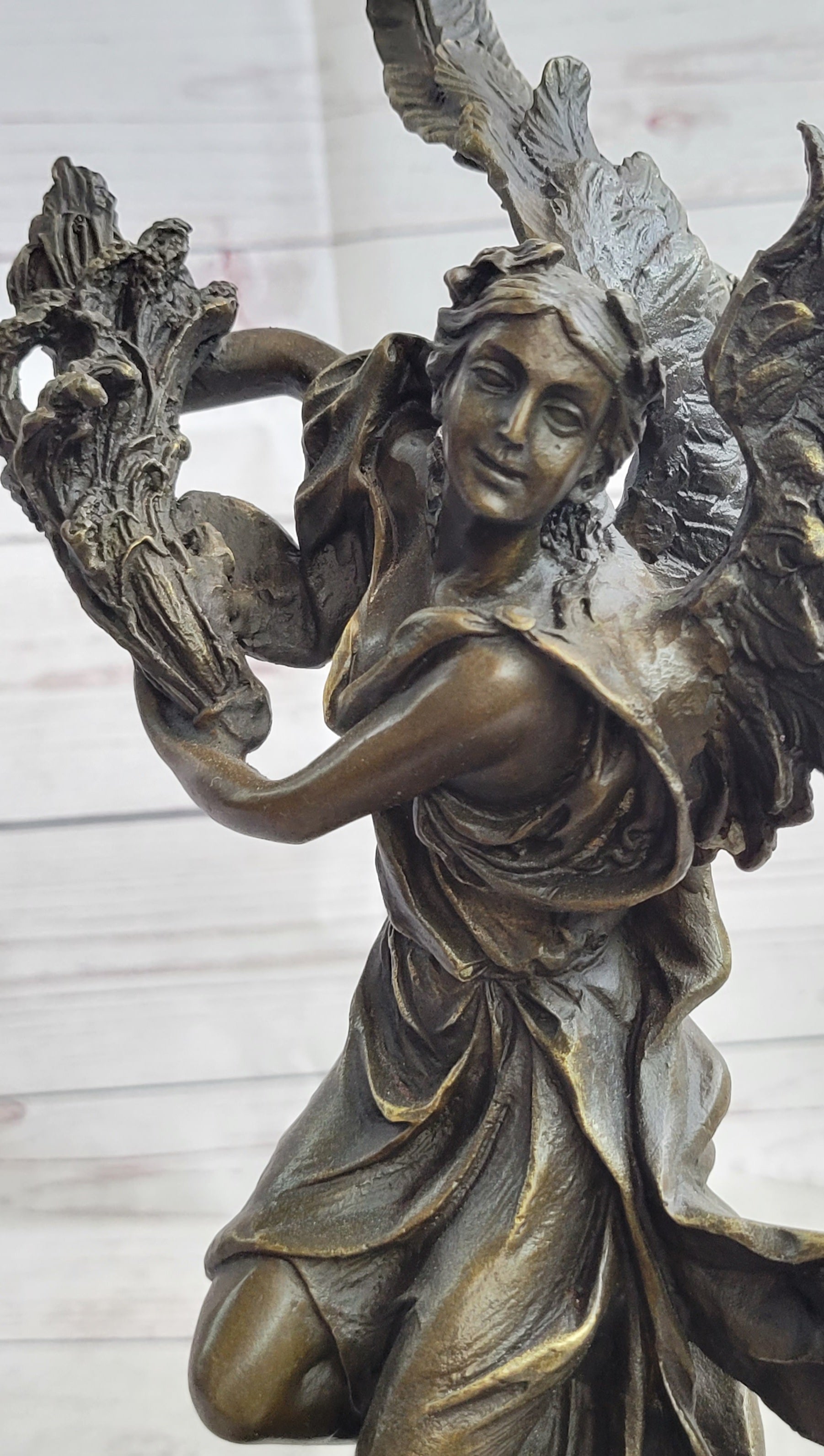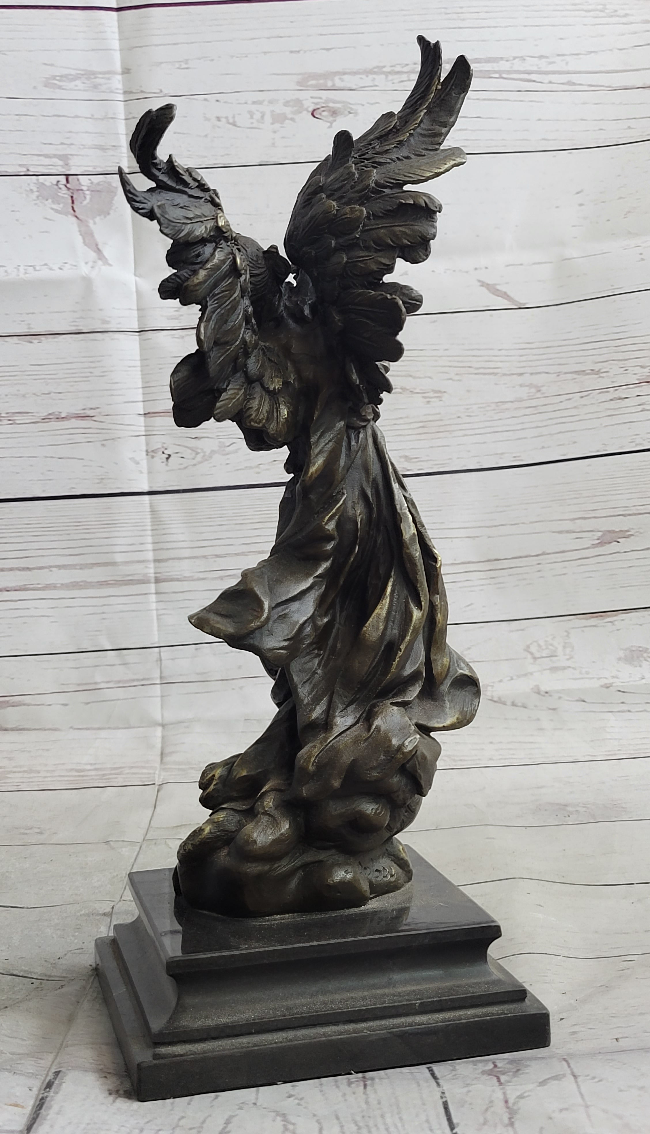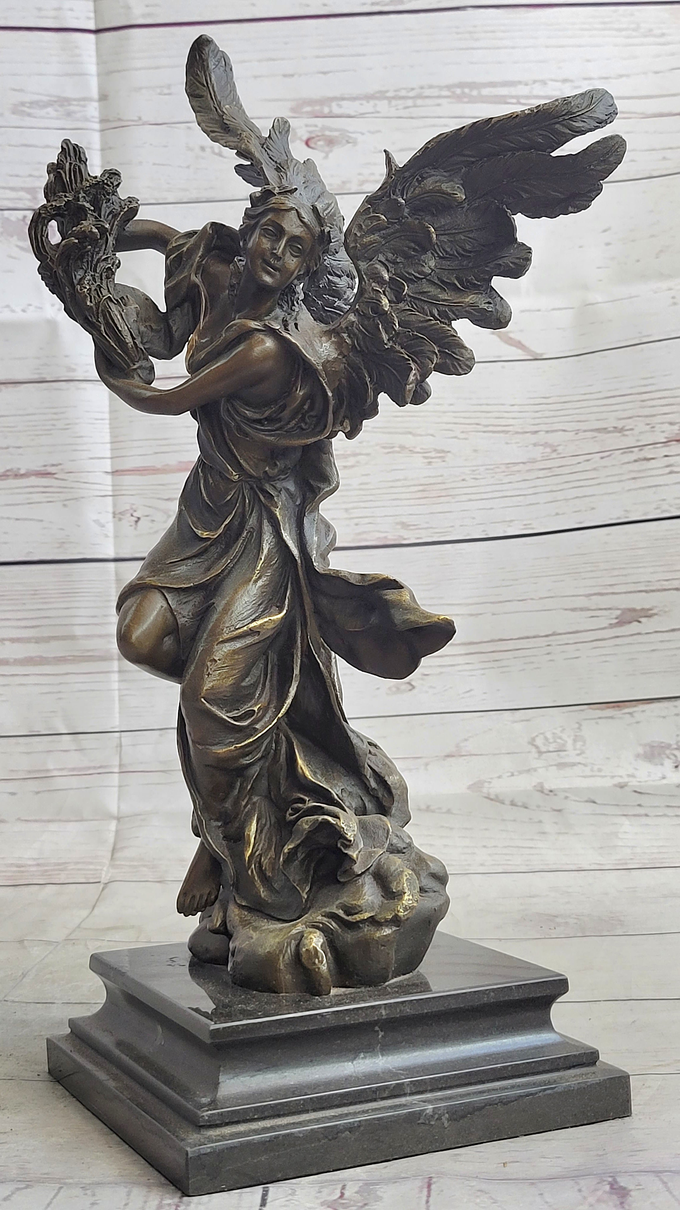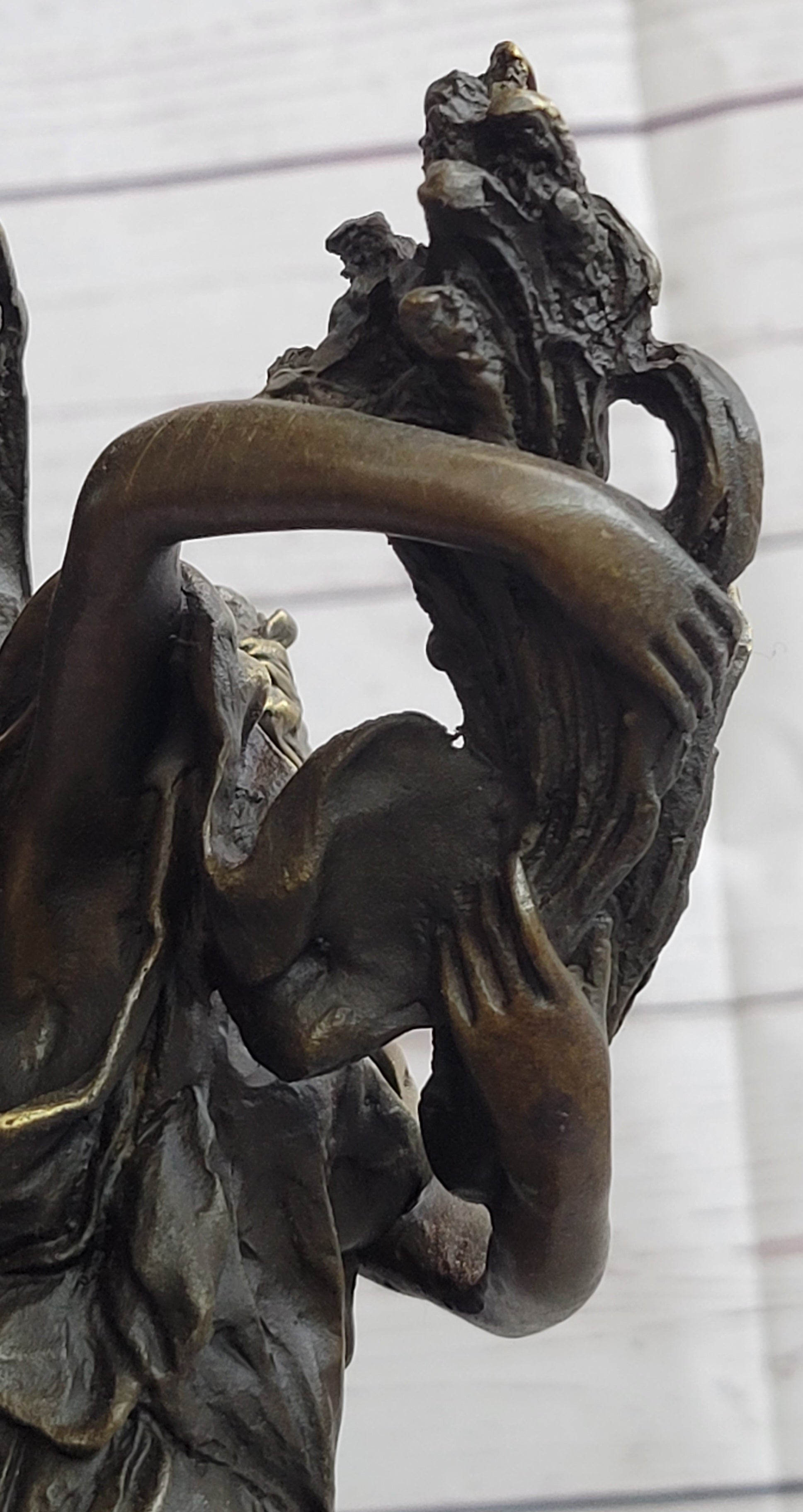 This exquisite bronze sculpture captures the beauty and grace of an angel holding a bundle of wheat. With intricately detailed wings and a serene expression, this statue radiates a sense of peace and spirituality. The angel's flowing gown and delicate features are expertly crafted, showcasing the artist's skill and attention to detail. Resting on a sturdy marble base, this bronze statue is a stunning addition to any home decor. Signed by the renowned artist Dalou, it is a true masterpiece and a thoughtful gift for any angel enthusiast or art collector. Elevate your space with the timeless elegance of this bronze angel statue. Symbolizing abundance and fertility, the angel's gesture of holding a bundle of wheat represents prosperity and blessings. The bronze sculpture is meticulously crafted using the lost-wax method, ensuring its fine quality and authenticity. Its warm patina adds depth and richness to the piece, highlighting the intricate textures and contours. Whether displayed on a mantel, shelf, or as a centerpiece, this angel statue brings a sense of harmony and spiritual inspiration to any environment. Experience the enchanting presence of this winged woman angel figurine in your home. With her ethereal beauty and graceful posture, she captivates the viewer and evokes a sense of wonder. The bronze sculpture stands on a marble base, providing stability and a touch of sophistication. Crafted by the talented artist Dalou, this statue is a true testament to his artistic vision and craftsmanship. Whether as a focal point in your living room or a cherished gift for a loved one, this bronze angel statue is sure to leave a lasting impression and become a cherished symbol of hope and serenity.