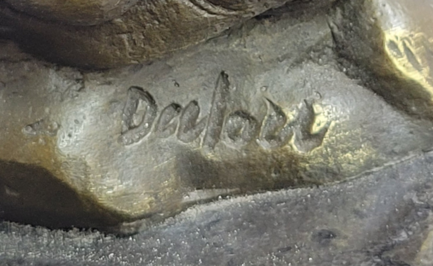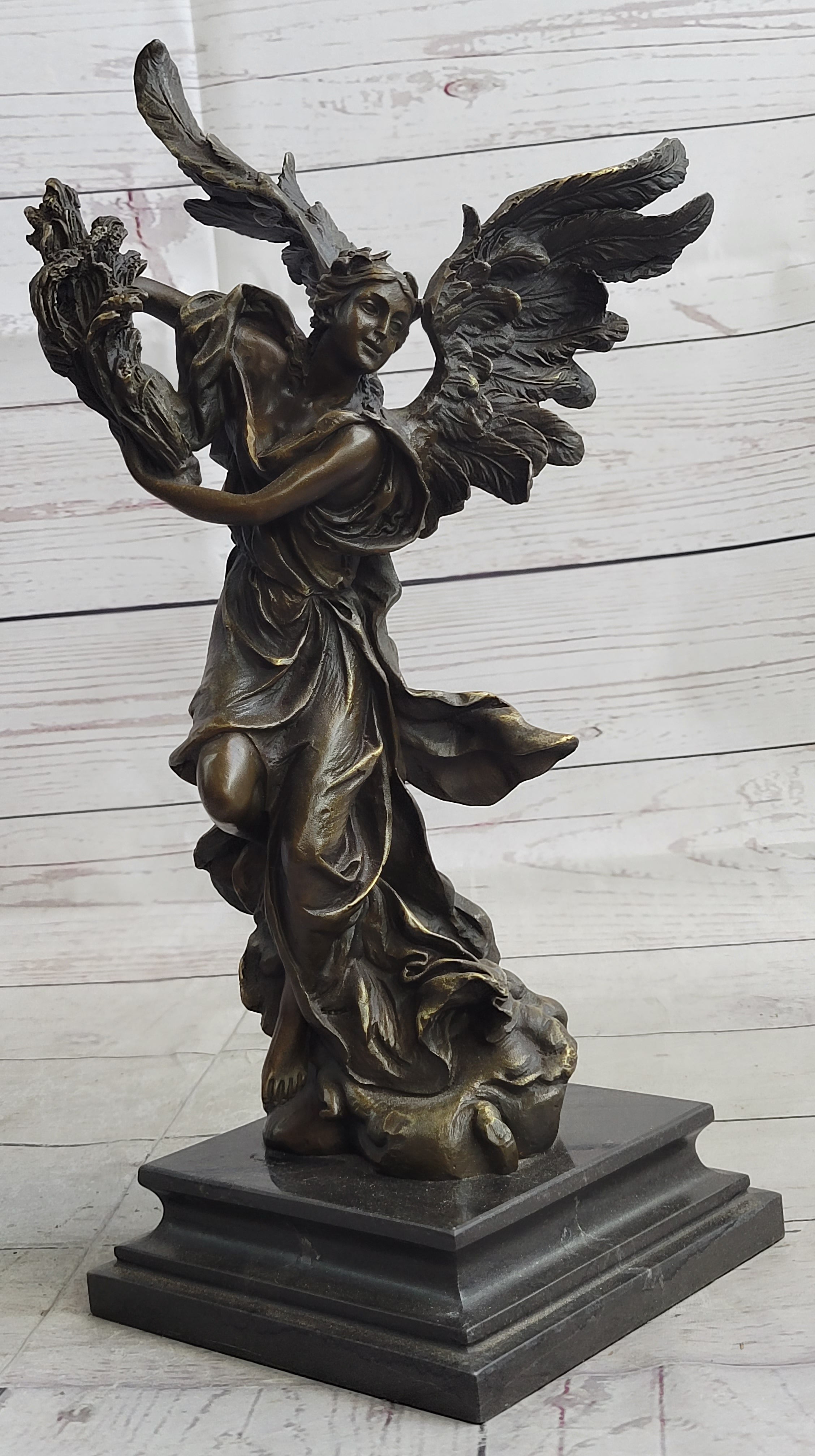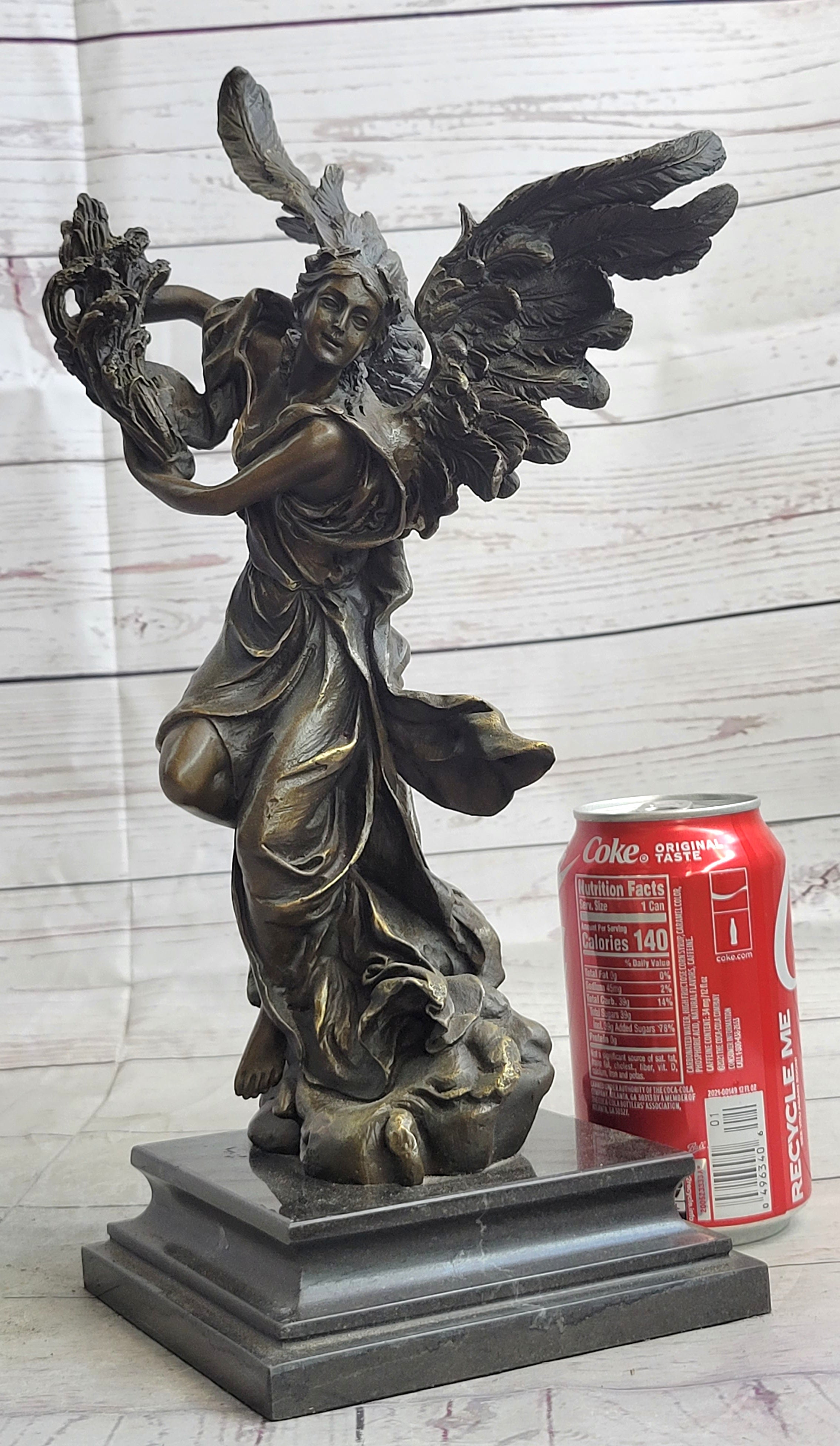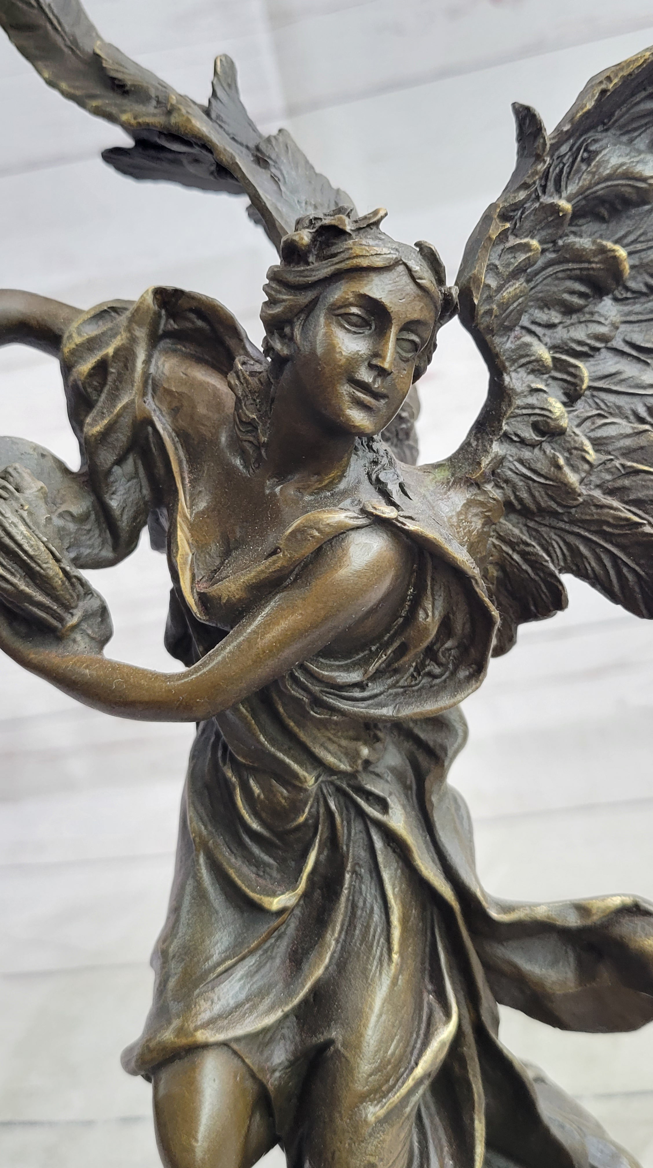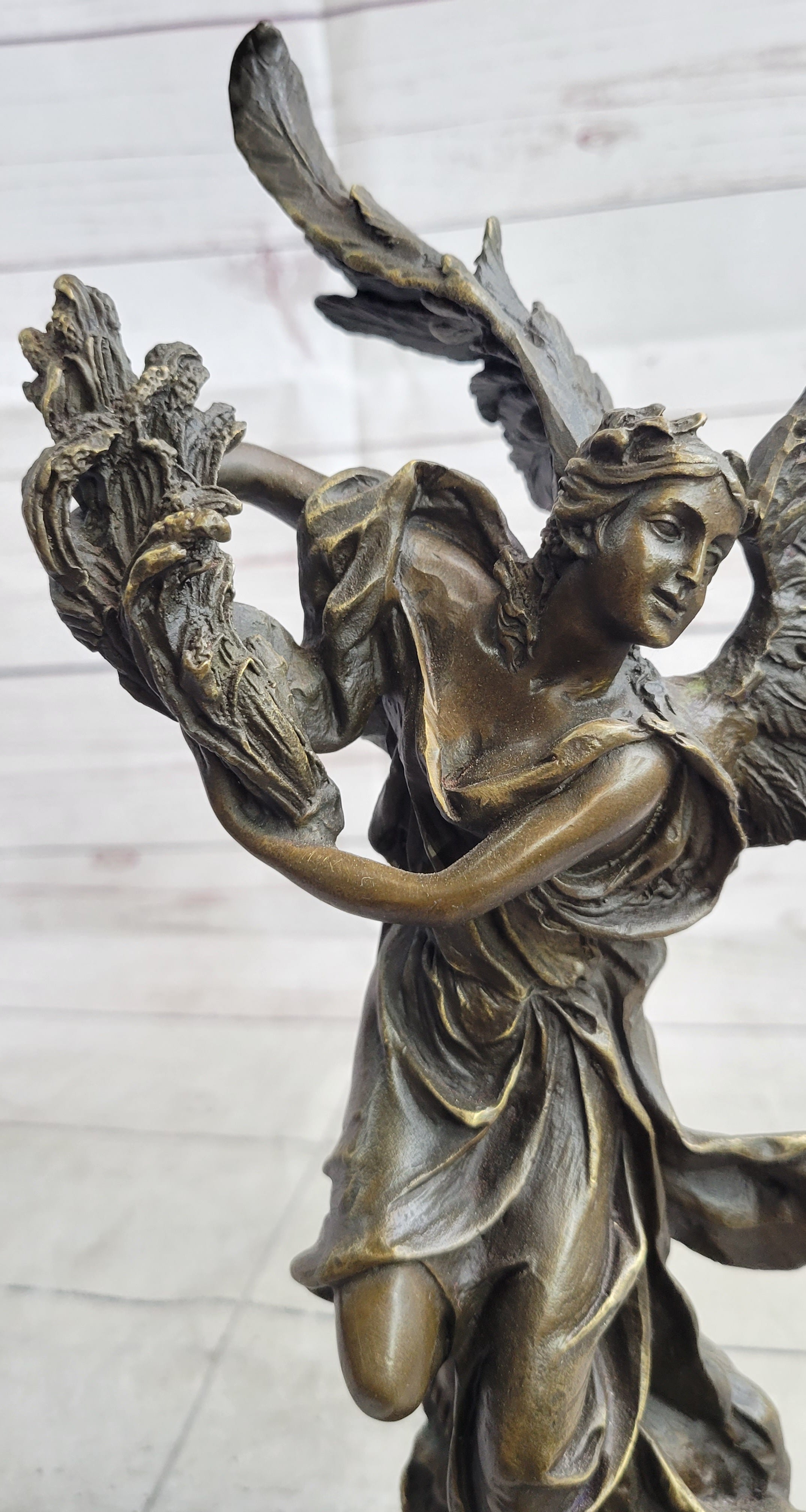This exquisite bronze sculpture captures the beauty and grace of an angel holding a bundle of wheat. With intricately detailed wings and a serene expression, this statue radiates a sense of peace and spirituality. The angel's flowing gown and delicate features are expertly crafted, showcasing the artist's skill and attention to detail. Resting on a sturdy marble base, this bronze statue is a stunning addition to any home decor. Signed by the renowned artist Dalou, it is a true masterpiece and a thoughtful gift for any angel enthusiast or art collector. Elevate your space with the timeless elegance of this bronze angel statue. Symbolizing abundance and fertility, the angel's gesture of holding a bundle of wheat represents prosperity and blessings. The bronze sculpture is meticulously crafted using the lost-wax method, ensuring its fine quality and authenticity. Its warm patina adds depth and richness to the piece, highlighting the intricate textures and contours. Whether displayed on a mantel, shelf, or as a centerpiece, this angel statue brings a sense of harmony and spiritual inspiration to any environment. Experience the enchanting presence of this winged woman angel figurine in your home. With her ethereal beauty and graceful posture, she captivates the viewer and evokes a sense of wonder. The bronze sculpture stands on a marble base, providing stability and a touch of sophistication. Crafted by the talented artist Dalou, this statue is a true testament to his artistic vision and craftsmanship. Whether as a focal point in your living room or a cherished gift for a loved one, this bronze angel statue is sure to leave a lasting impression and become a cherished symbol of hope and serenity.