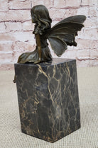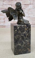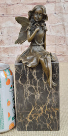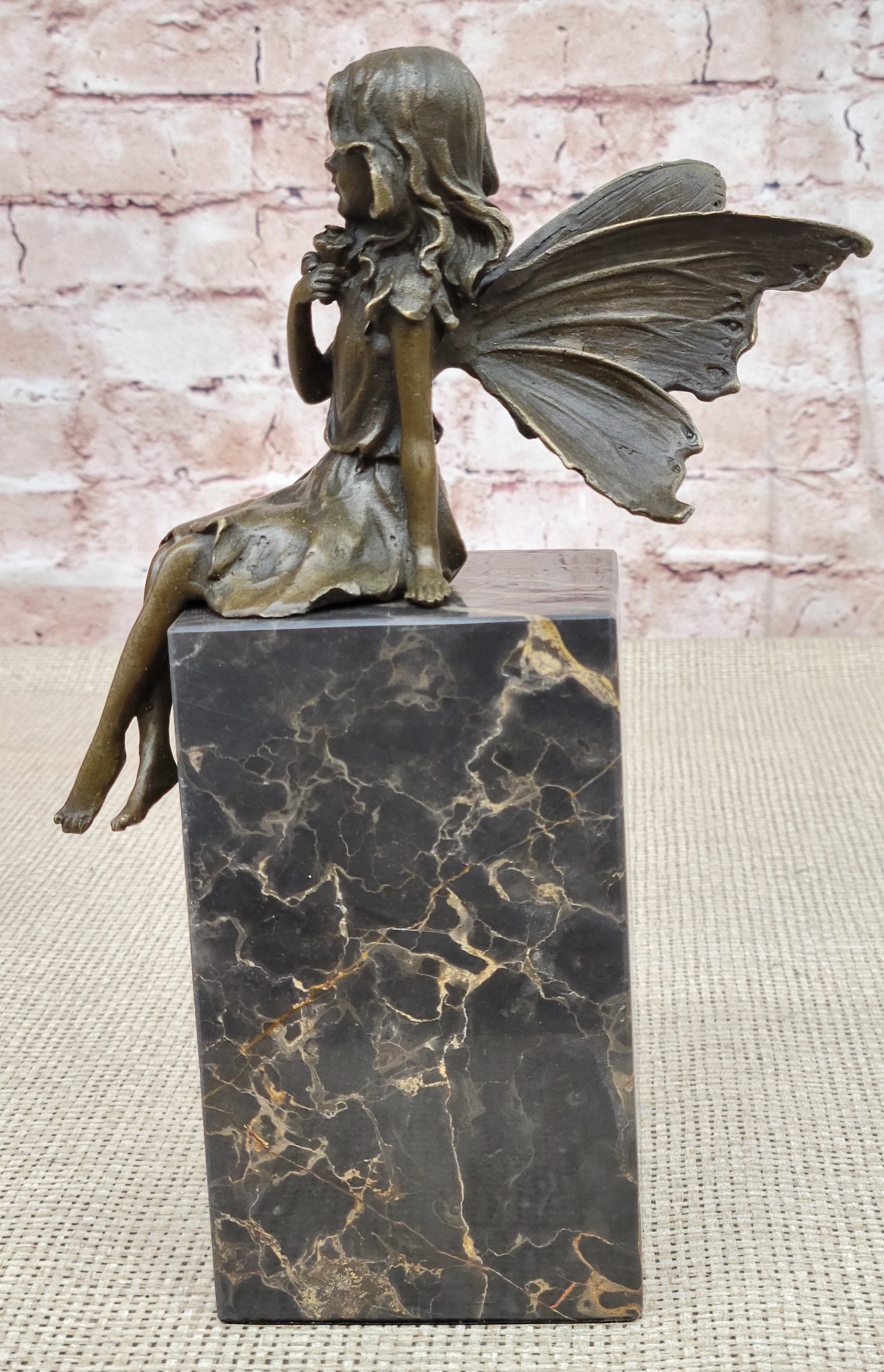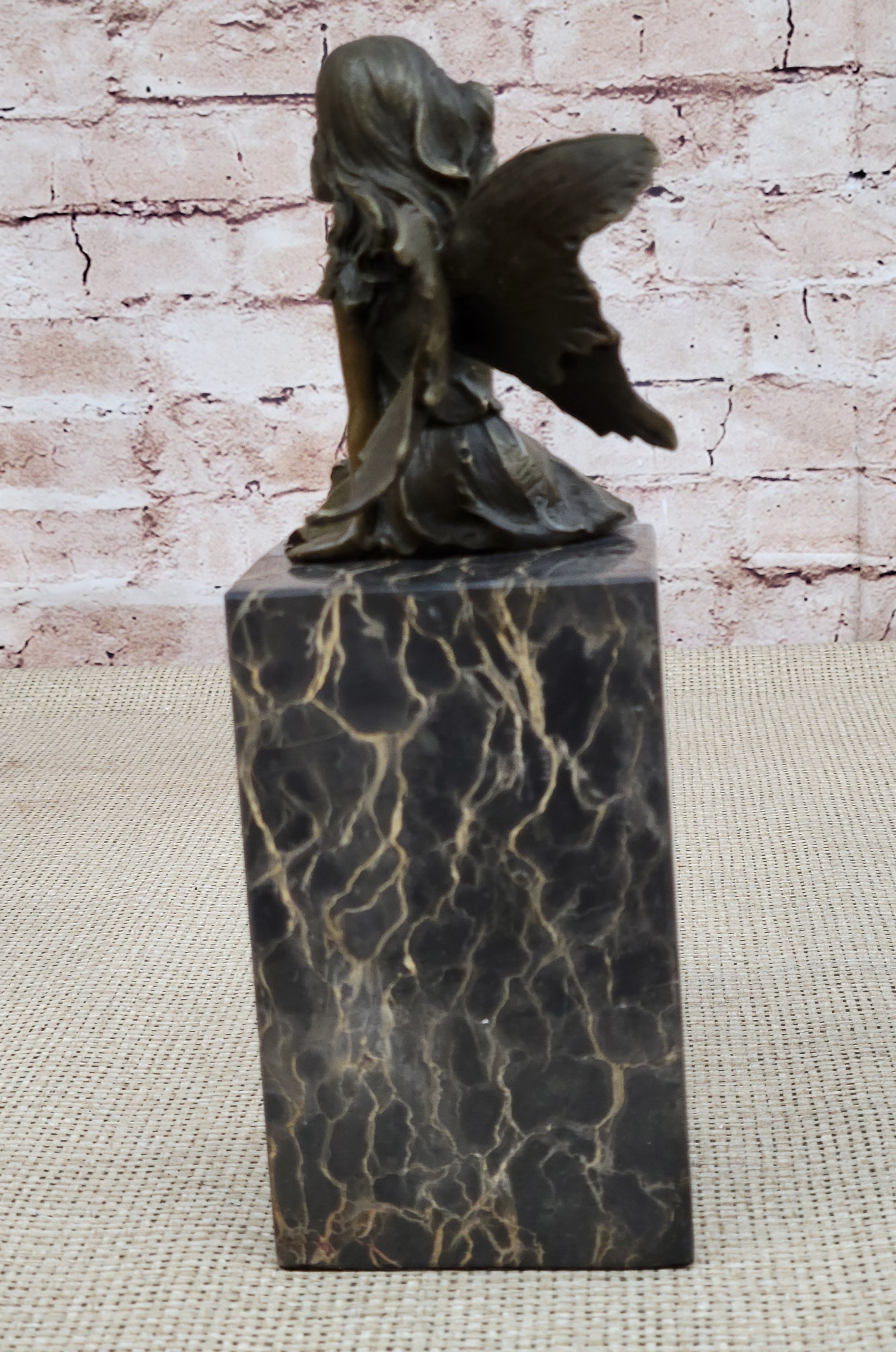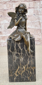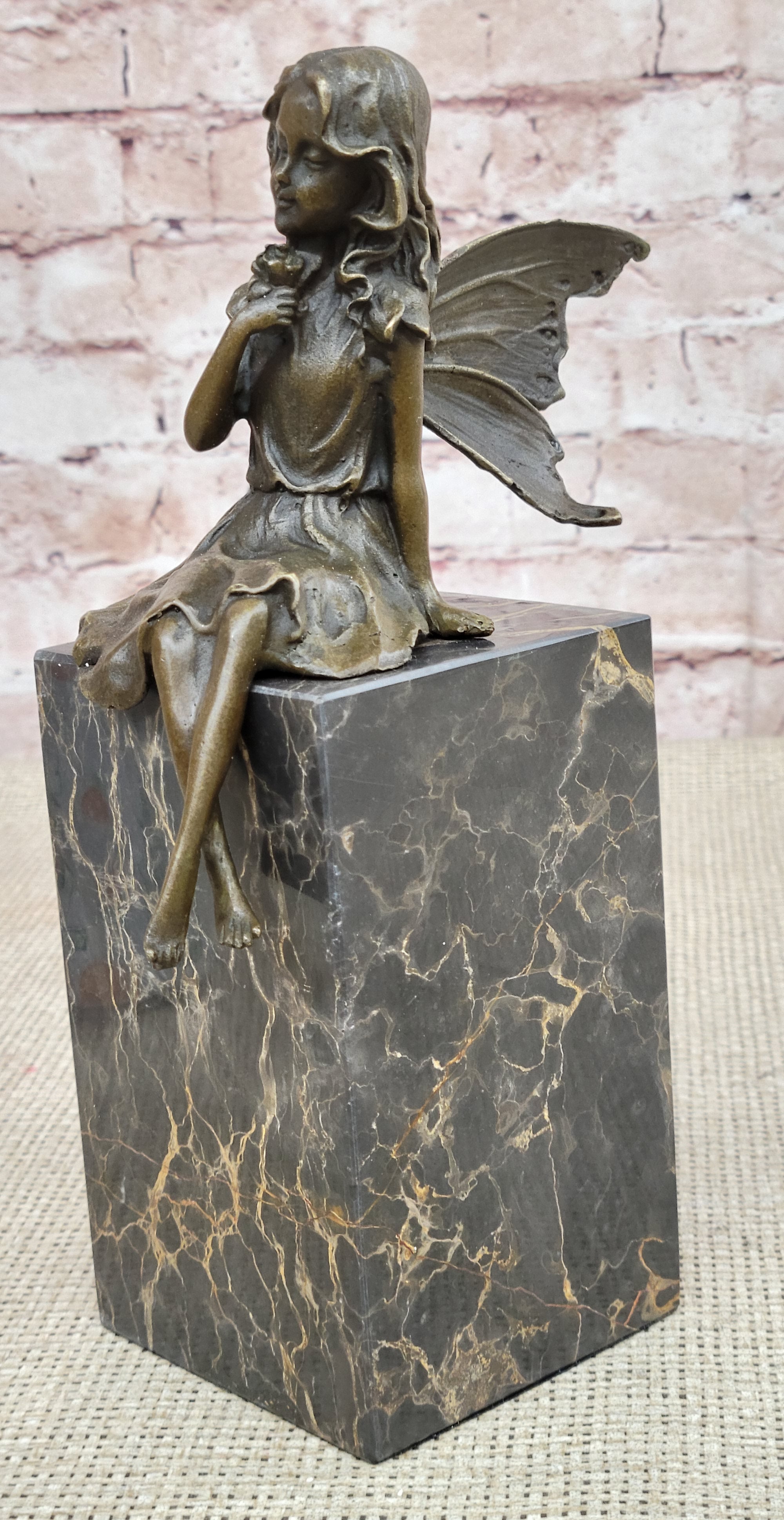 Hot Cast Bronze Sculpture Statue Young Child Fairy Angel Girl Holding Flower Marble Base
