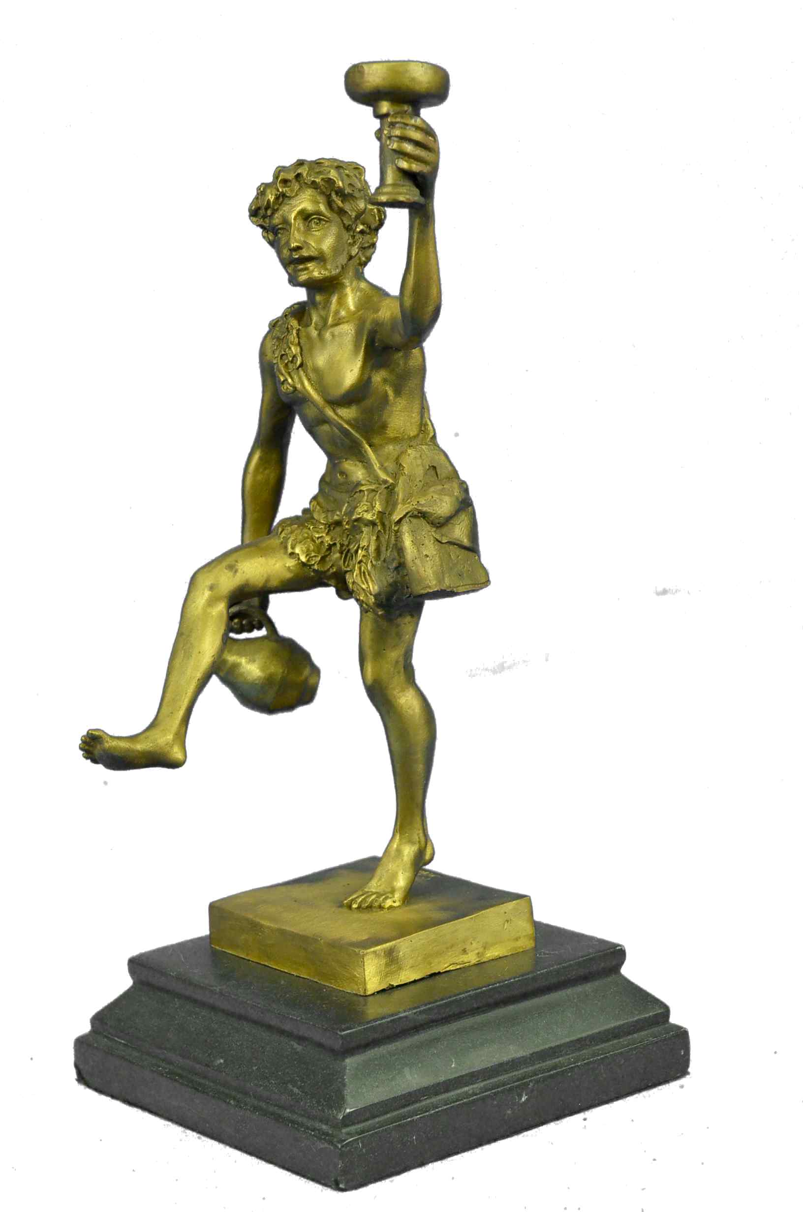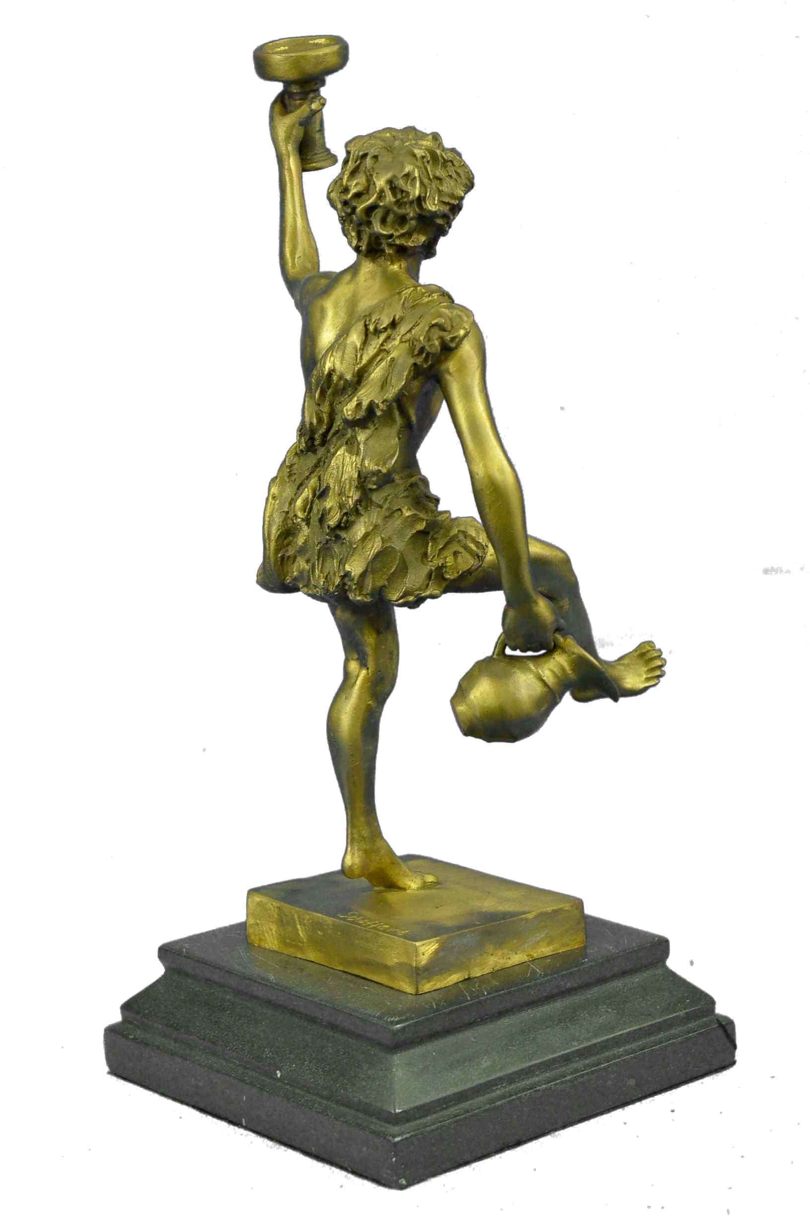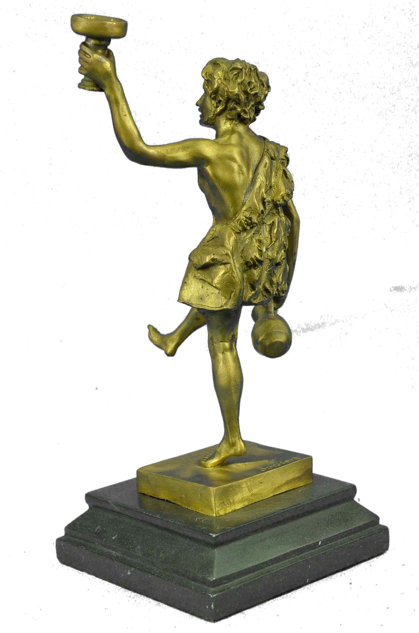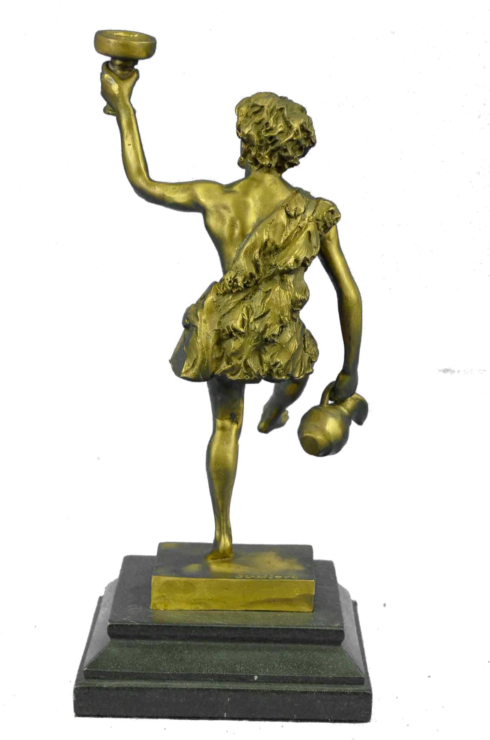 Here he is shown as he is traditionally spoken of; a beautiful man, with masculine facial features and luxurious hair, robed in the Greek fashion. Entwined with his curly hair, even as he raises a cup of wine in air, and In his other hand he drags an amphora, heedless of the wine it spills to the ground by his feet; for Dionysus, there is always another jug of wine. All of this is sculpted beautifully of hot cast real bronze with painful attention to detail, showing the contour of his form and every fold in his short, all cast in a fashion so as to look and feel as though it is made of real 100% bronze and is signed Schaffert, making it the perfect piece for your altar. The Art of Lost Wax
