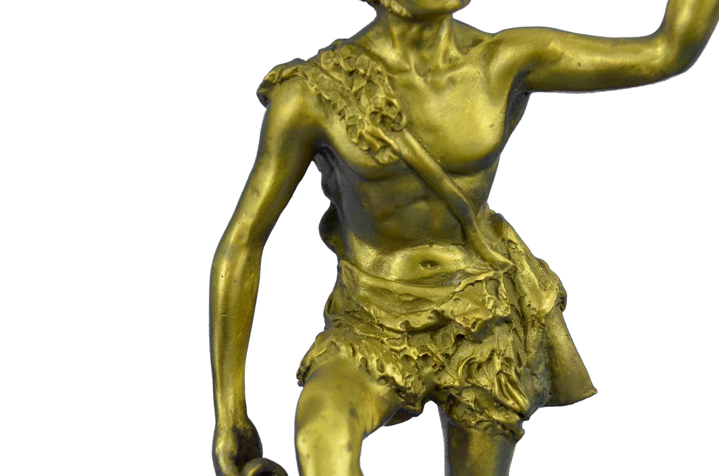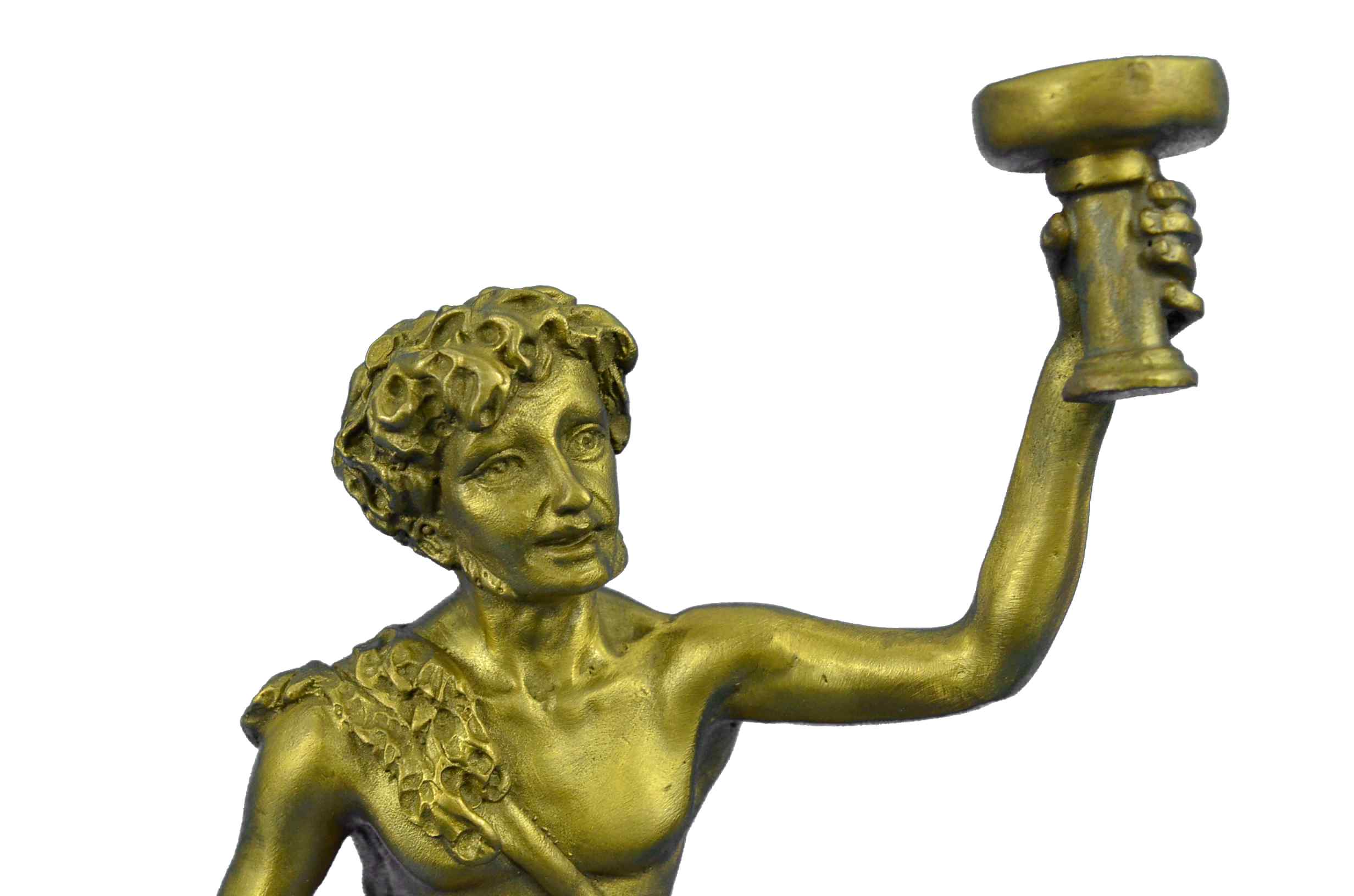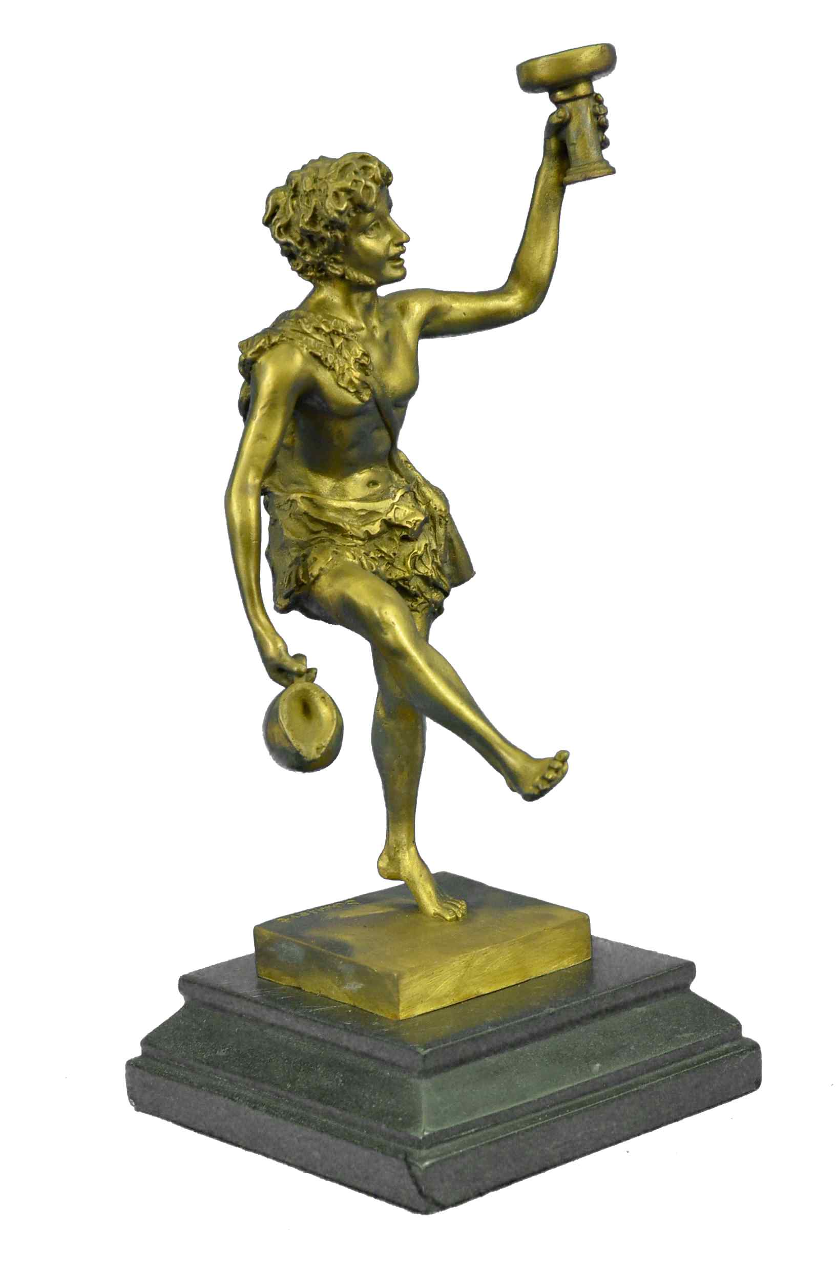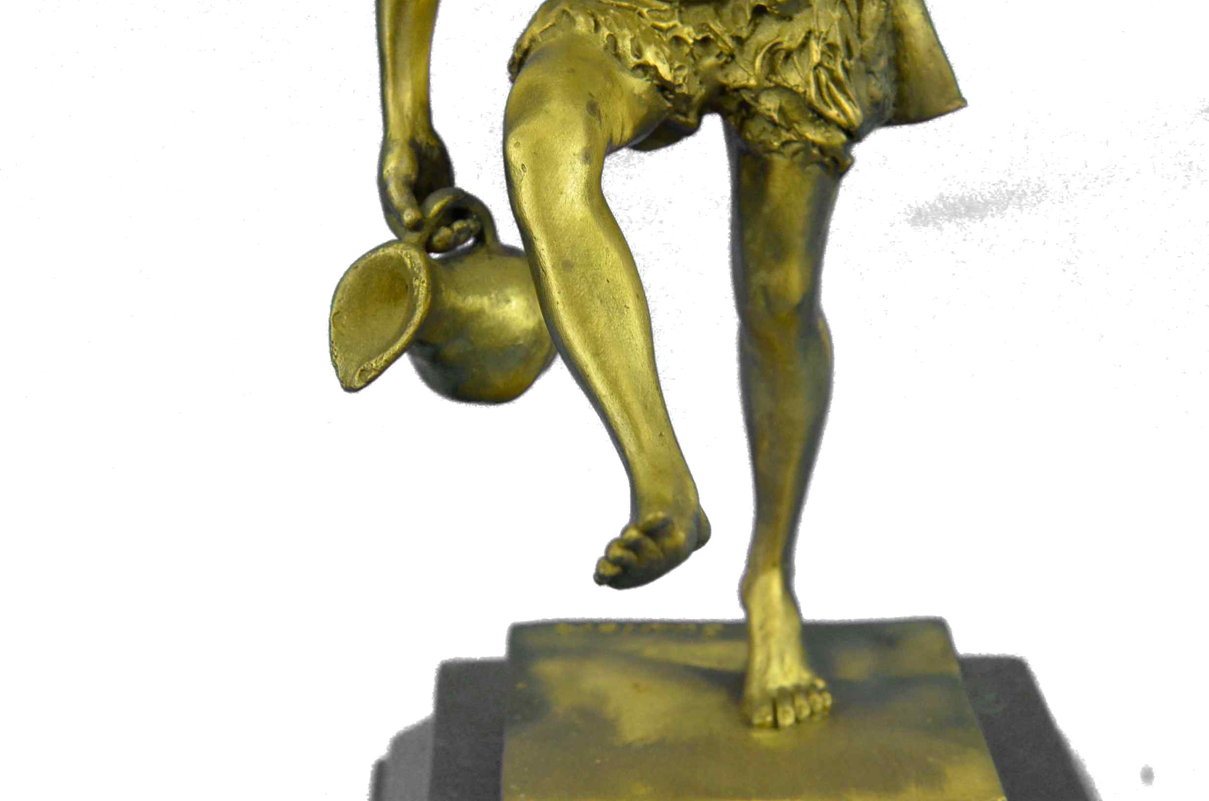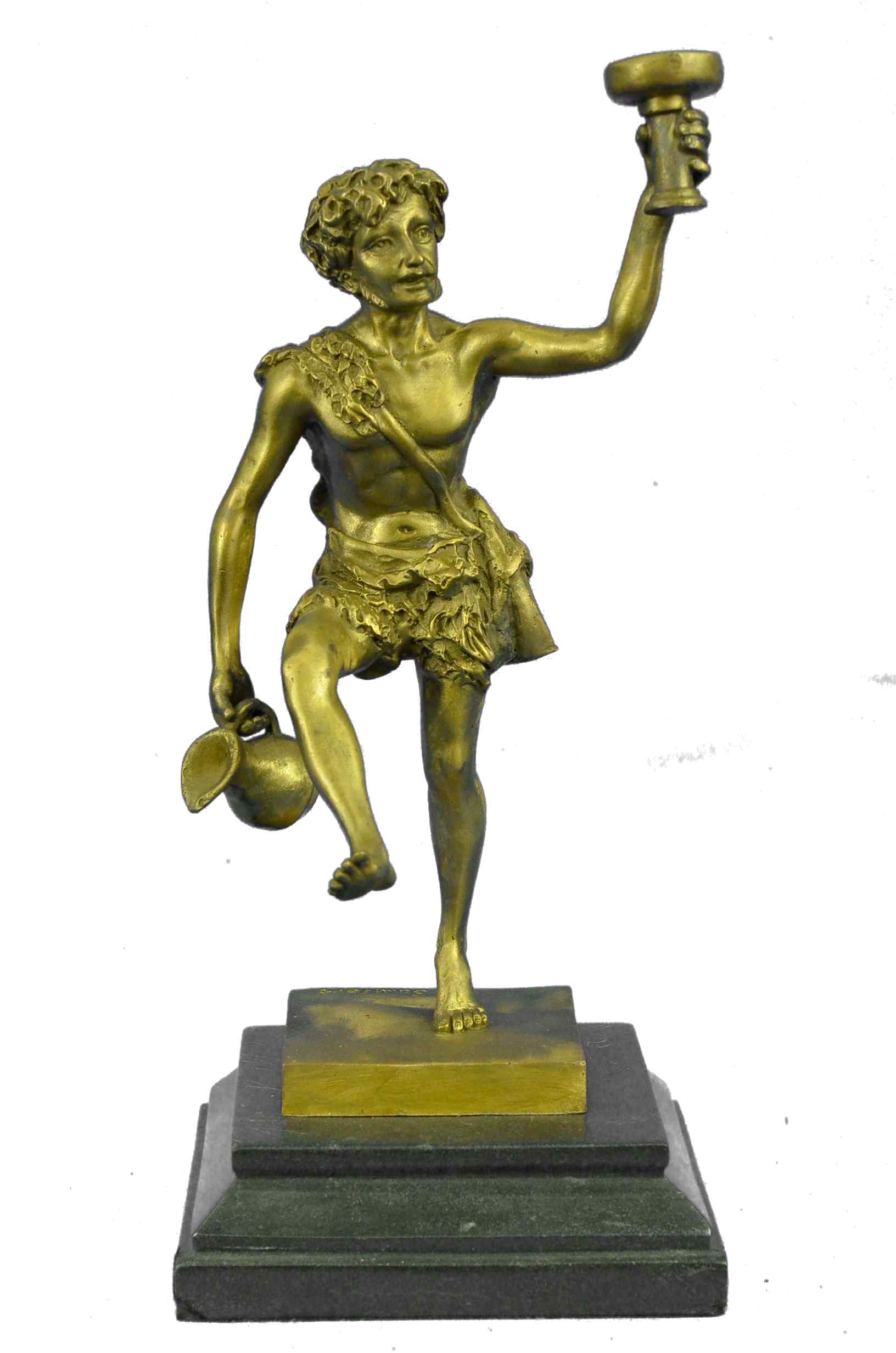 Here he is shown as he is traditionally spoken of; a beautiful man, with masculine facial features and luxurious hair, robed in the Greek fashion. Entwined with his curly hair, even as he raises a cup of wine in air, and In his other hand he drags an amphora, heedless of the wine it spills to the ground by his feet; for Dionysus, there is always another jug of wine. All of this is sculpted beautifully of hot cast real bronze with painful attention to detail, showing the contour of his form and every fold in his short, all cast in a fashion so as to look and feel as though it is made of real 100% bronze and is signed Schaffert, making it the perfect piece for your altar. The Art of Lost Wax