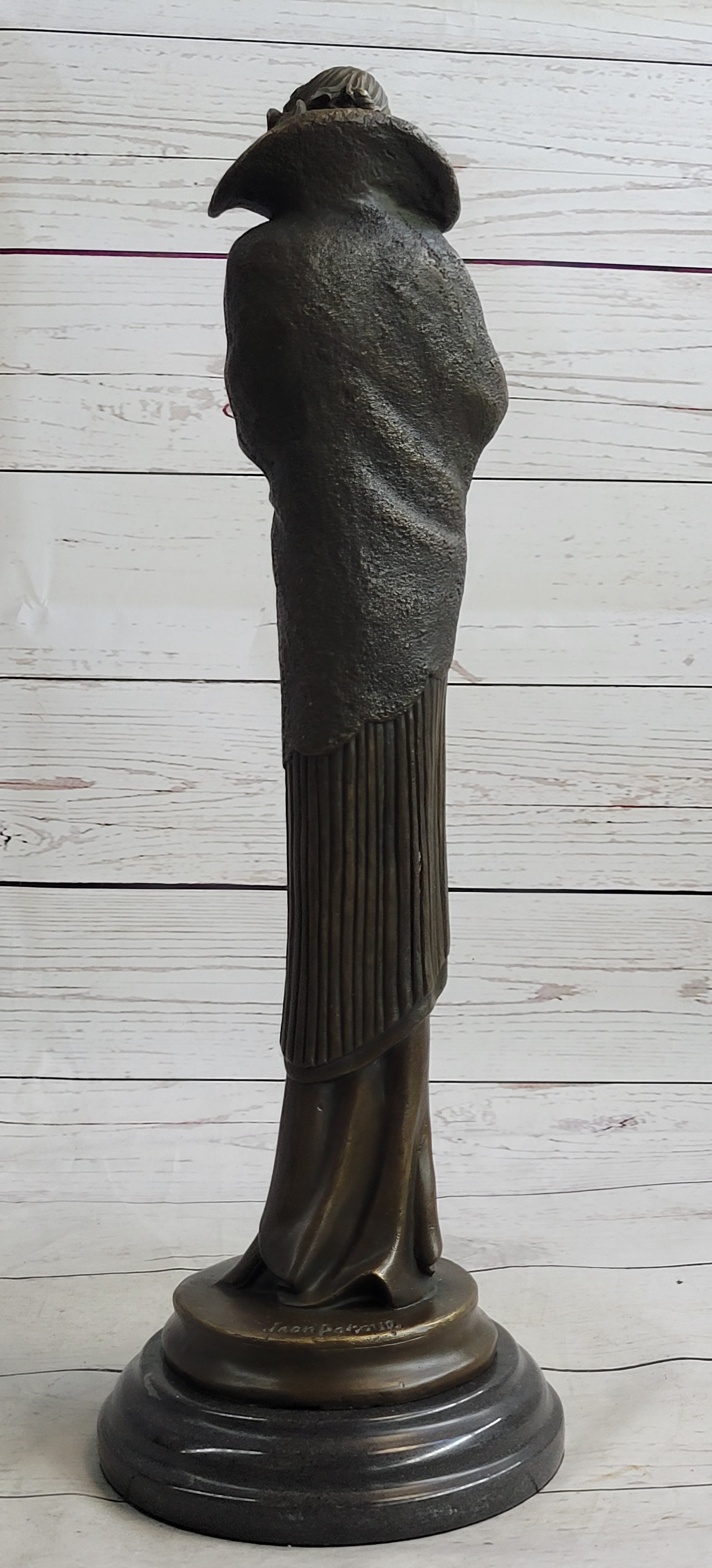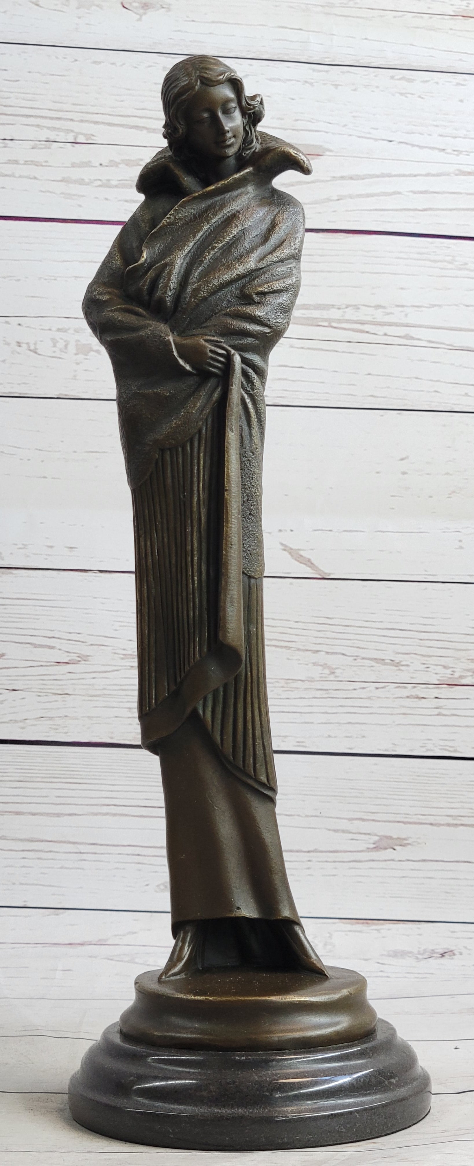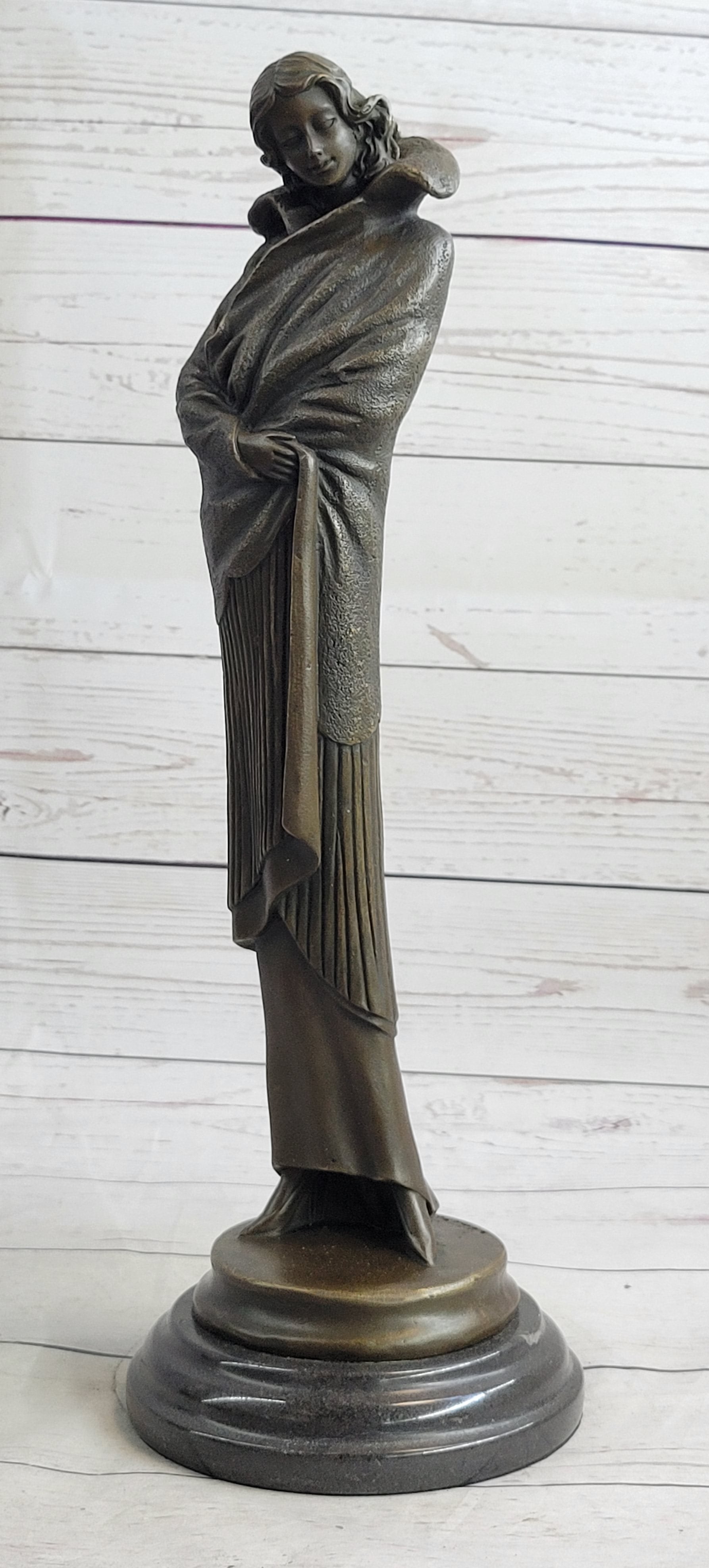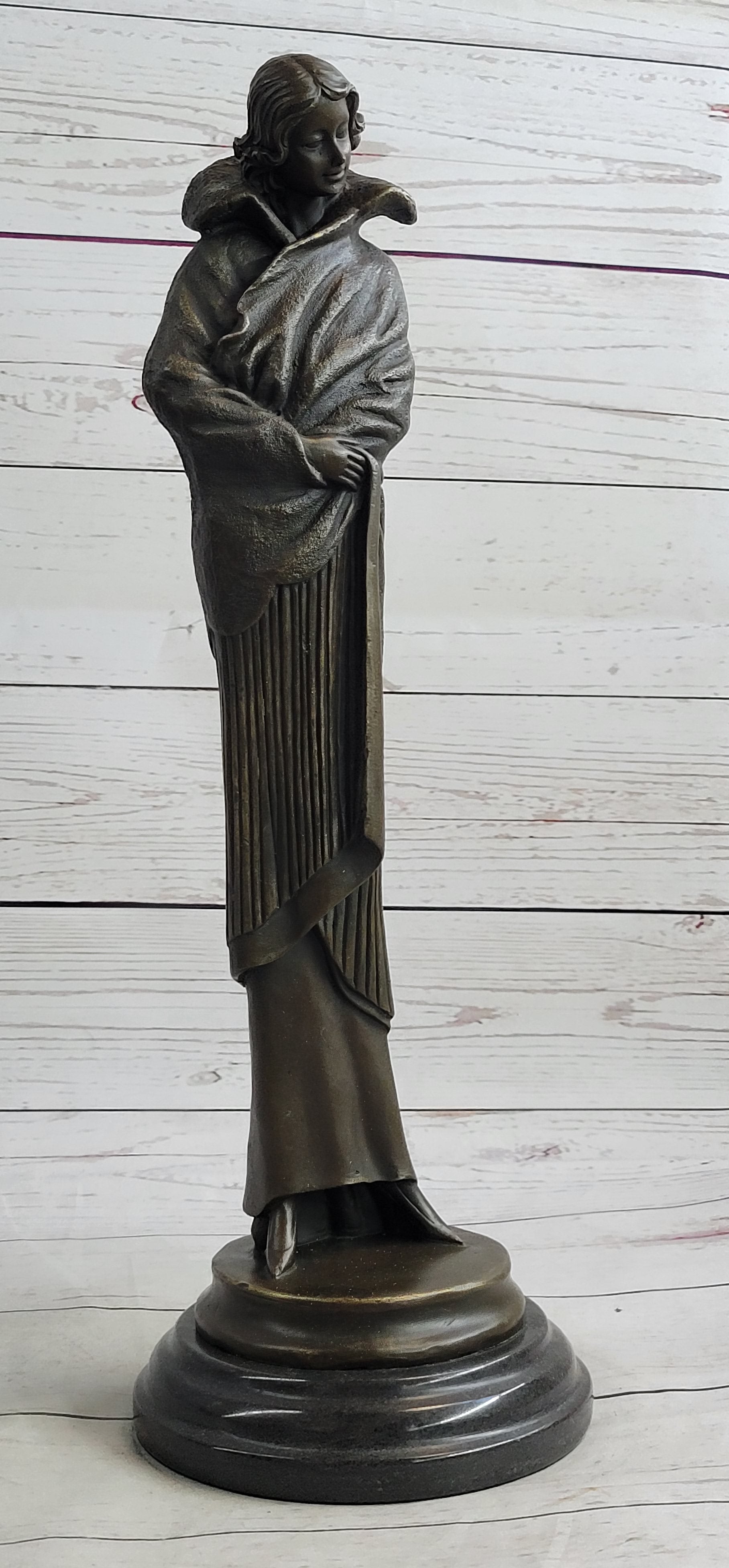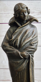 Art Deco Young Woman with Long Jacket Bronze Sculpture Marble Base Figurine 16" x 5"
