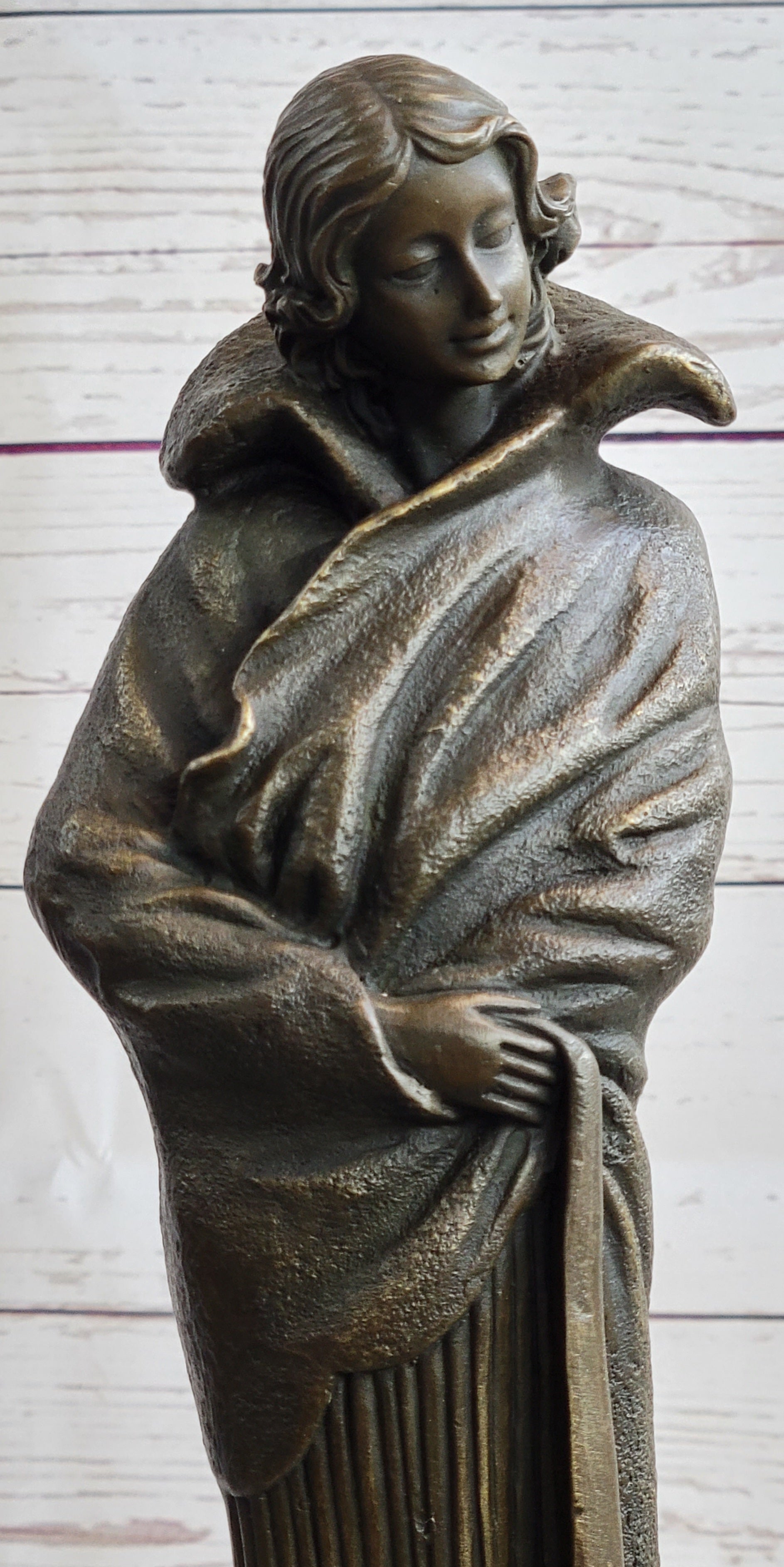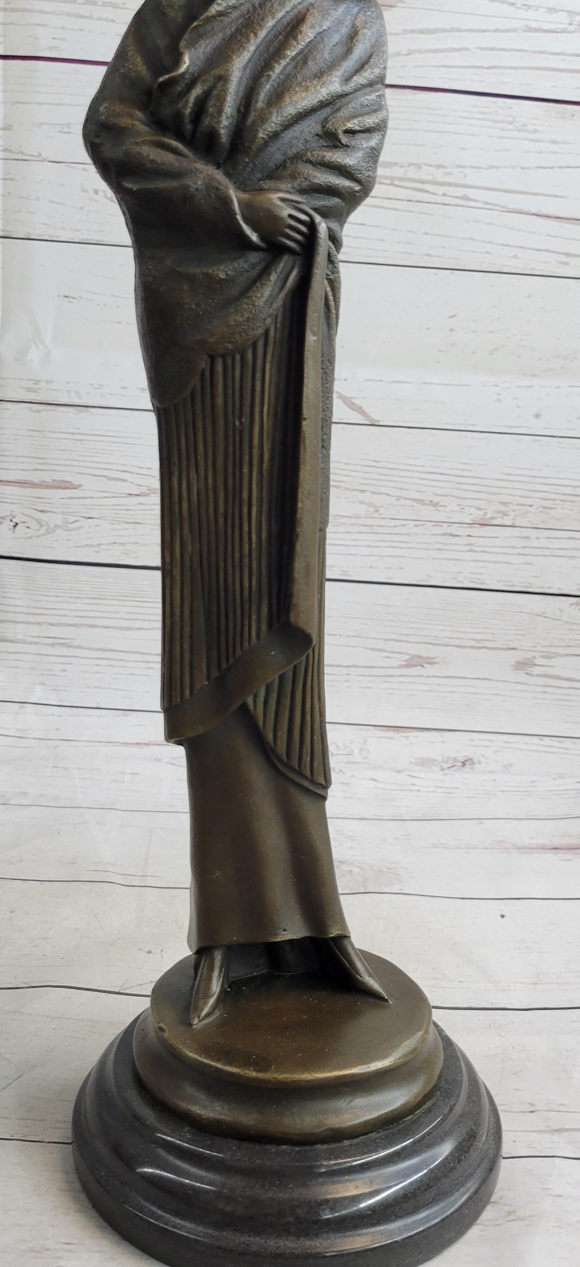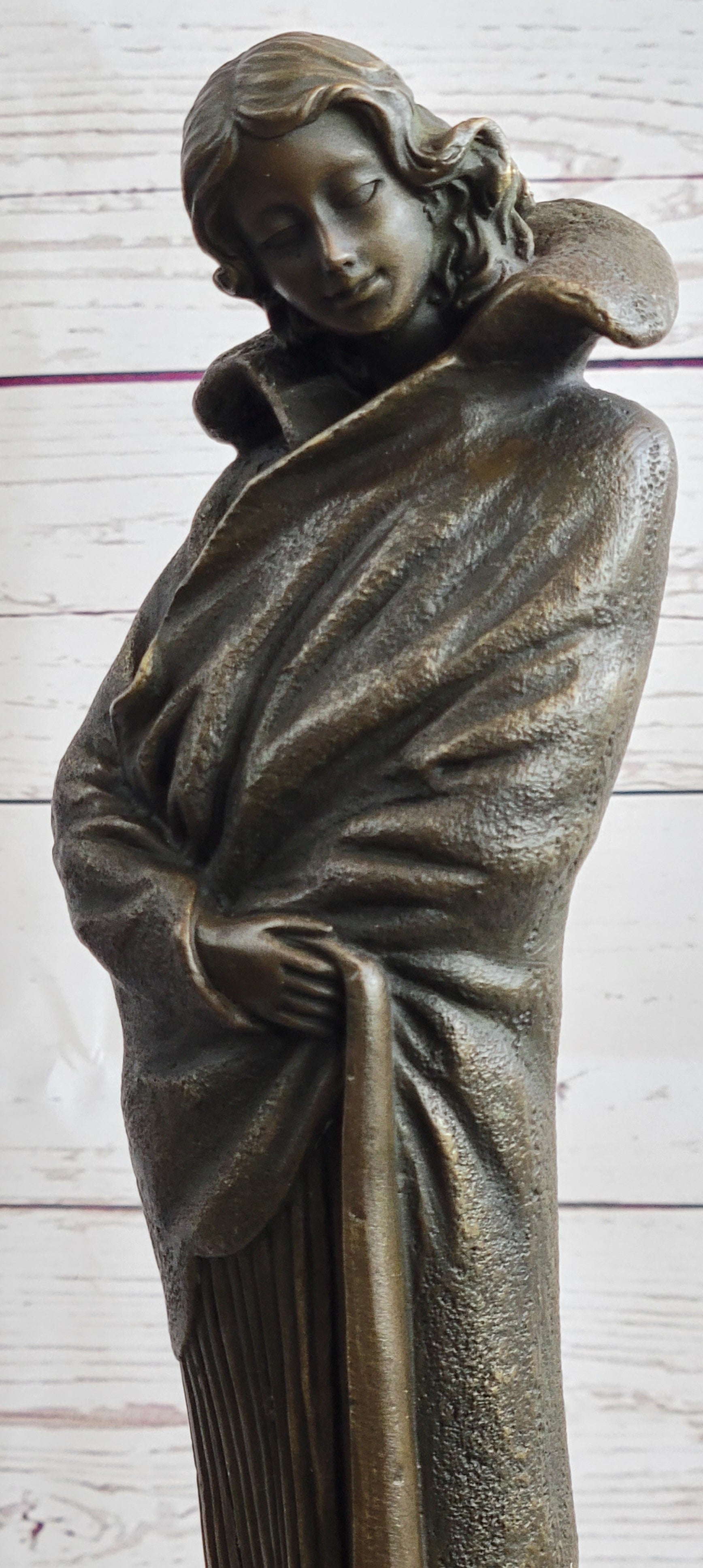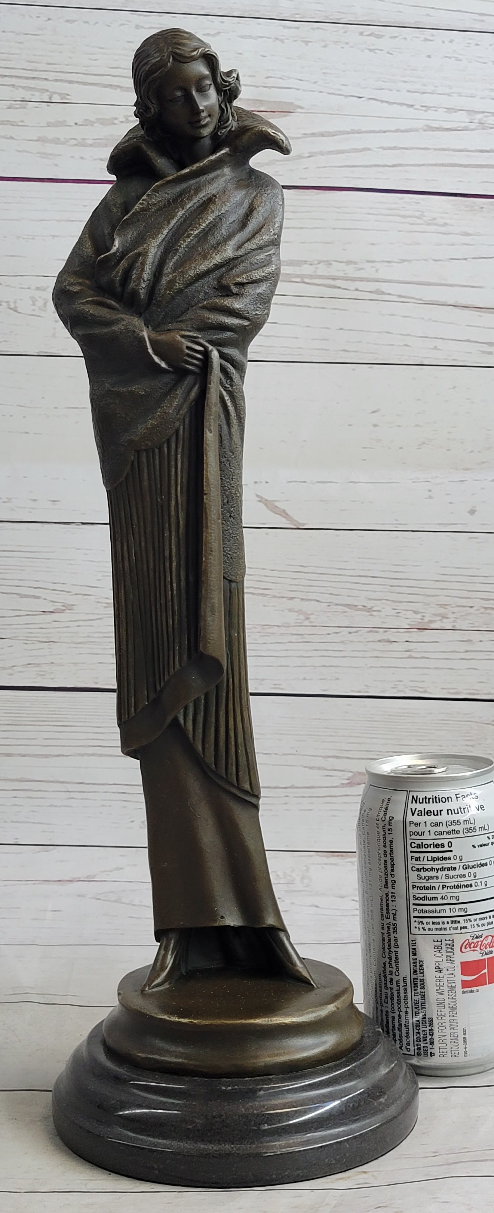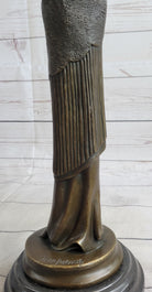 Art Deco Young Woman with Long Jacket Bronze Sculpture Marble Base Figurine 16" x 5"