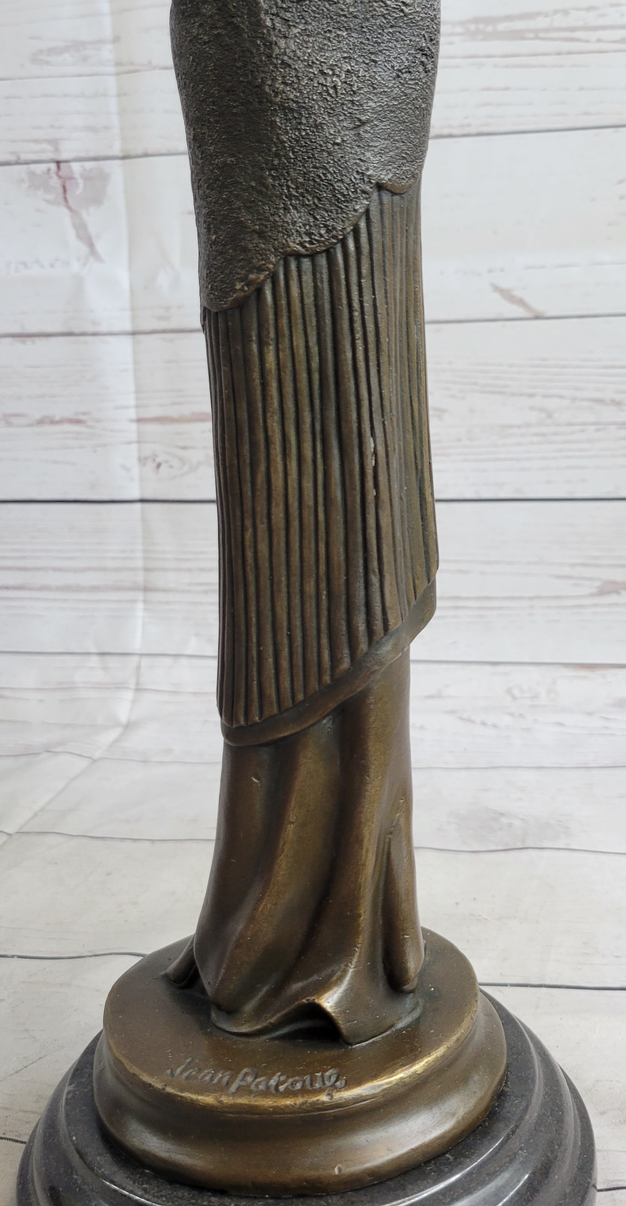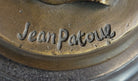 The Young Girl Can Be Imagined Walking Around Her Garden In The Early Morning Sunlight Exercising Her Green Thumb. Her long jacket Wraps Around Her, Pulled Back By The Wind, As Her Eyes Face The Ground Under Her Over-Sized collar. She Was Cast Using The Ancient Method Of Lost-Wax Casting And Stained With A Brown Patina Finish For Preservation. She Is Mounted Upon A Black Marble Base With The Artist Jean Patoue`s Signature.Bronze Dimensions with Marble Base: Height 16.5" X Width 5"