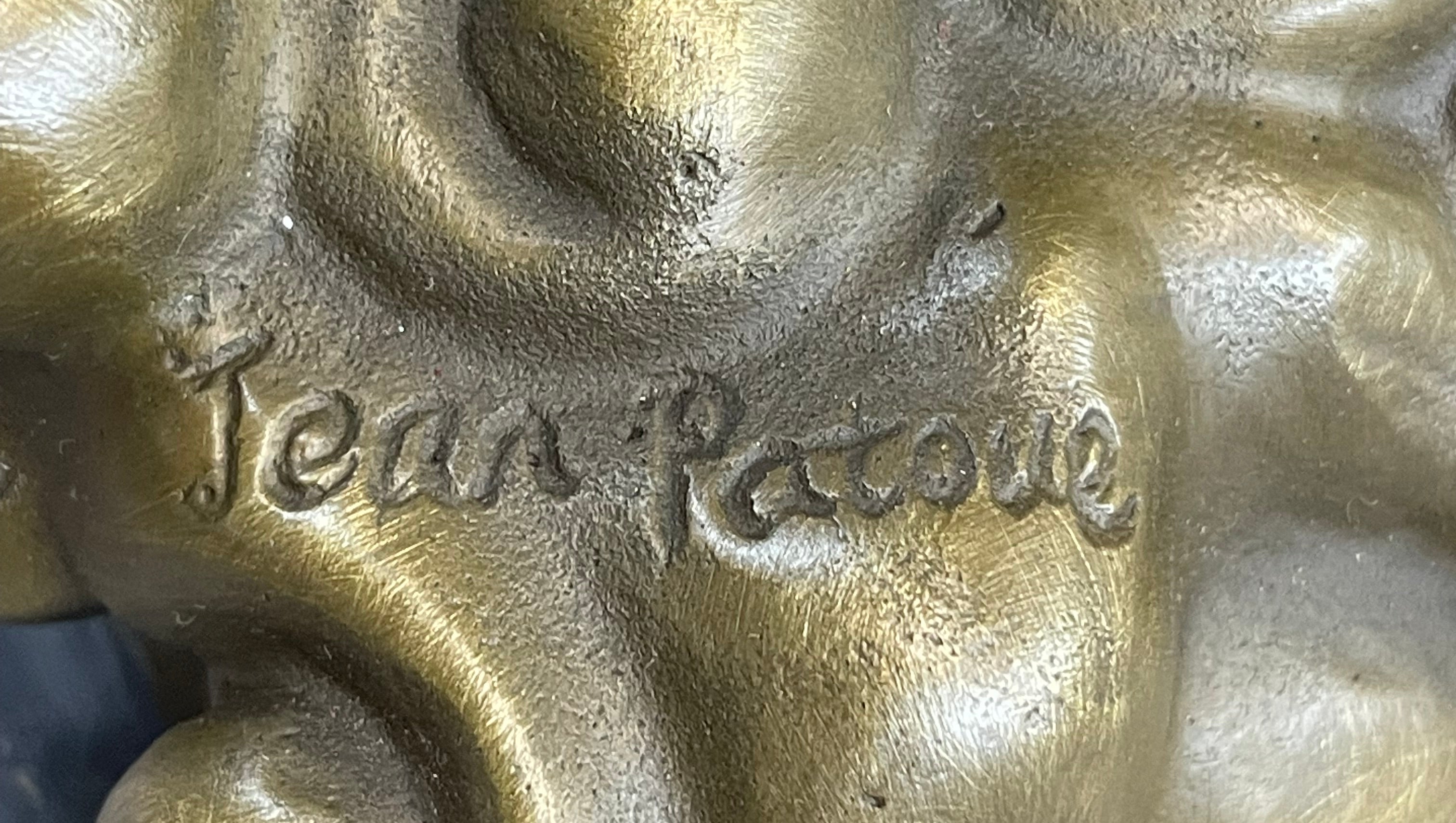 Crafted using the intricate lost wax method, this sculpture exemplifies exceptional artistry and attention to detail. Its placement on a sleek black marble base not only adds to its visual appeal but also ensures stability. With the signature of the artist Jean Patoue, this bronze sculpture is not just a work of art but a conversation piece that invites viewers to ponder its symbolism and narrative.Bronze Dimensions with Marble Base: Height 14" X Width 9"