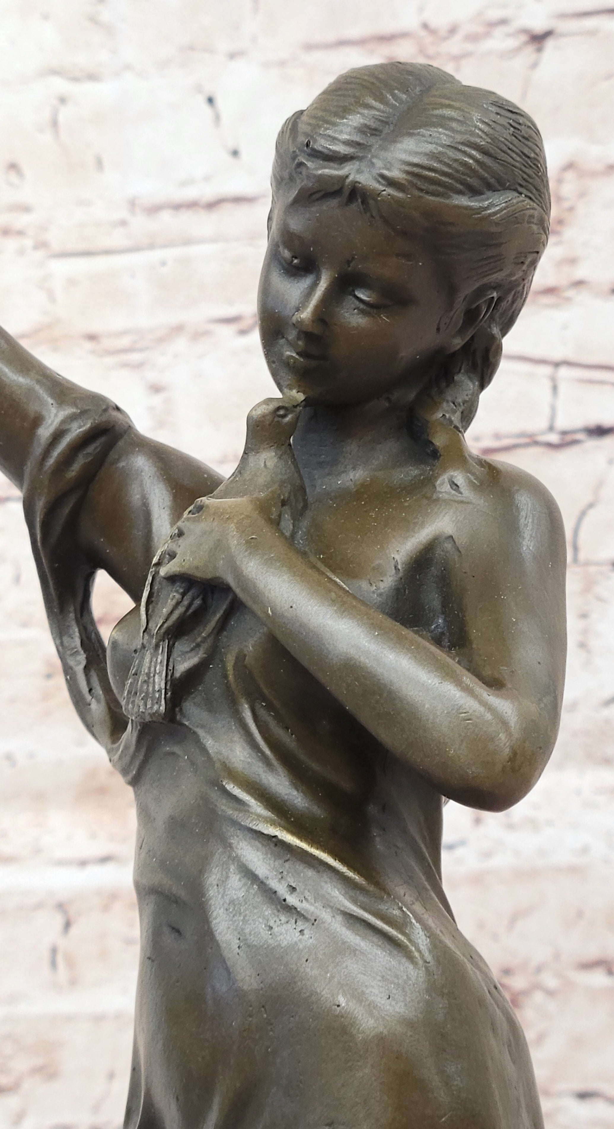This evocative bronze sculpture captures a moment of quiet reflection as a young girl makes her way home after a long day tending her garden. With a modest smile and a hint of weariness in her eyes, she carries a cup of drink in one hand and a small bird in the other, suggesting both nourishment and a gentle connection with nature.