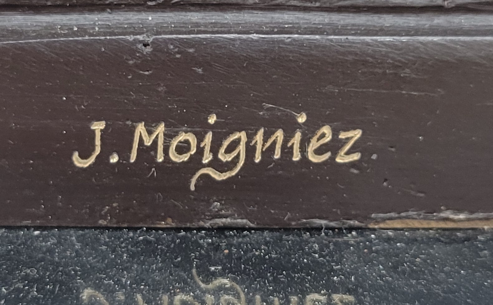 This gorgeous mare takes a leisurely stroll through luscious green fields, basking in the warmth of a sunny spring day. She is a full-bodied beauty with a long, flowing mane that cascades gracefully down her muscular and thick frame. Her powerful build is accentuated as she raises her head, flaring her nostrils to blow out a contented breath. Carefree and serene, she embodies a sense of freedom and tranquility, while her baby foal nibbles on the lush grass nearby, mimicking his mother's every move as he eagerly feeds to support his growth. The base of the sculpture captures the essence of a verdant field, with detailed grassy patches that enhance the realism of the scene. This idyllic portrayal of the mare and her foal is more than just a decorative piece; it evokes the simplicity and beauty of nature, making it a perfect gift for any animal lover. The two-tone brown patina adds depth to the sculpture, highlighting the intricate details of the mare's mane and the foal's youthful form. Crafted using the traditional "Lost Wax Method," this sculpture is 100% bronze and meticulously handmade, ensuring each piece is a unique work of art. The artist, J. Moigniez, has signed the sculpture, adding a touch of quality and increasing its collectible value. This exquisite bronze sculpture not only celebrates the bond between a mare and her foal but also serves as a timeless tribute to the grace and strength of these magnificent animals.
