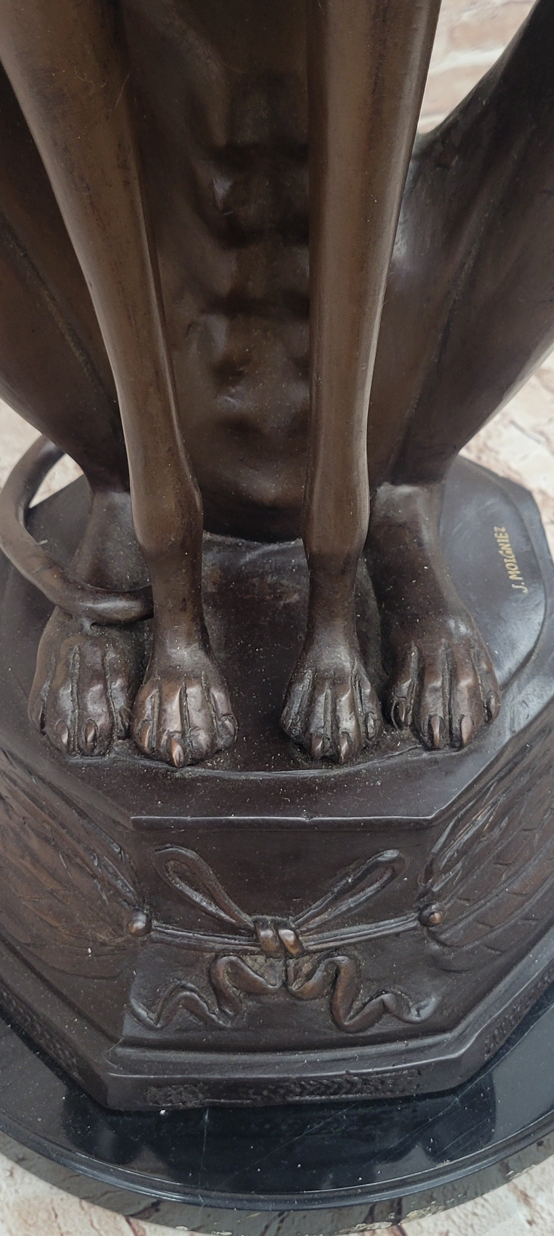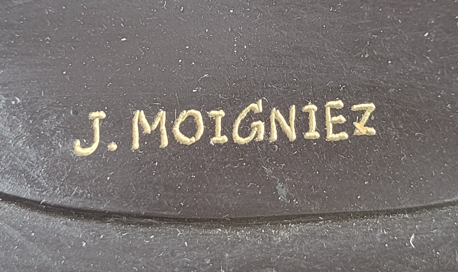 Crafted using the ancient lost-wax casting method, this handmade bronze sculpture showcases meticulous craftsmanship and attention to detail. The brown patina finish adds depth and character to the sculpture while preserving its timeless beauty. Mounted on a black marble base, the sculpture bears the signature of the artist Moigniez, further enhancing its authenticity and value.