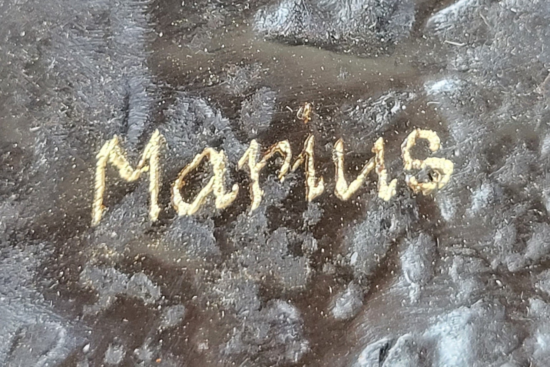 Mounted on a sleek black marble base, this sculpture is not only a visual delight for horse lovers but also a celebration of the artistry involved in equestrian pursuits. The piece is signed by the artist Maius, adding a personal touch and authenticity to this captivating portrayal of the world of horse racing.Bronze Dimensions with Marble Base: Height 16" X Width 23"