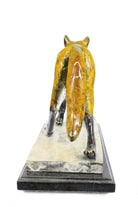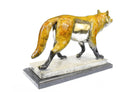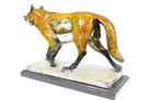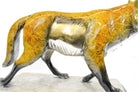 This statue is one of a confident fox on a journey. Its snout is held up and aware of the smells surrounding it. Both predators and prey are un-aware of his presence. He is sly and silent with his steps, disguised amongst the shadows in the forest. His walk is confident and steady, he has his scent that he follows and he`s going to find what he`s looking for. His eyes are black and stunning and can see sharper than most others in the animal kingdom. His ears are upright and sensitive to sounds many distances away. His coat covers his muscular body frame, lying thick and course down his back. He has smooth sides with a different shade of patina and his stomach is a softer fur, detailed with fine strokes. He walks on a green patina bronze that lays over a sturdy marble stand. This bronze sculpture was cast using the "Lost Wax Method" and has a multi-colored Patina. It is signed and numbered by the artist Marius.Bronze Dimensions with Marble Base:Height 12" x Width 19"