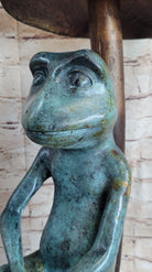 The sculpture features a beautiful patina that resembles antique bronze, with a teal patchy coat covering the entire frog. The rest of the piece showcases a two-tone brown patina, lighter at the top of the largest mushroom, adding depth and visual interest to the scene. The intricate details, from the frog’s content expression to the texture of the mushrooms, highlight the artist’s skill and creativity.