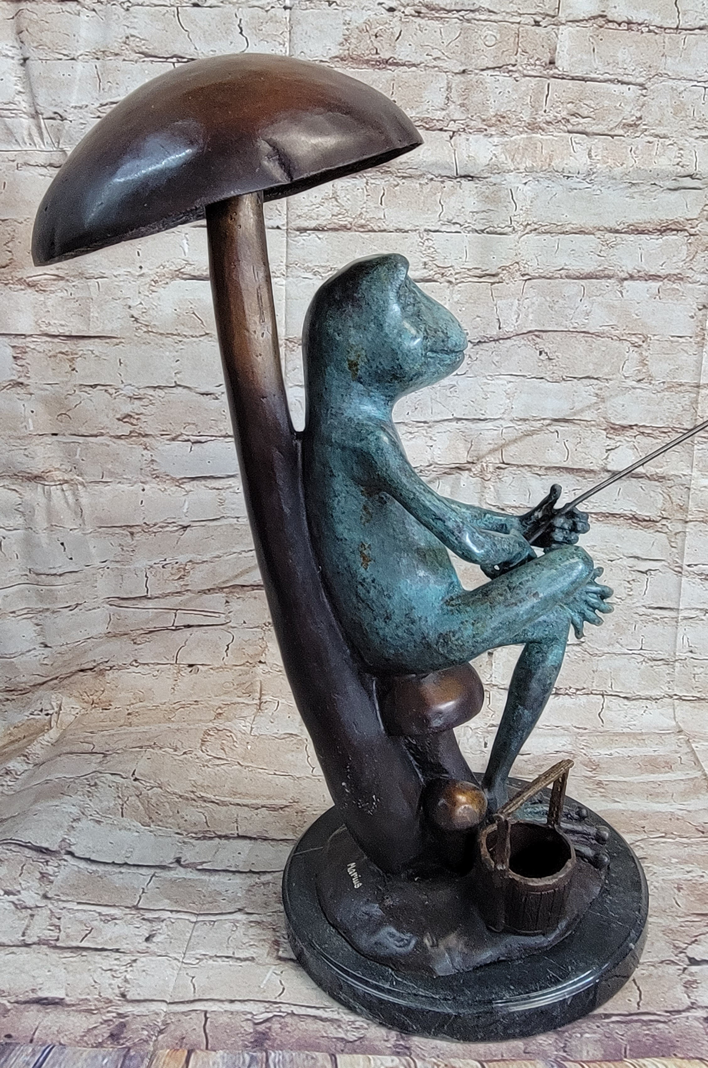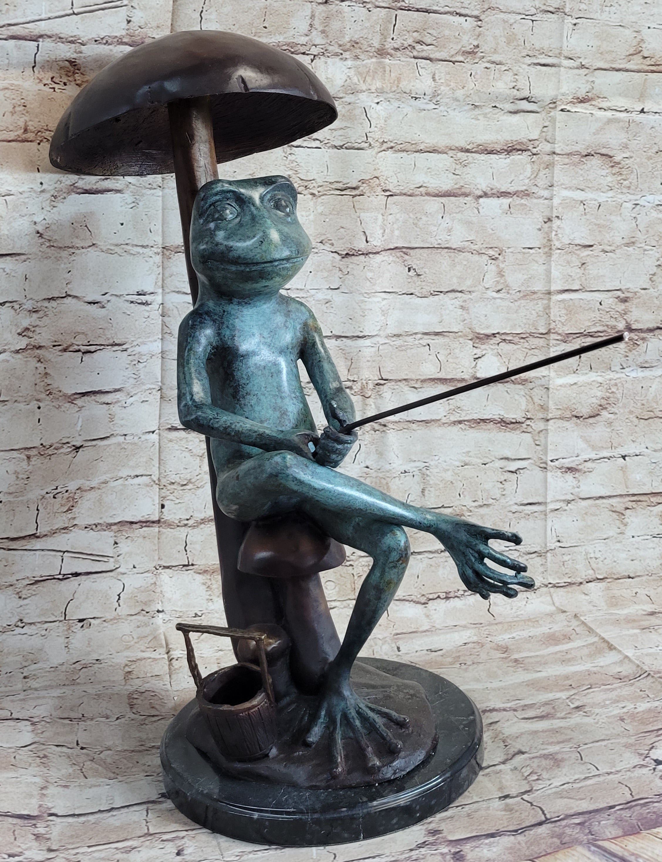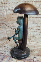 Bronze Sculpture Statue of a Frog Fishing Under a Mushroom Signed Original Art