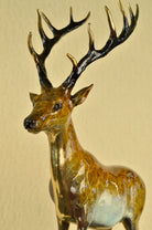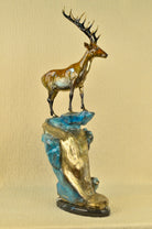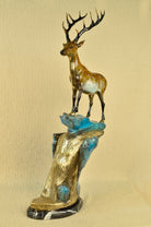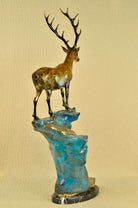 This is a marvelous limited edition collector`s statue of a deer standing on a high rock. Only 500 statues made by the artist Marius. Hi stands at a high perch overlooking the land he explores and is alert with his ears upright. His beautiful black eyes reflect the sunlight and his antlers shimmer in a beautiful gloss black and gold patina. You can tell from his face that he is young but the antlers represent a healthy diet that had made him grow to be strong and healthy. He stands on a rock with a stream parting around it in a lustrous gold and waits before he drinks from it. His coat is a beautiful patina of gold`s and other similar shades that characterize the different shades in the coat, getting lighter at the belly and shading into black at the legs. He is handmade of 100% bronze and cast using the ancient "Lost Wax Method" with a special multicolored patina. Signed Marius. Please Note:This is a limited edition Numbered item.Original or Reproduction: Reproduction