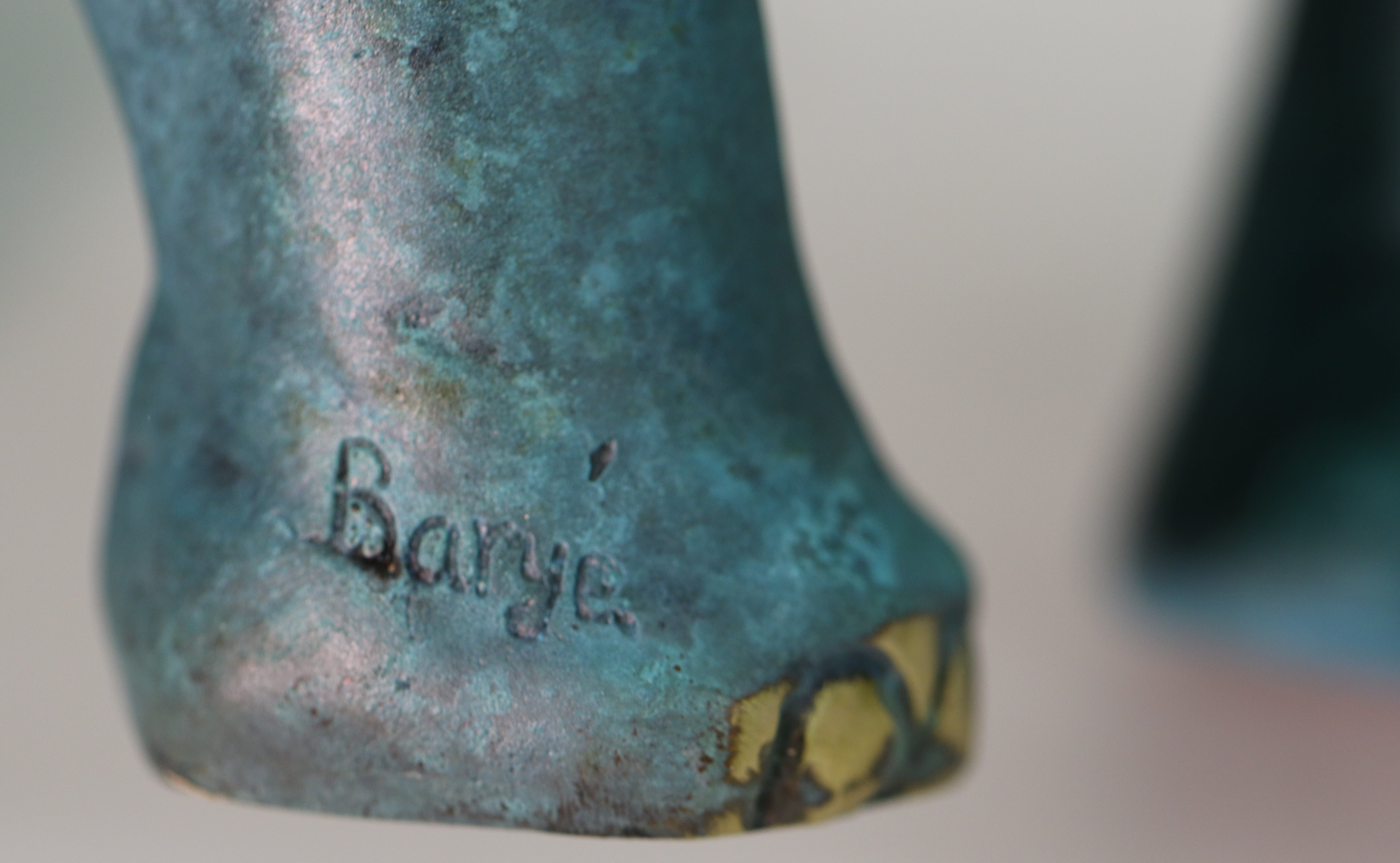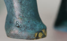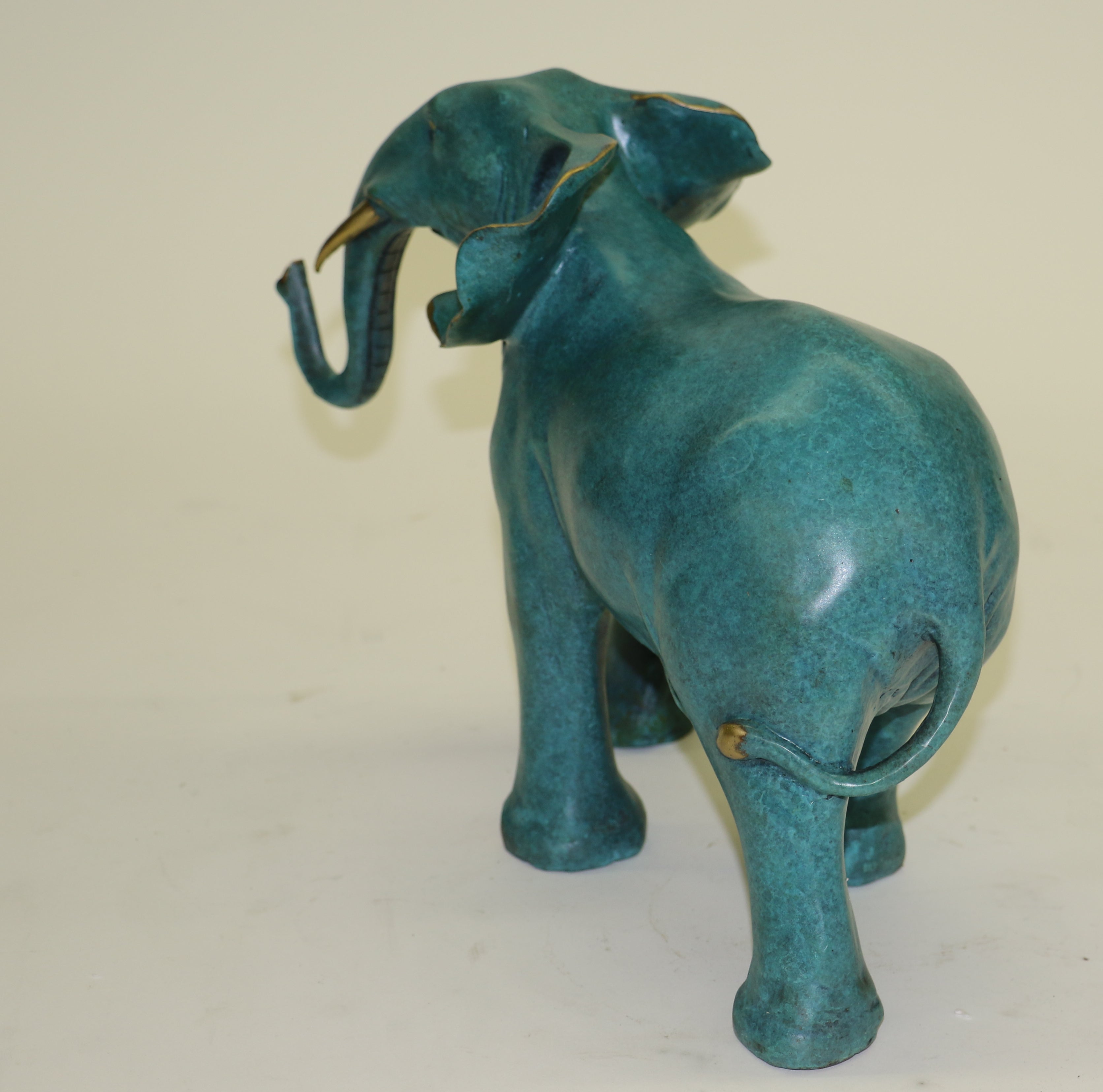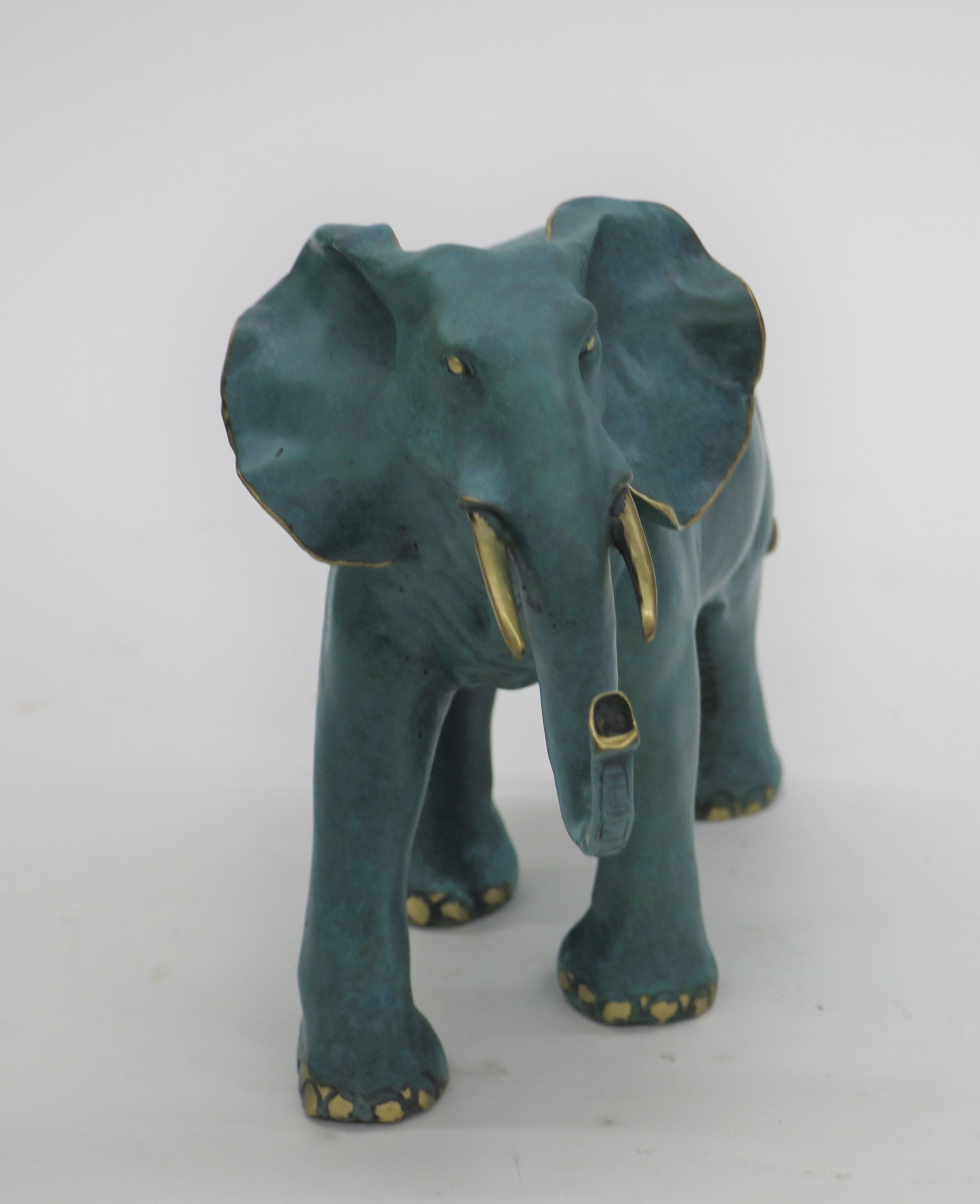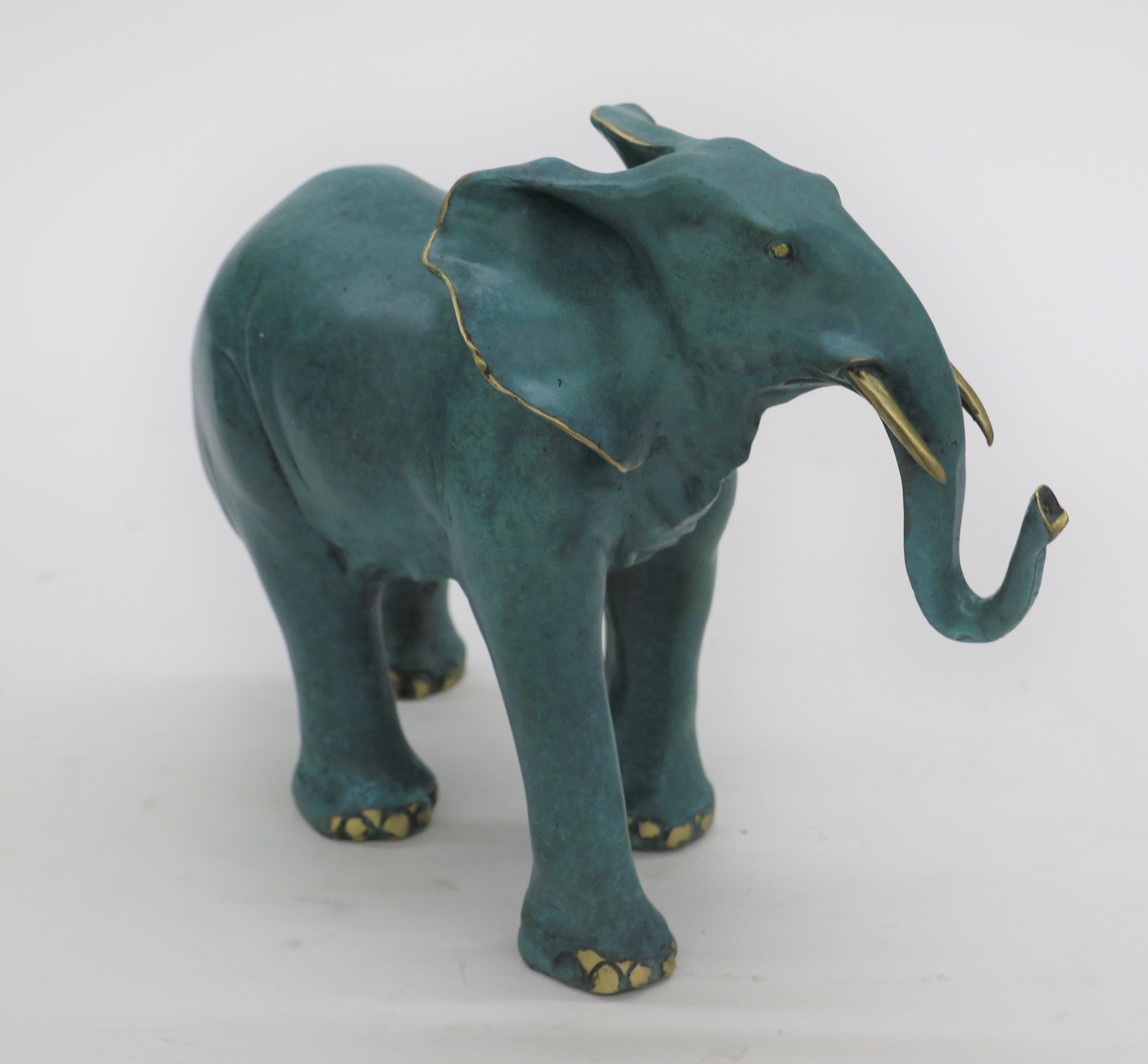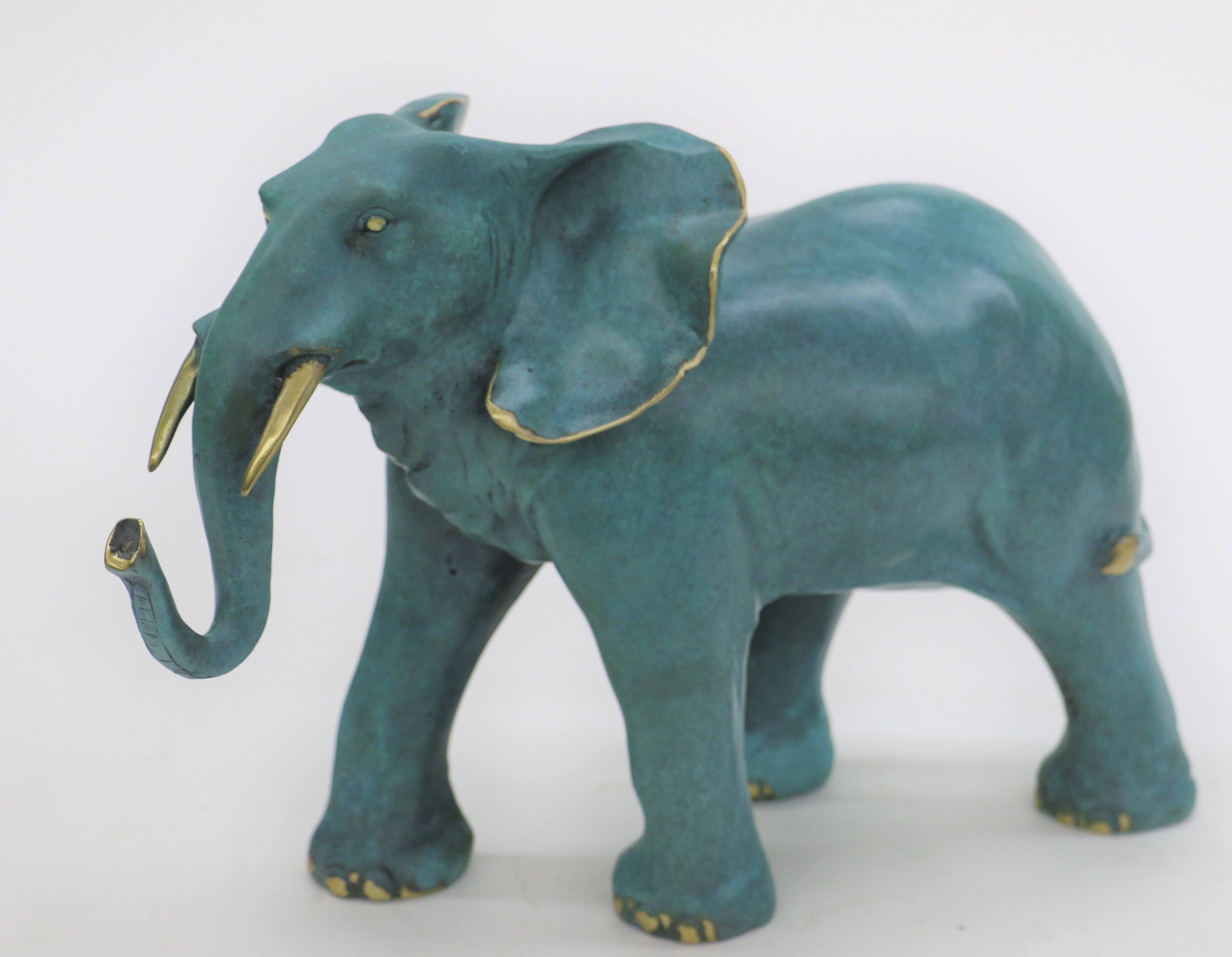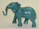 This happy elephant lifts her trunk and swings her tail letting you know she is in a blissful mood. She lifts her trunk and exposes the underside which is adorned in a gorgeous Green patina. She is an innocent little thing with small beady eyes and a sweet face. She is young and curious and her tusks are just coming in. Her colored patina is absolutely gorgeous varying in different tones green, and gold. The smooth patina gives this sculpture a soothing feel for the viewer’s eye. The gold highlighting of the ears, back bone, tail and trunk give this sculpture a classy touch. This elephant is the perfect gift for the animal lover you know and will be a great addition to your home, office, or studio! This sculpture was cast using the “Lost Wax Method” and is signed and numbered. This is an original limited addition sculpture signed by the artist Marius.Bronze Dimensions :Height 10" x Width 14"