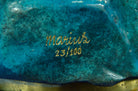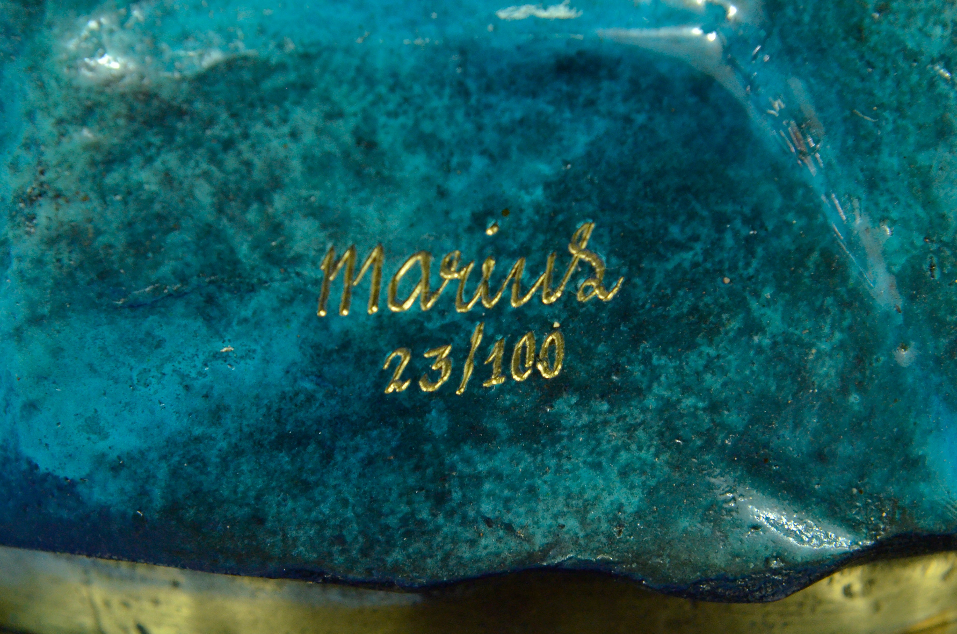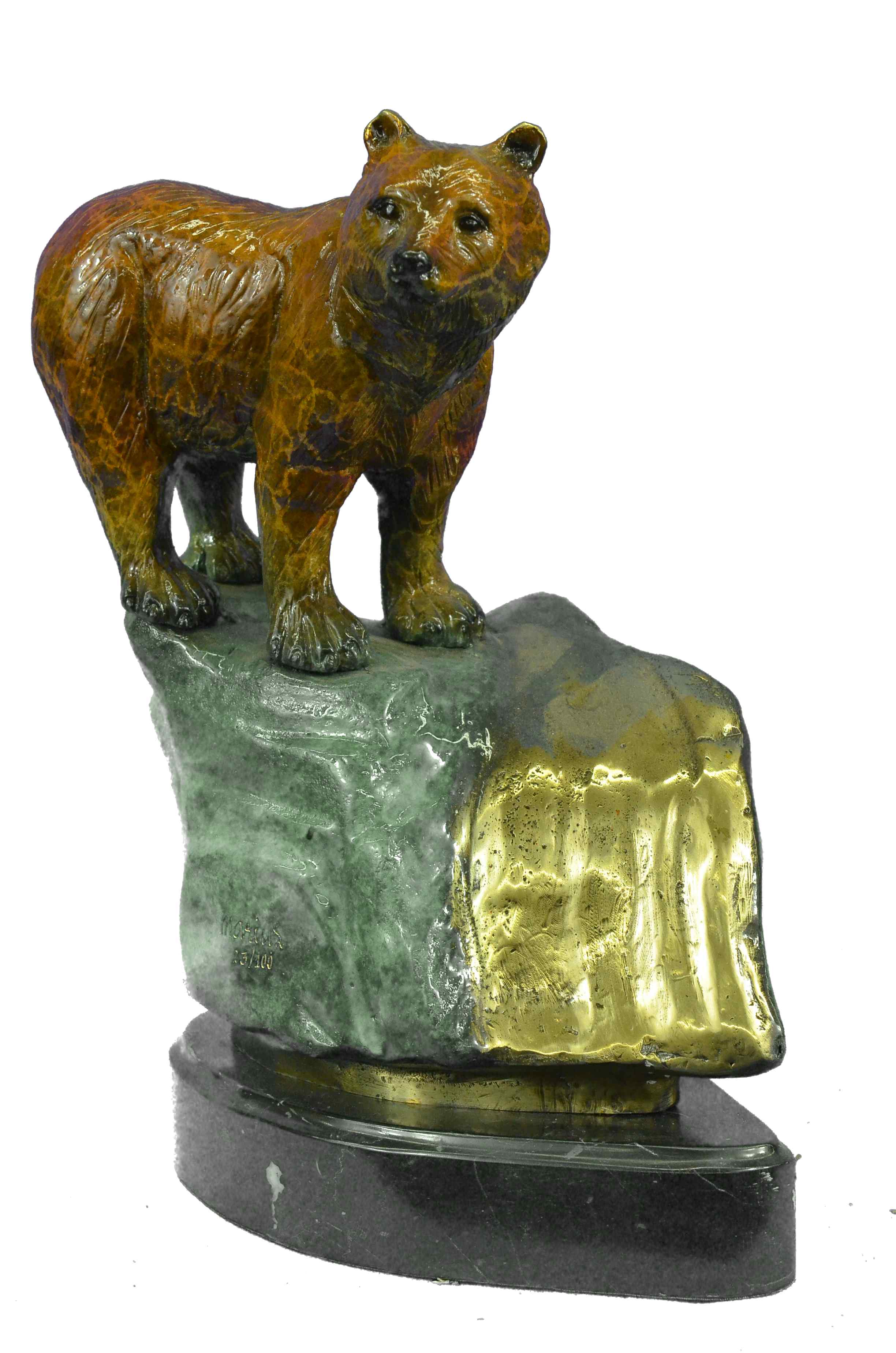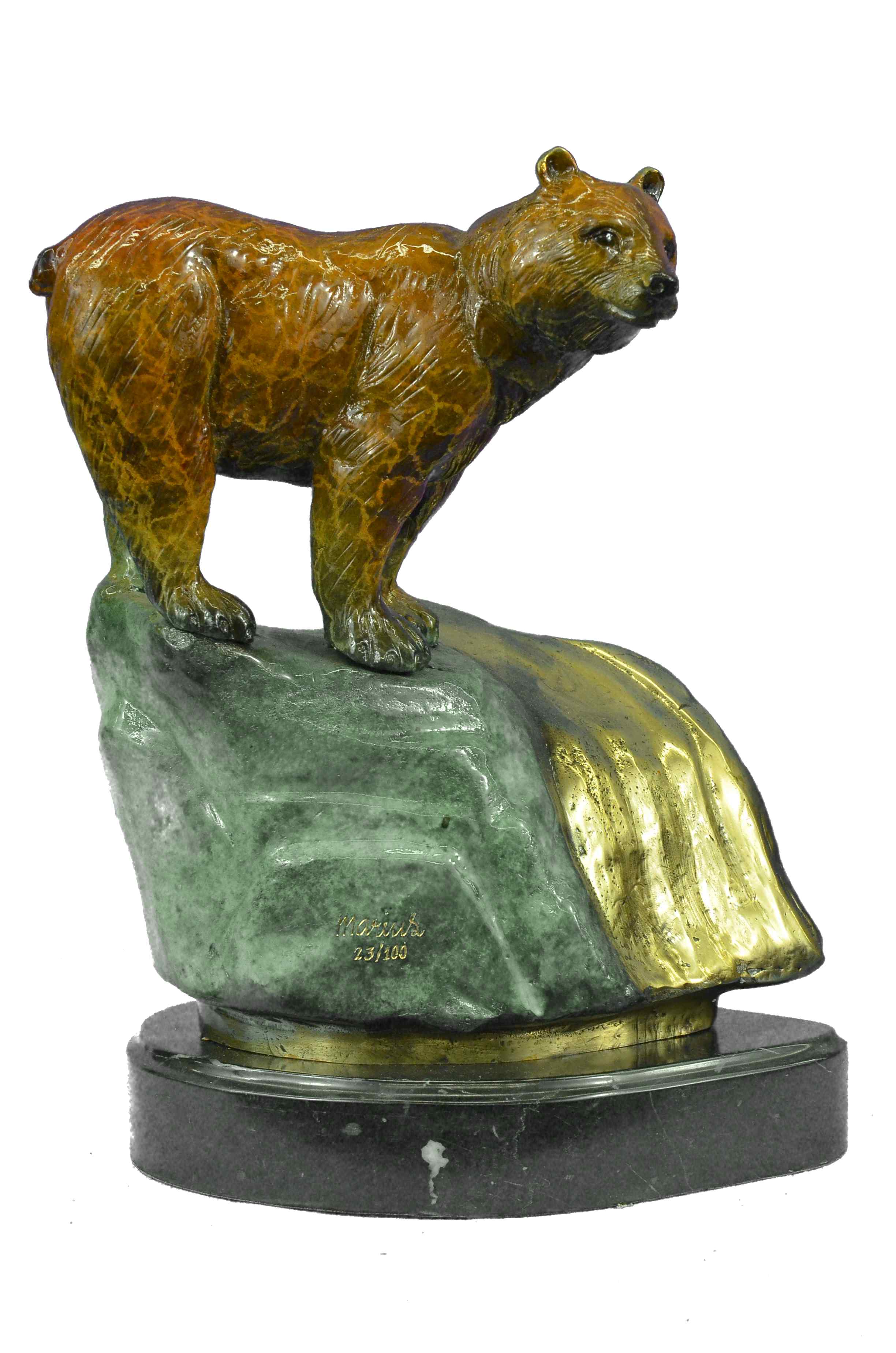 This sculpture is that of a Bear, one of which stands strong against the elements and high on safe ground. He looks out across the land, pondering his next path. Next to him runs a river that cascades downwards past him, most likely full of fish and a common place for Bears to feed themselves and their young. The ground he stands on is blue and likely frozen, and rests on a marble stand. He has a thick coat of a light brown Patina that is detailed to undoubtedly represent a thick coat of fur. This is a part of a collection with two other Bear pieces. This bronze sculpture was cast using the "Lost Wax Method" and has a special Patina and is signed and numbered by the artist Marius.Original or Reproduction: Original
