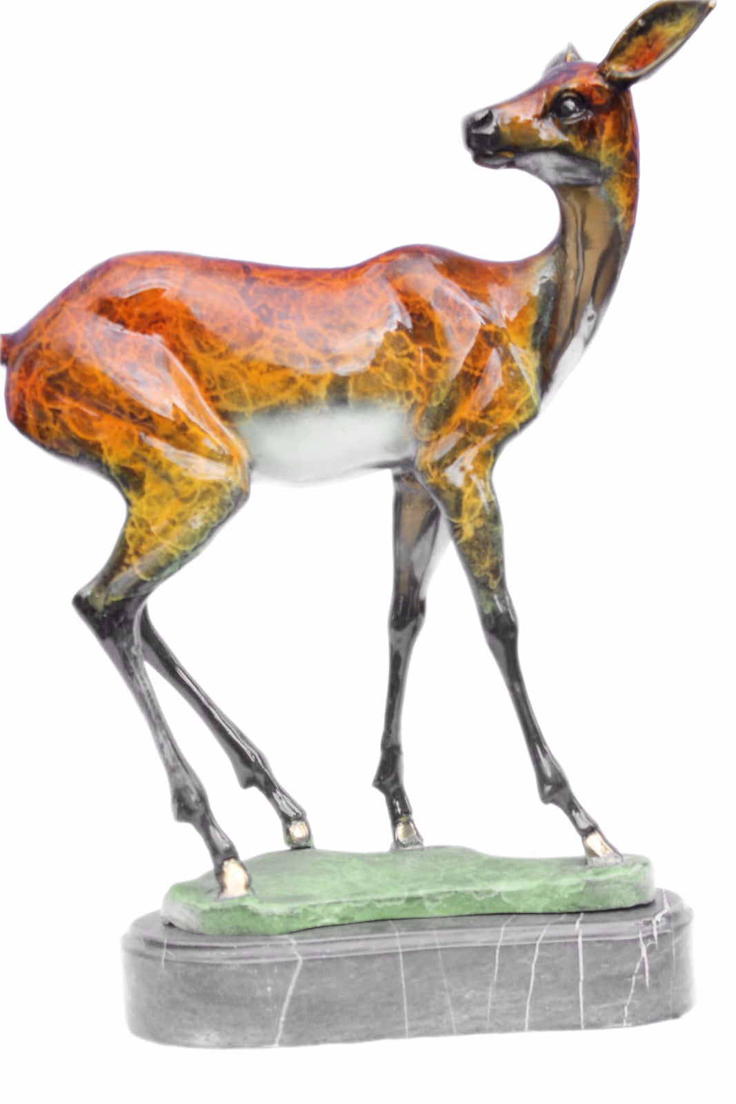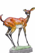 This young fawn lifts his head in the middle of his grazing and lifts his ears up in alertness. He pauses and takes a second to look around and check out his surroundings. You can tell he is growing and he is going through that awkward phase where his legs are growing longer and then his body will fill out as well as his head. His ears are large and suite his sweet little face and his big soft eyes. His tail is up in the air and his hind legs have great muscle definition. His legs are long and lanky but sturdy and are colored with a soft silver patina as his hind is thick protected with thick muscle. This sculpture is sure to look great in any room or office! This bronze sculpture was cast using the "Lost Wax Method" and has a special hand painted patina consisting of a Multi Color and he is mounted on a black marble base and signed by Artist Marius.Original or Reproduction: Original